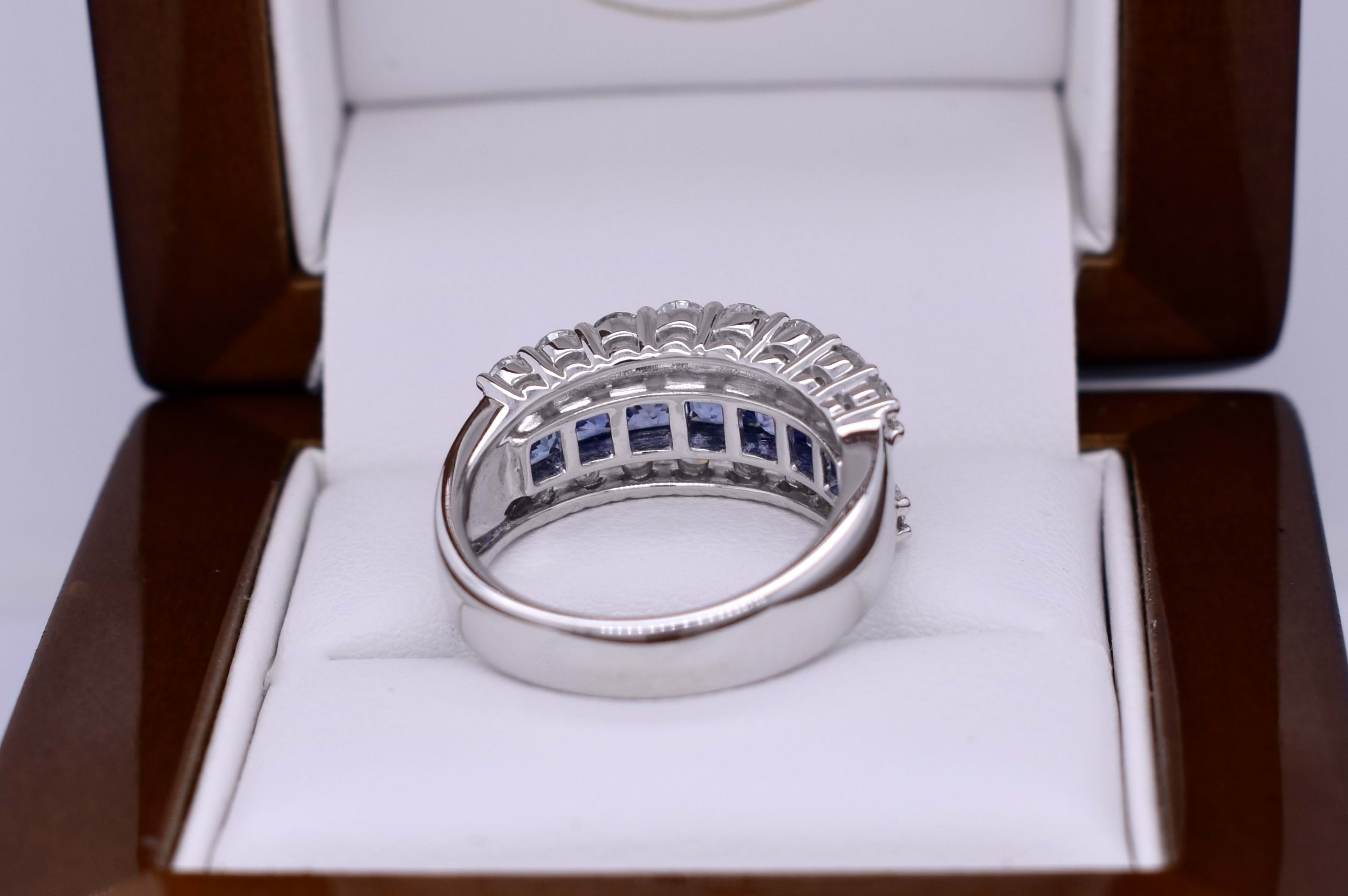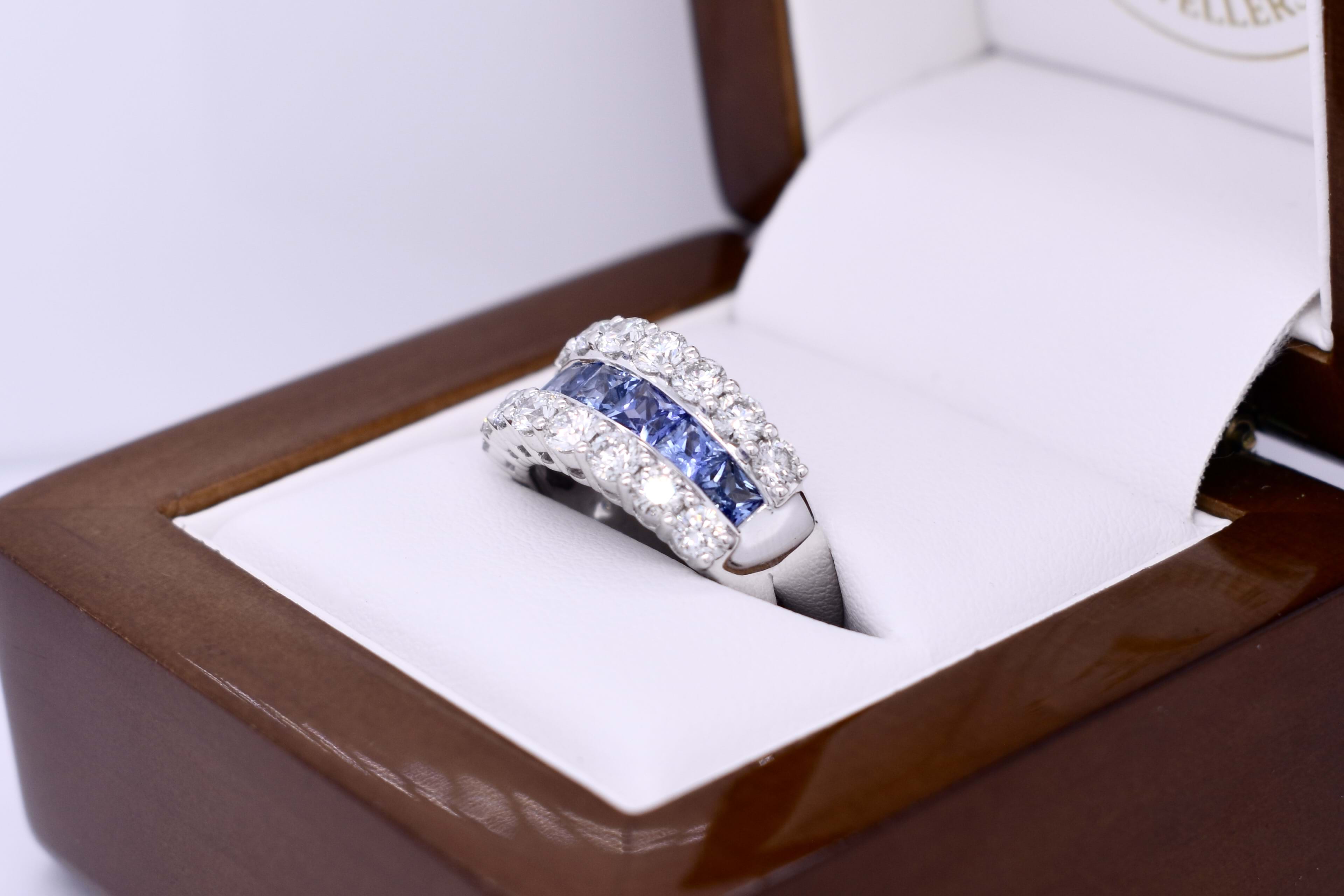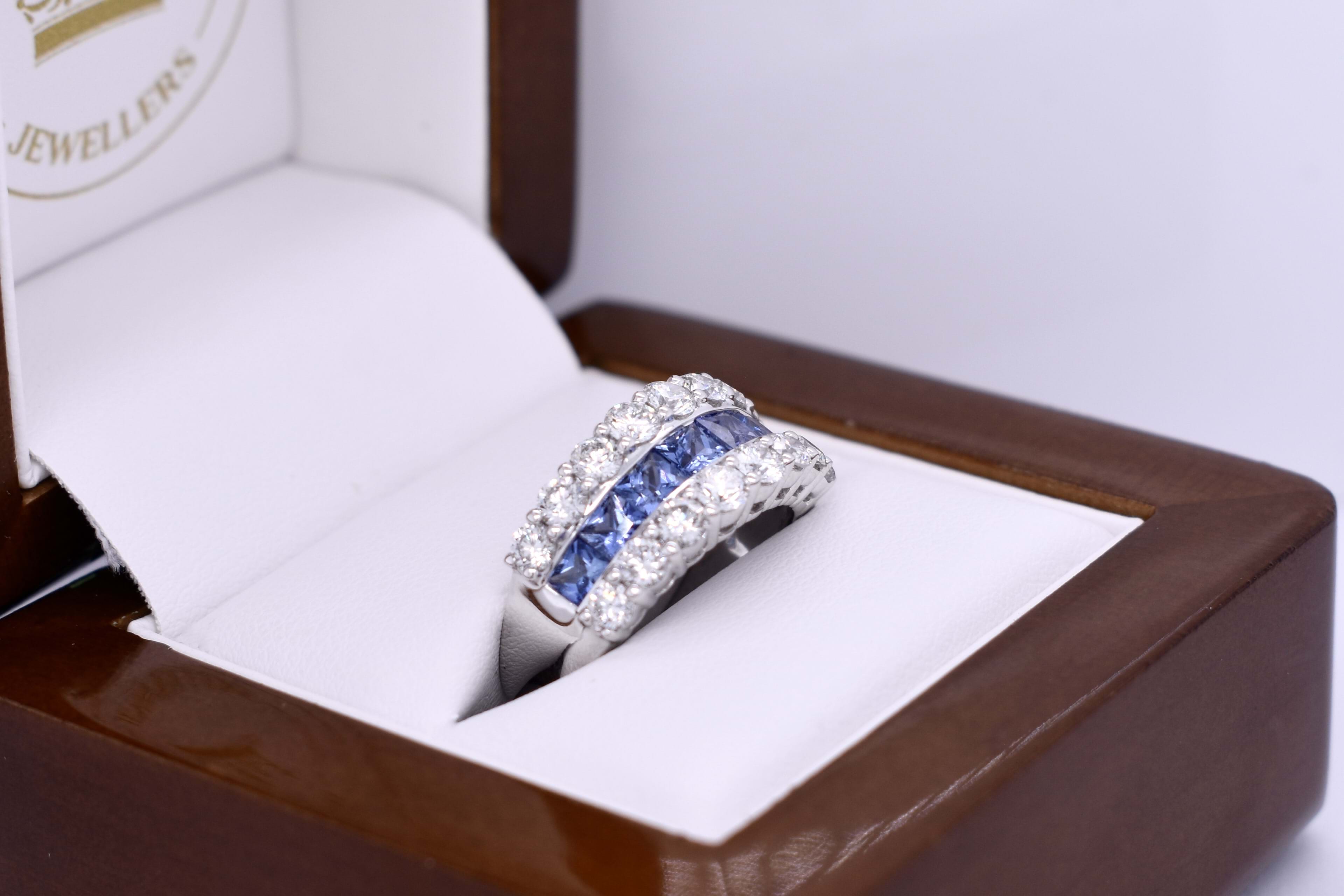 Spectacular 18ct white gold band, channel set with 7 eye clean Ceylon purplish blue princess cut 3.55-3.00mm diamonds in the centre, totalling 1.59ct. Lined with an upper and lower row of 2.90-2.65mm round brilliant cut diamonds. Shared claw set, equalling 1.59ct FG VS-SI. Completed on a tapering 9.75-4.18mm band. Finger size N+. Independent Valuation Supplied