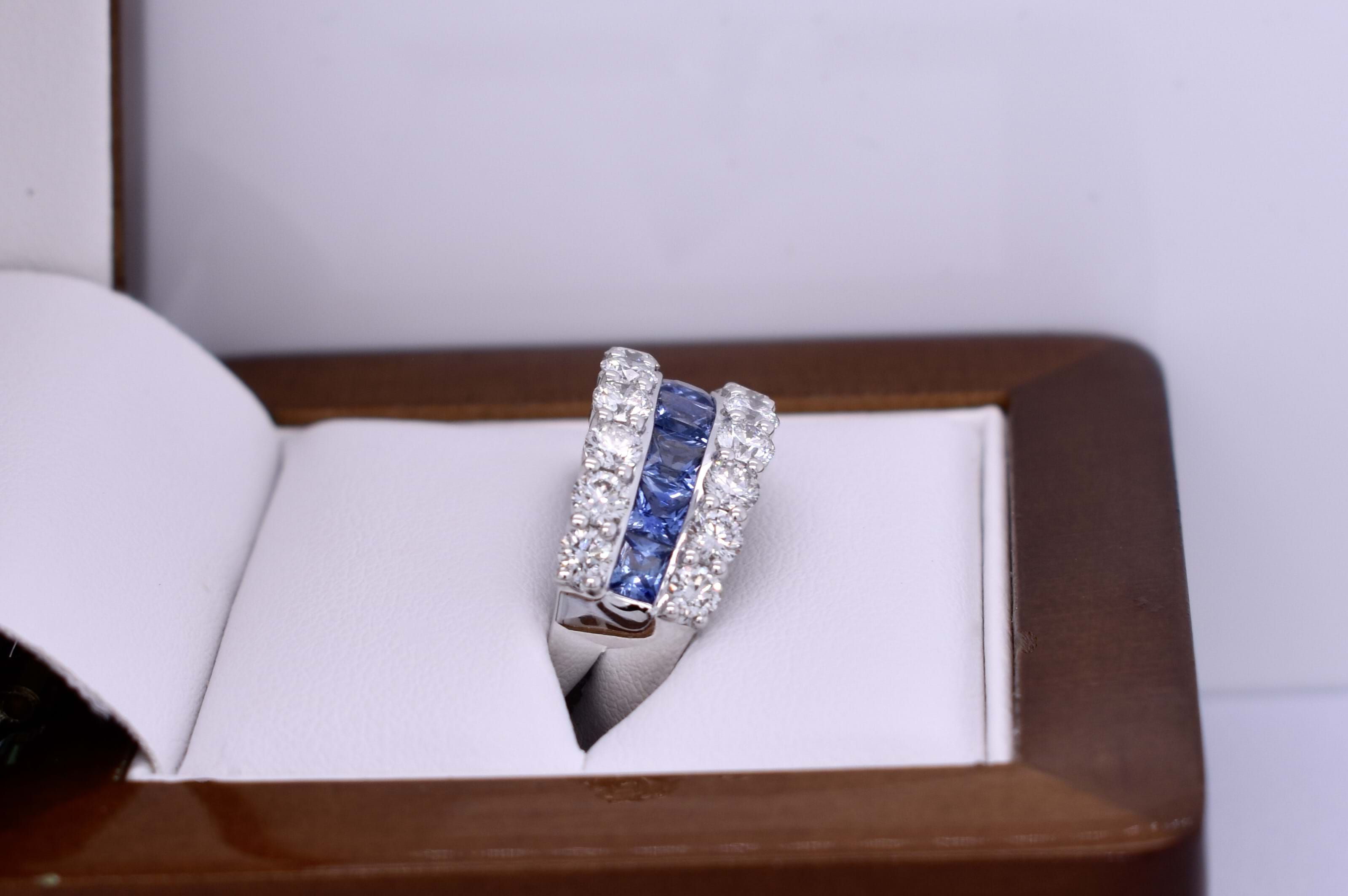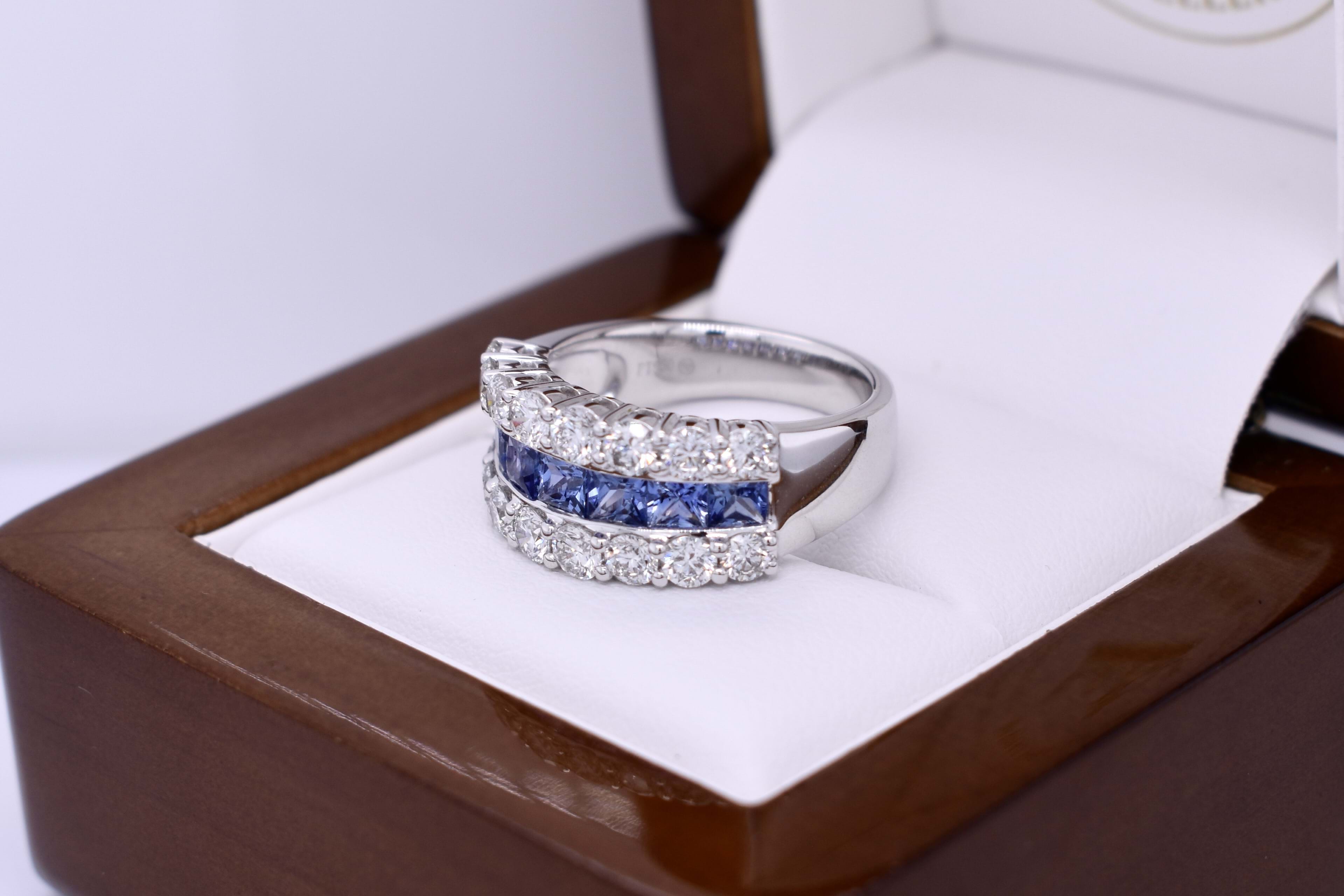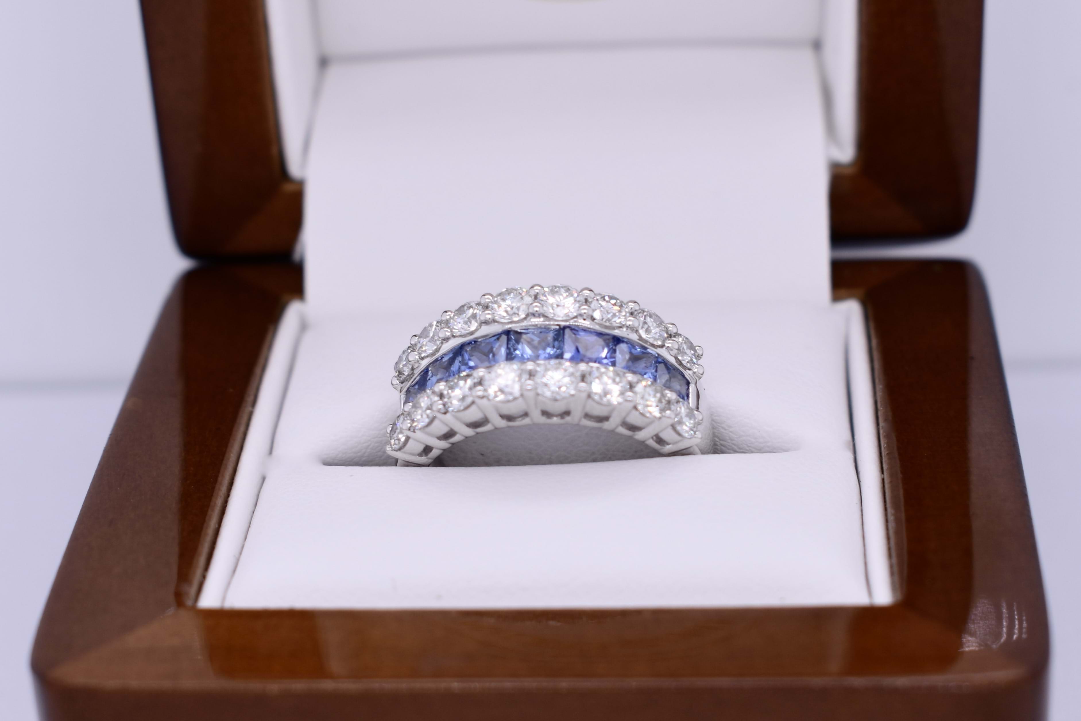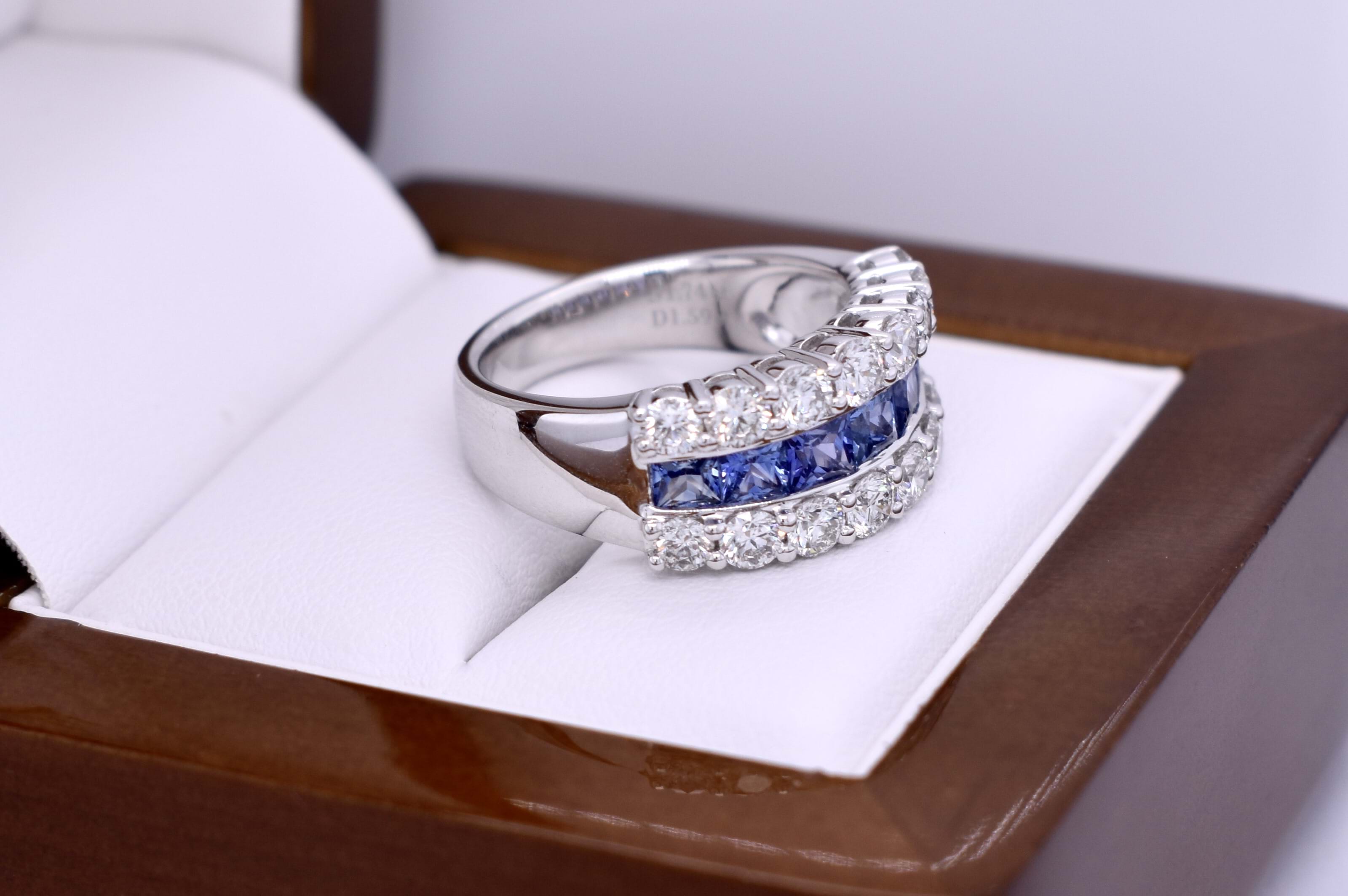 Spectacular 18ct white gold band, channel set with 7 eye clean Ceylon purplish blue princess cut 3.55-3.00mm diamonds in the centre, totalling 1.59ct. Lined with an upper and lower row of 2.90-2.65mm round brilliant cut diamonds. Shared claw set, equalling 1.59ct FG VS-SI. Completed on a tapering 9.75-4.18mm band. Finger size N+. Independent Valuation Supplied