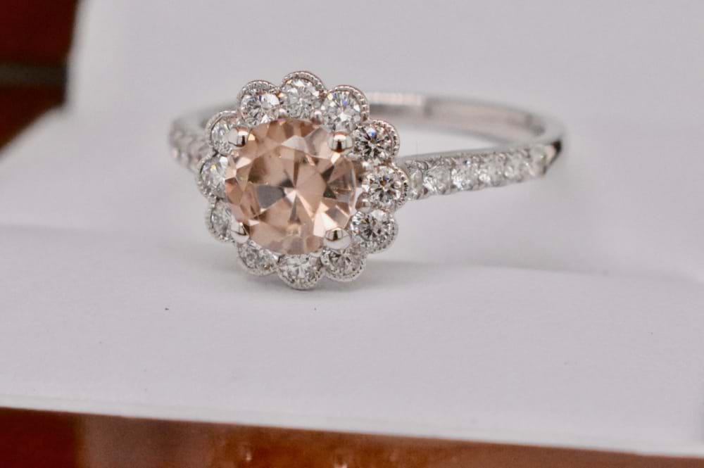 This stunning 1.21ct natural zircon has a beautiful blush champagne hue and makes an elegant and stylish centre piece for this feminine diamond engagement ring. Crafted in 18ct white gold with a scalloped halo of diamonds surrounding the zircon and continuing down the shoulders, totalling 0.56cts (G/SI). Size M1/2. Independent Valuation Supplied