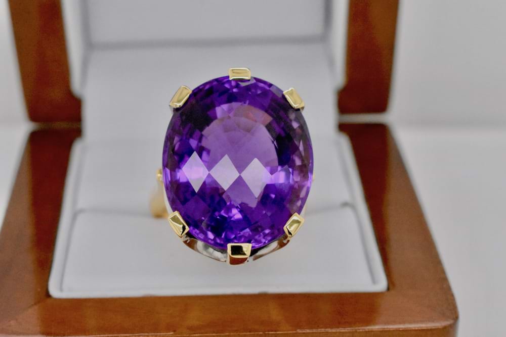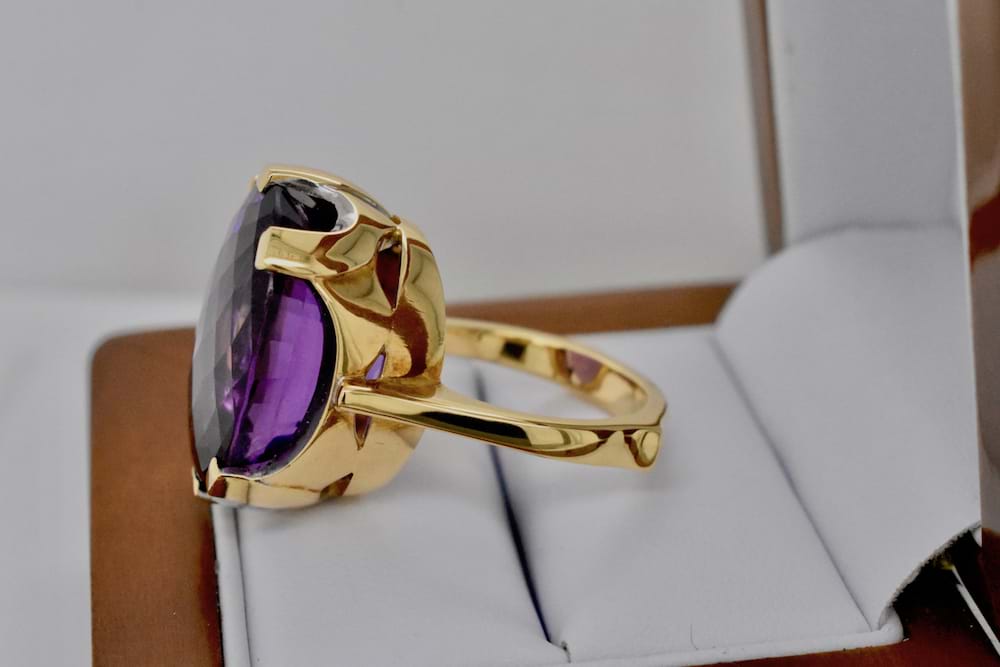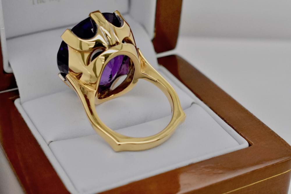 A beautifully handmade ring in 18ct yellow gold containing a 34.42ct Amethyst, held in by six claws. Independent Valuation supplied. Finger Q+