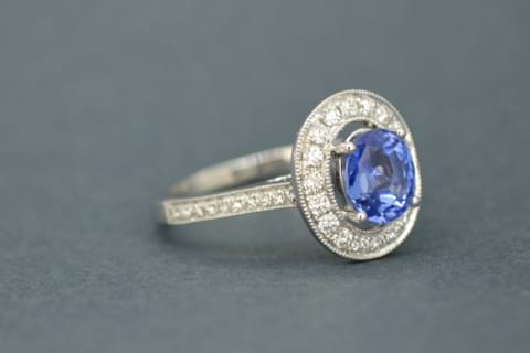 A crisp and clean cornflower blue Ceylon sapphire of 1.63ct surrounded by a halo of scintilating white diamonds and more set down the band past the finger line to give the impression that the diamonds are endless. In 18ct white gold and with a total of 0.45cts of diamonds this stunning ring is both classic and contemporary and is sure to bring a smile to the face of every girl. Independent Valuation Supplied