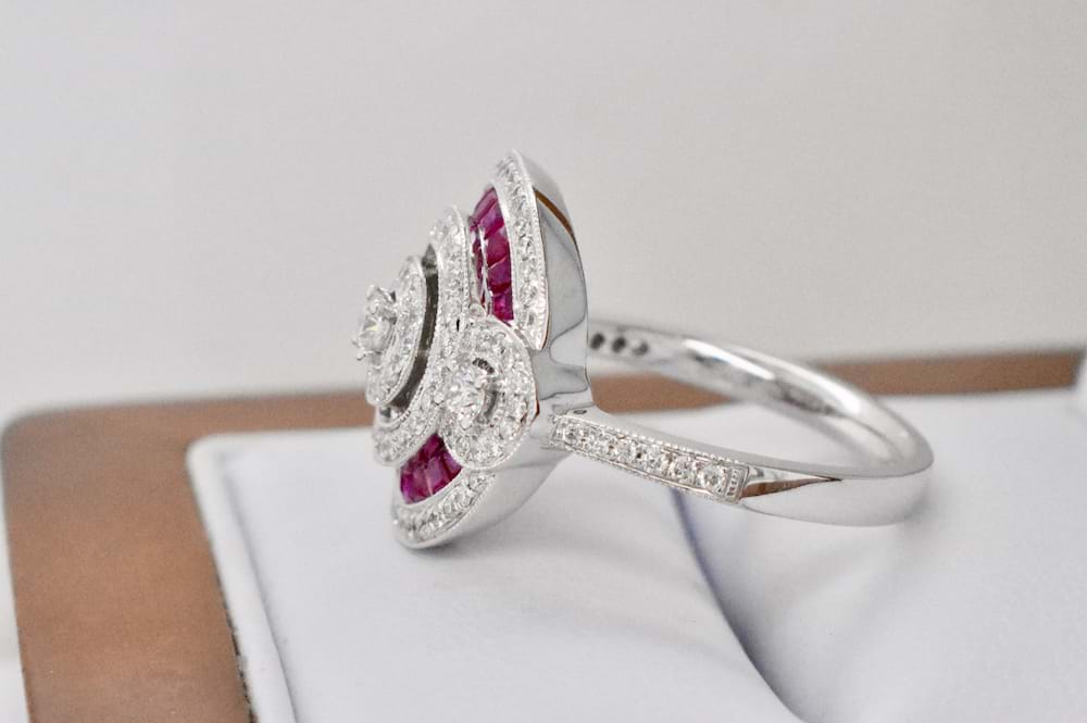 A modern take on an Art Deco design in 18ct white gold featuring 0.62cts of Rubies and 0.70cts (G/VS-SI) of sparkling white Diamonds. Independent Valuation supplied.