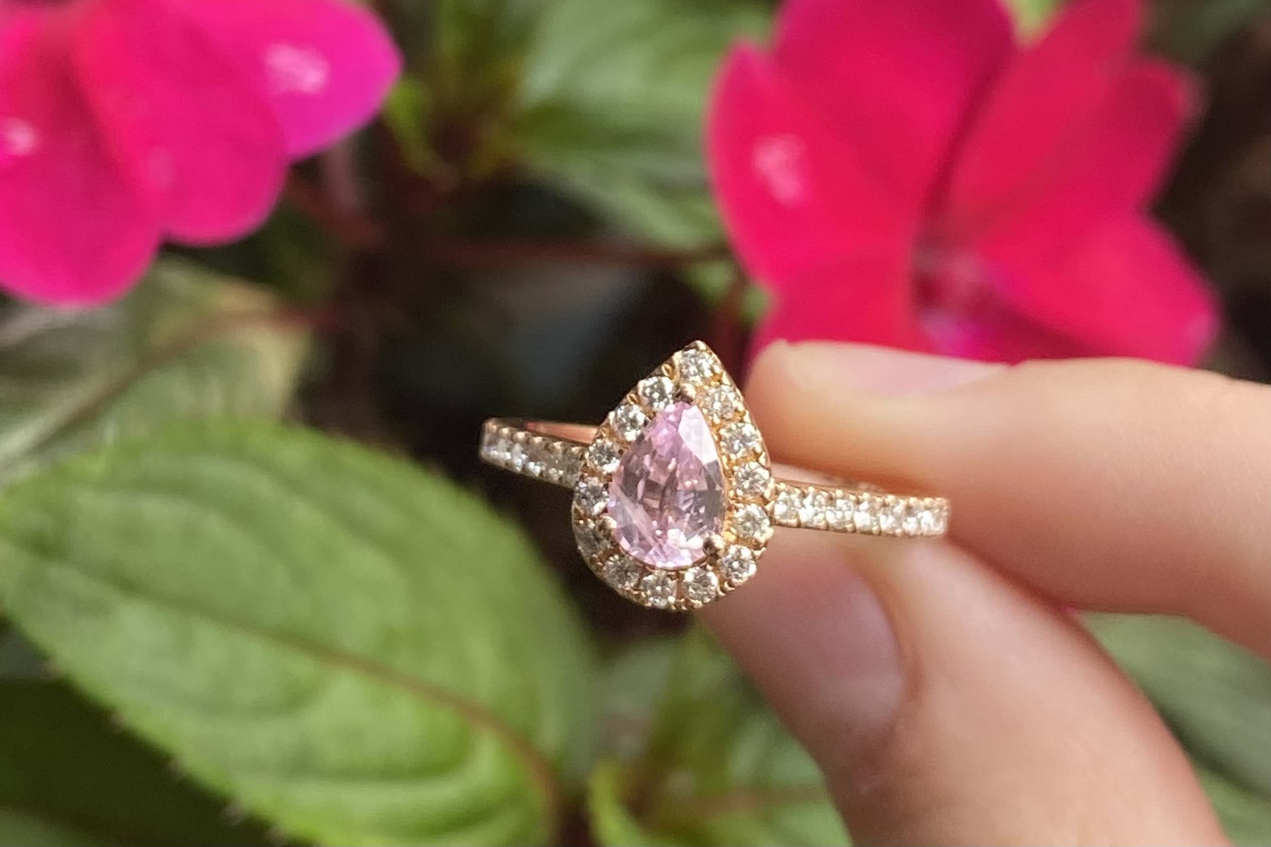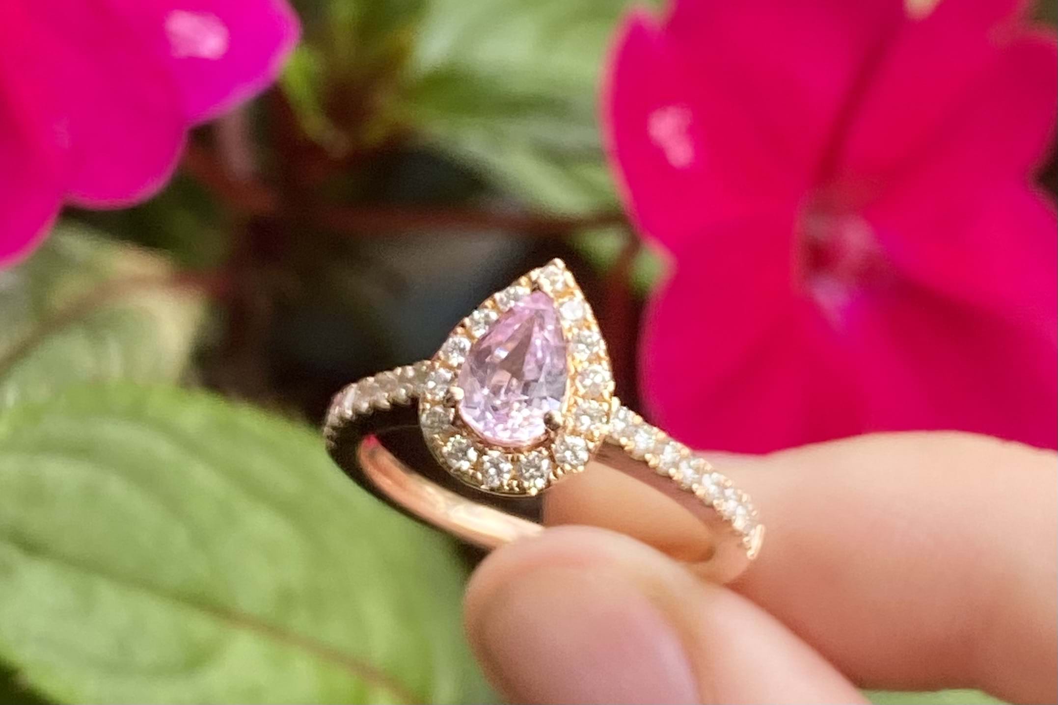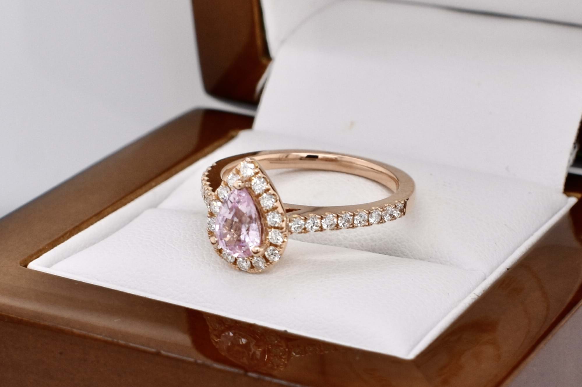 SOLD 18ct Rose Gold 0.84ct Light Pink Sapphire & 0.43ct Diamond Pear Shaped Ring (N+)