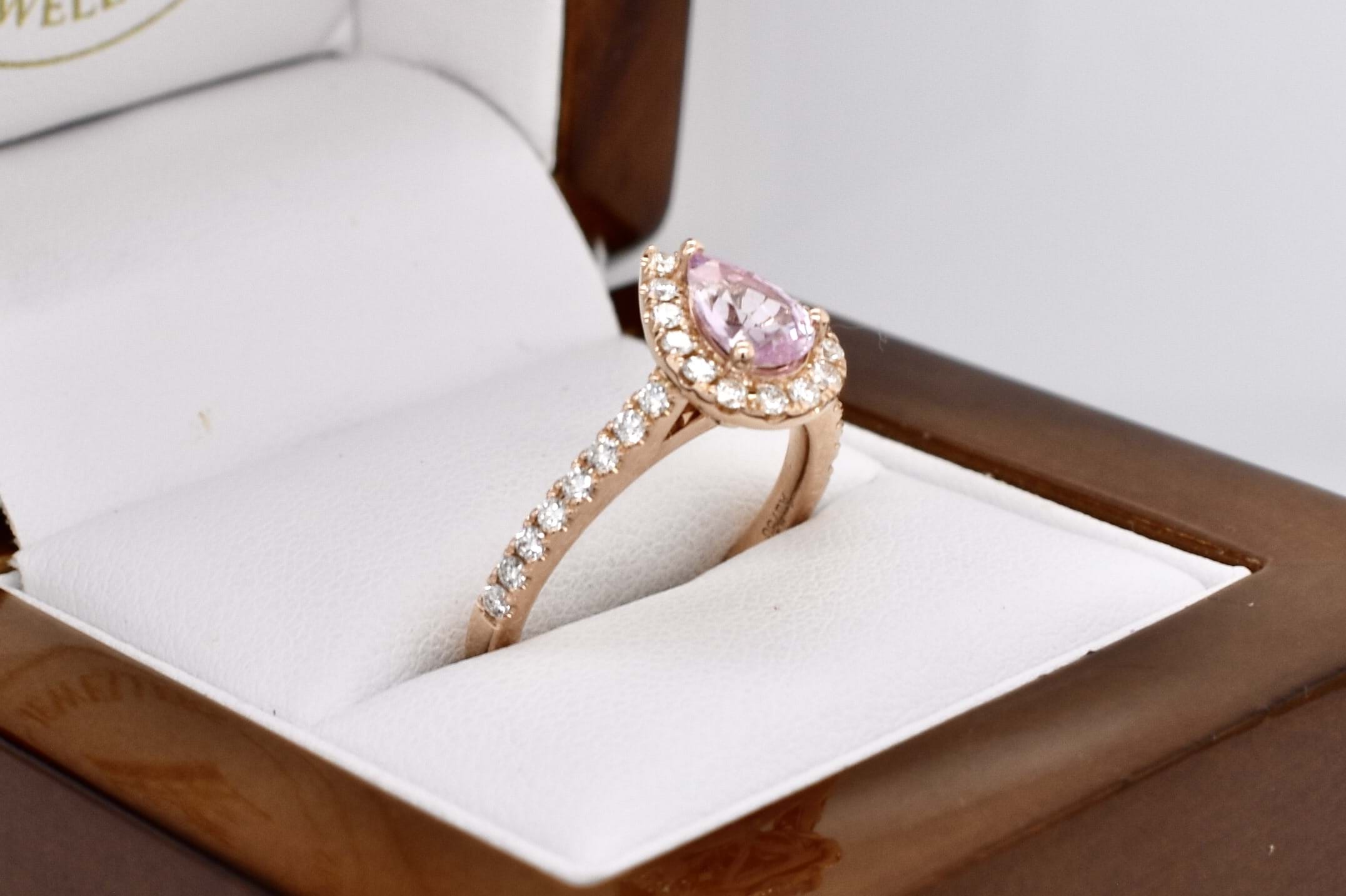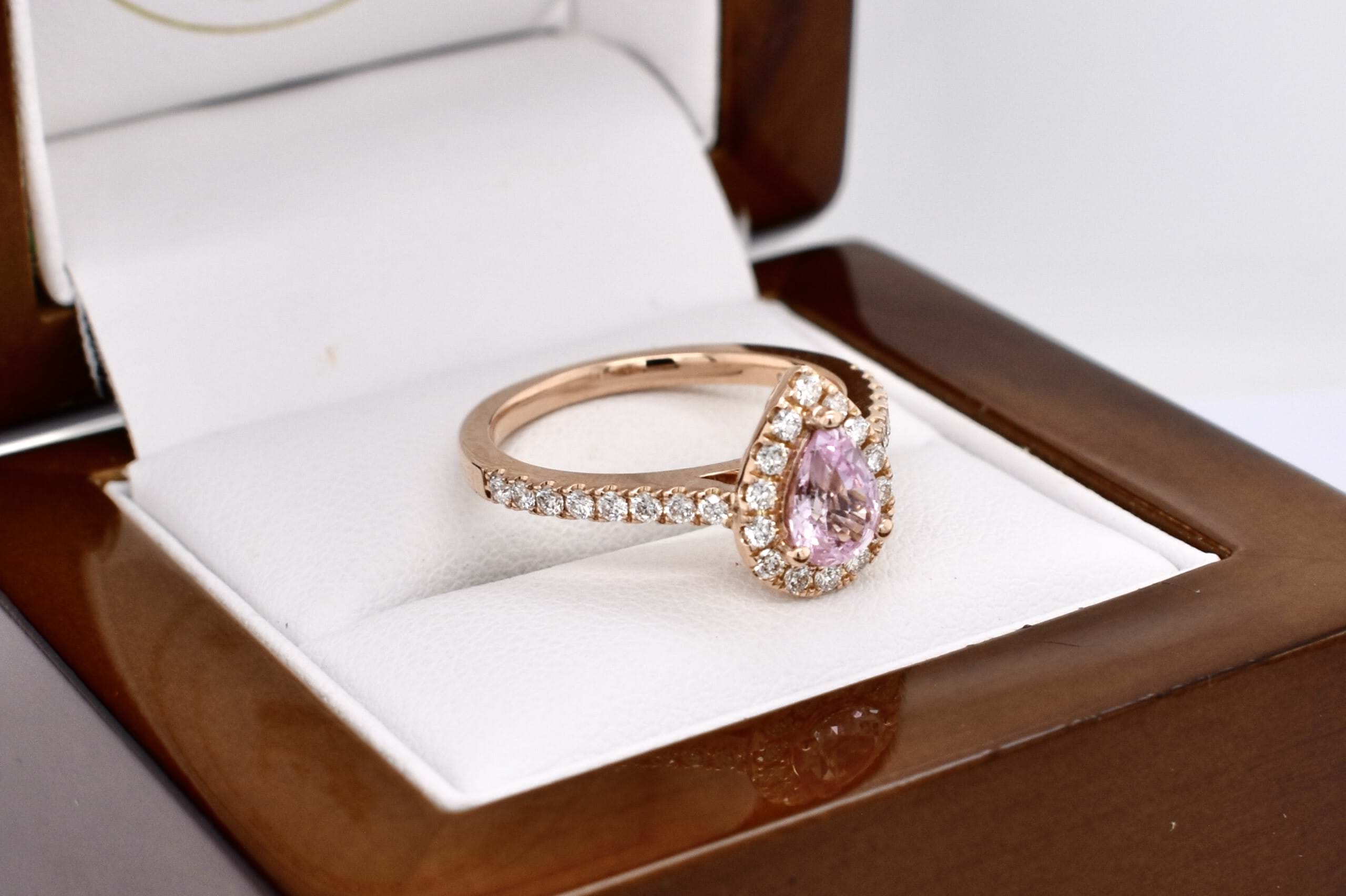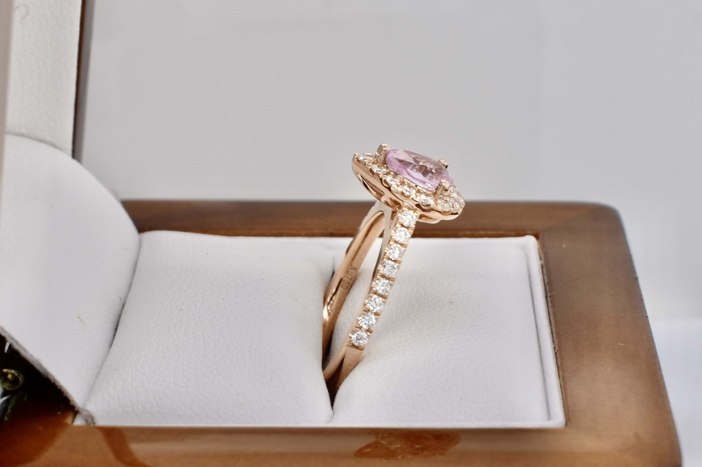 Stunning 18ct rose gold ring, featuring a centre pear shaped light pink sapphire of 0.84ct, measuring 7.30x4.75x3.10mm, surrounded by a diamond halo as well as diamonds down the shoulders of the band, with 30 round brilliant cut diamonds, measuring 1.50-1.40mm, totalling 0.43ct FG VS-SI. Finished on a soft edge flat 1.82mm band. Finger size N+. Independent Valuation Supplied.
