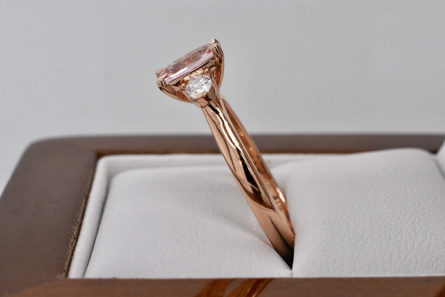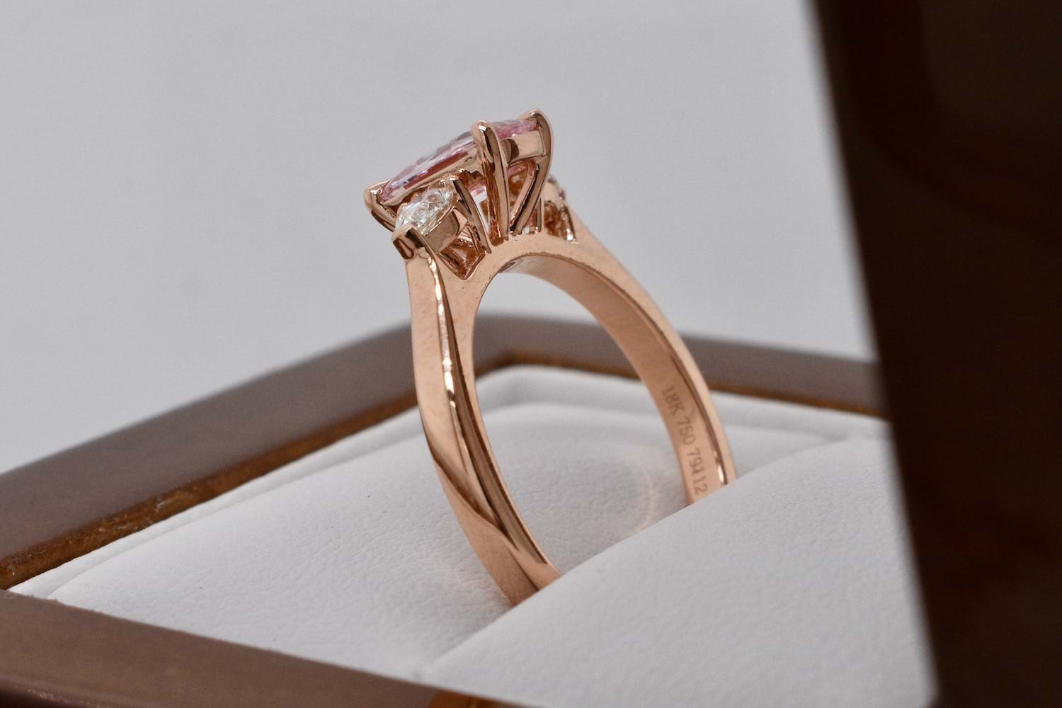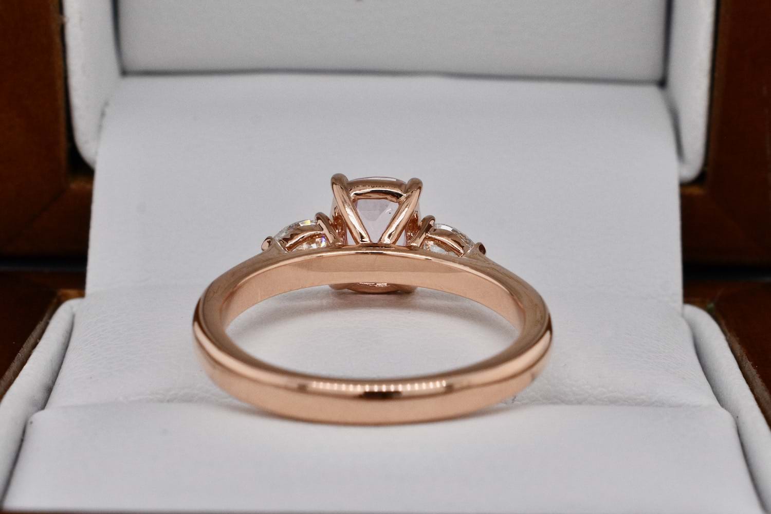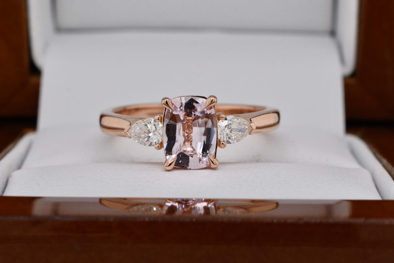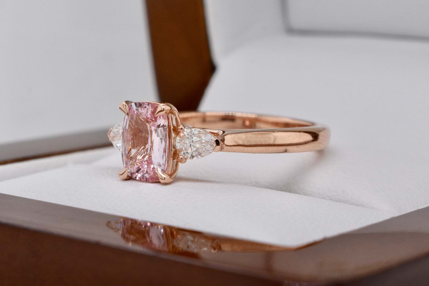 A spectacular bright, blush, pale pink sapphire weighing 1.04cts set into a simple and feminine 18ct rose gold ring with a scintillating pearshape diamond set on each side. The two pearshape diamonds total 0.28cts FG/VS-SI and are the perfect compliment and contrast to the pale pink sapphire. Ideal as a dress or engagement ring, it will sit alone or with bands. Finger size M. Independent Valuation Supplied