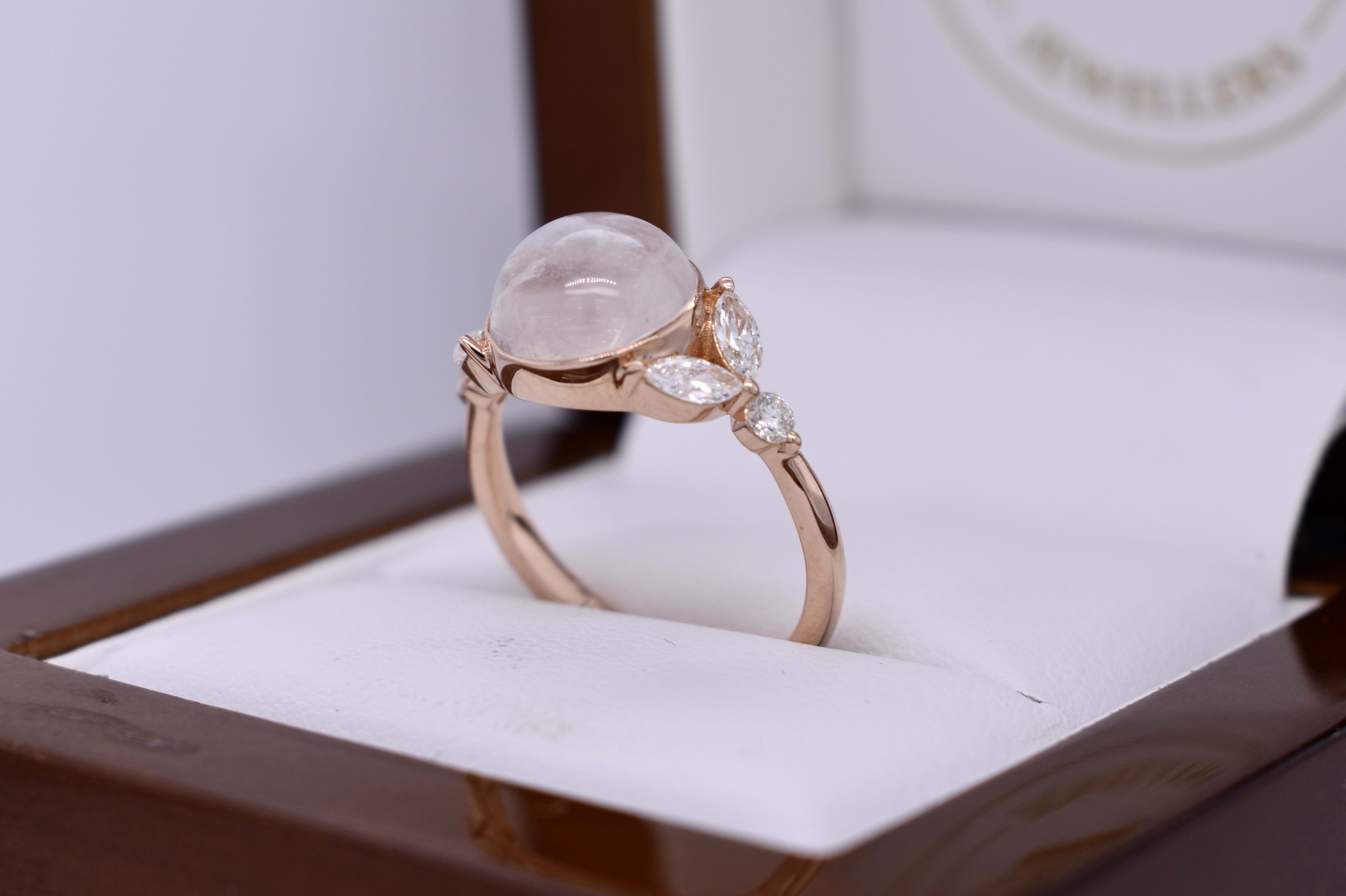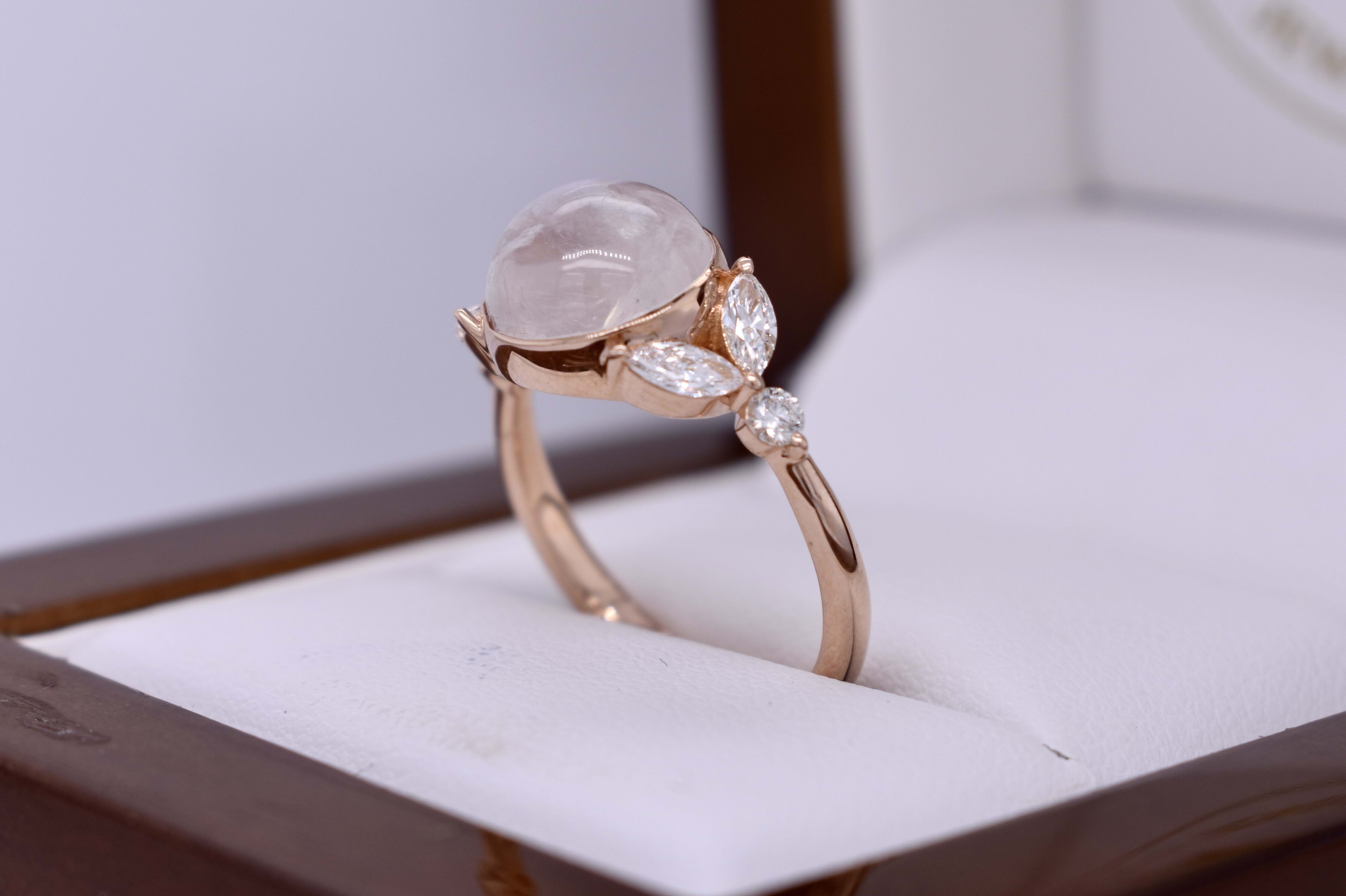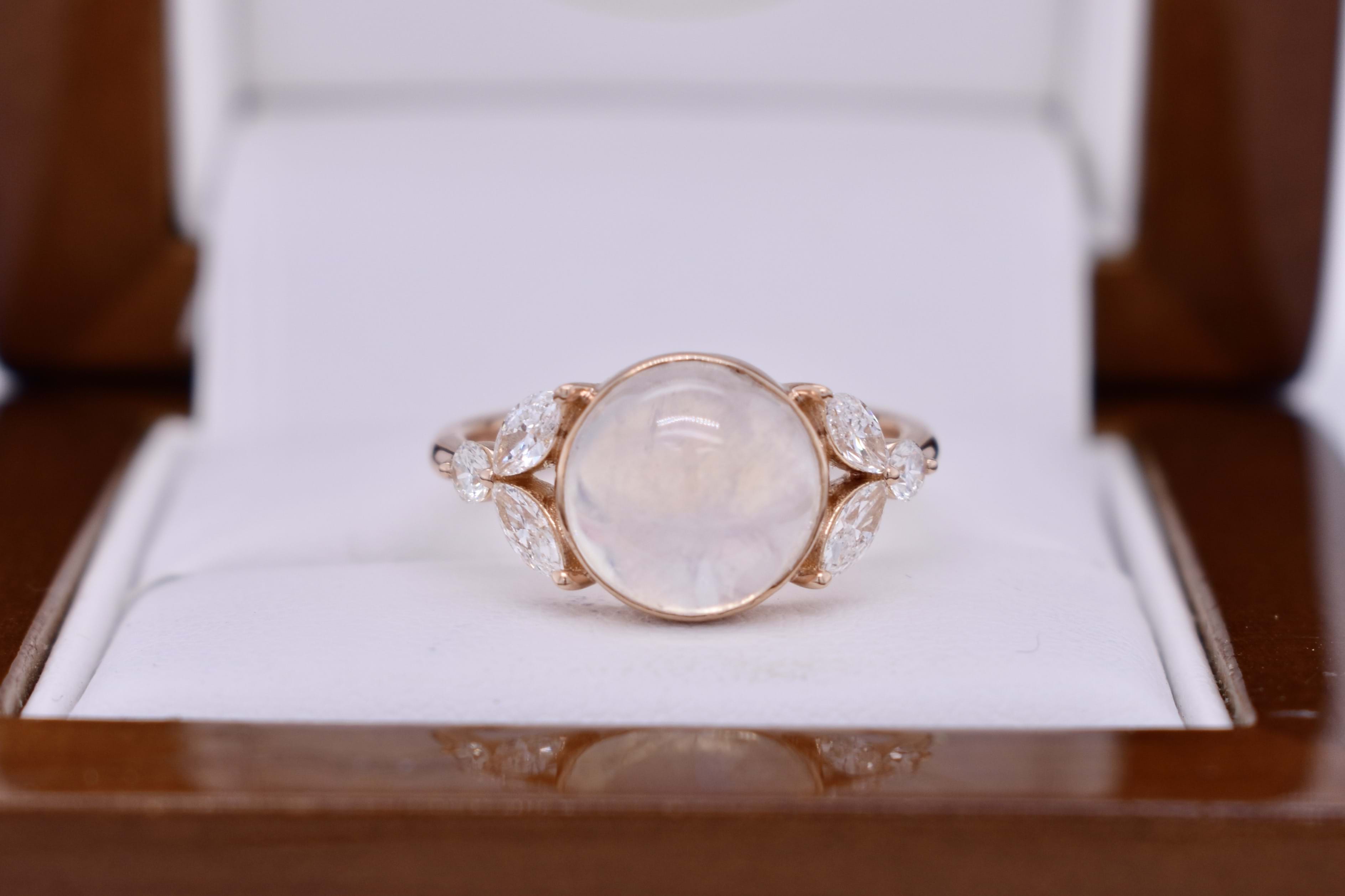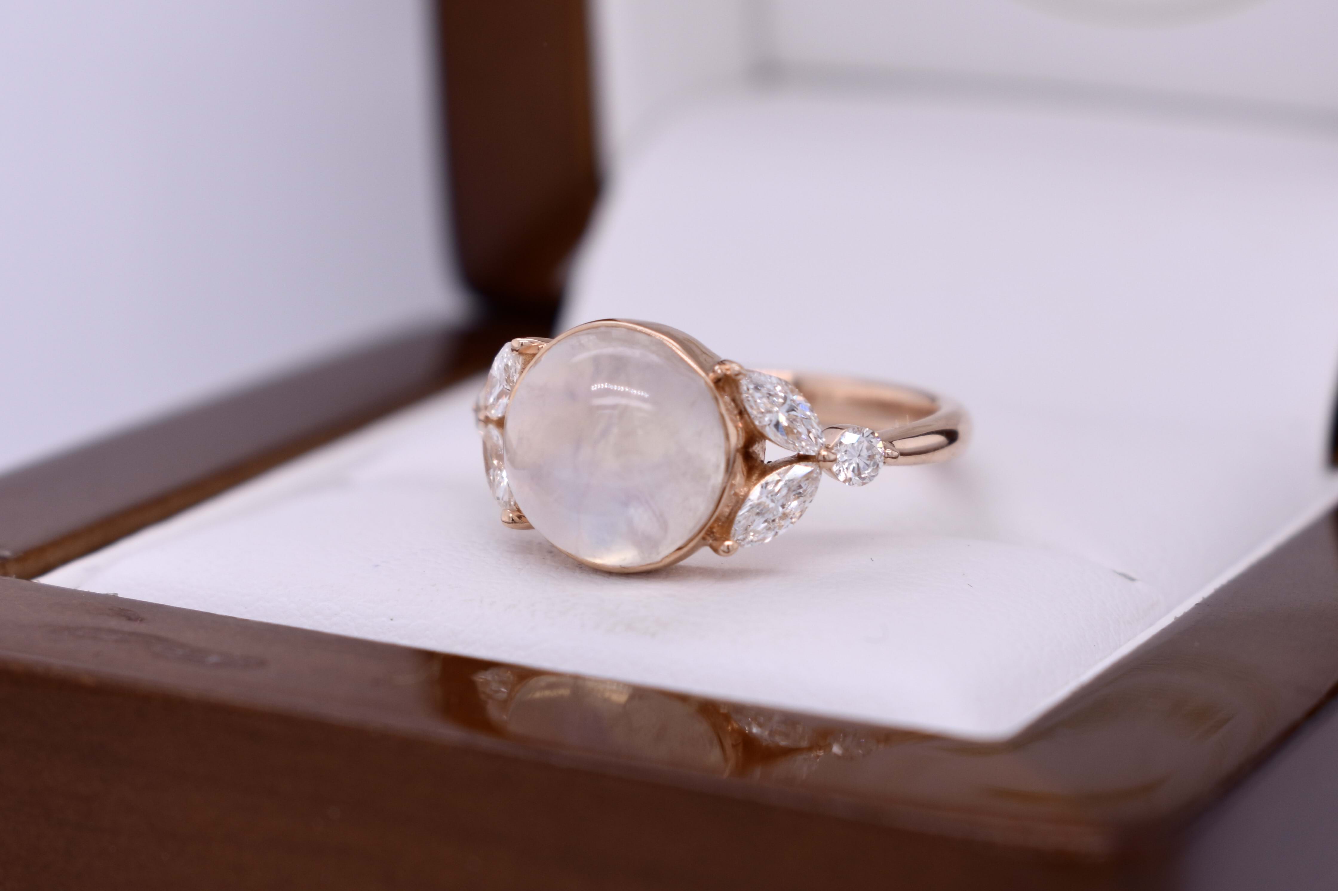 An alluring 18ct rose gold ring, featuring a cabochon round 9.55x9.55x6.07mm moonstone of 3.76ct, bezel set with leaf designed sides. Each side contains two marquise diamonds measuring 4.60x2.20mm, equalling 0.34ct G VS, with a round brilliant cut 2.30mm diamond each side, all claw set. Round diamonds totalling 0.11ct G VS. Completed on a half round 2.20mm band. Finger size L.