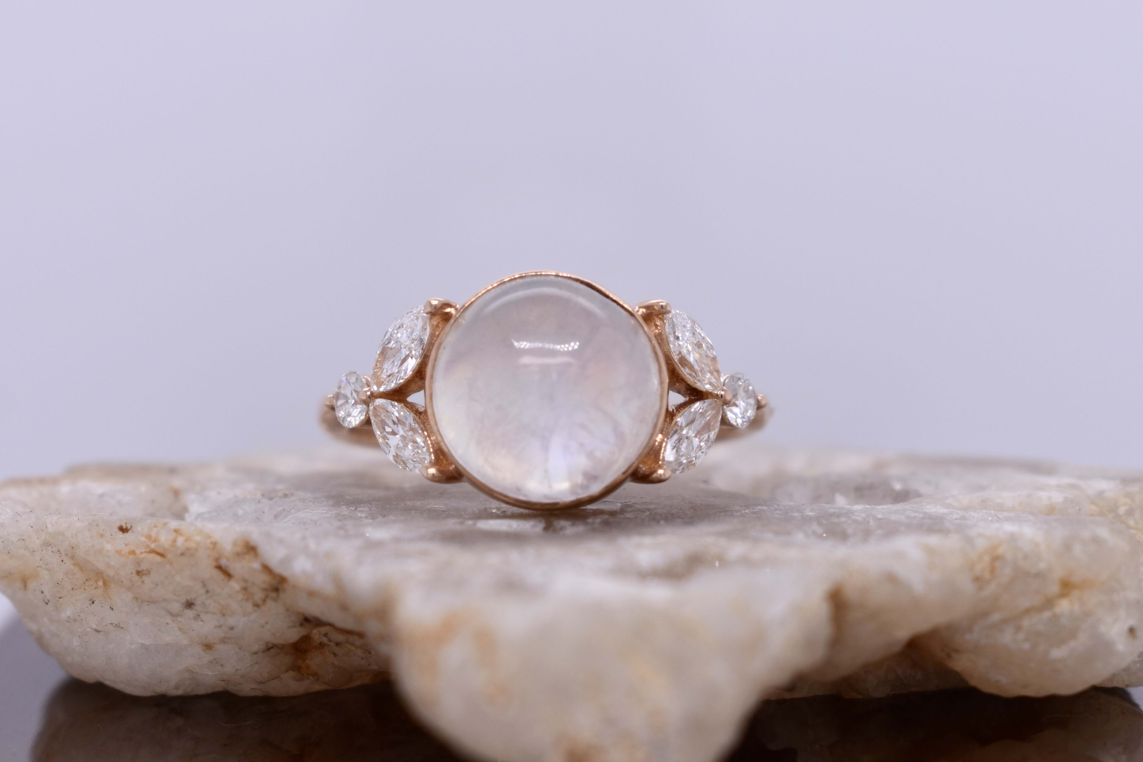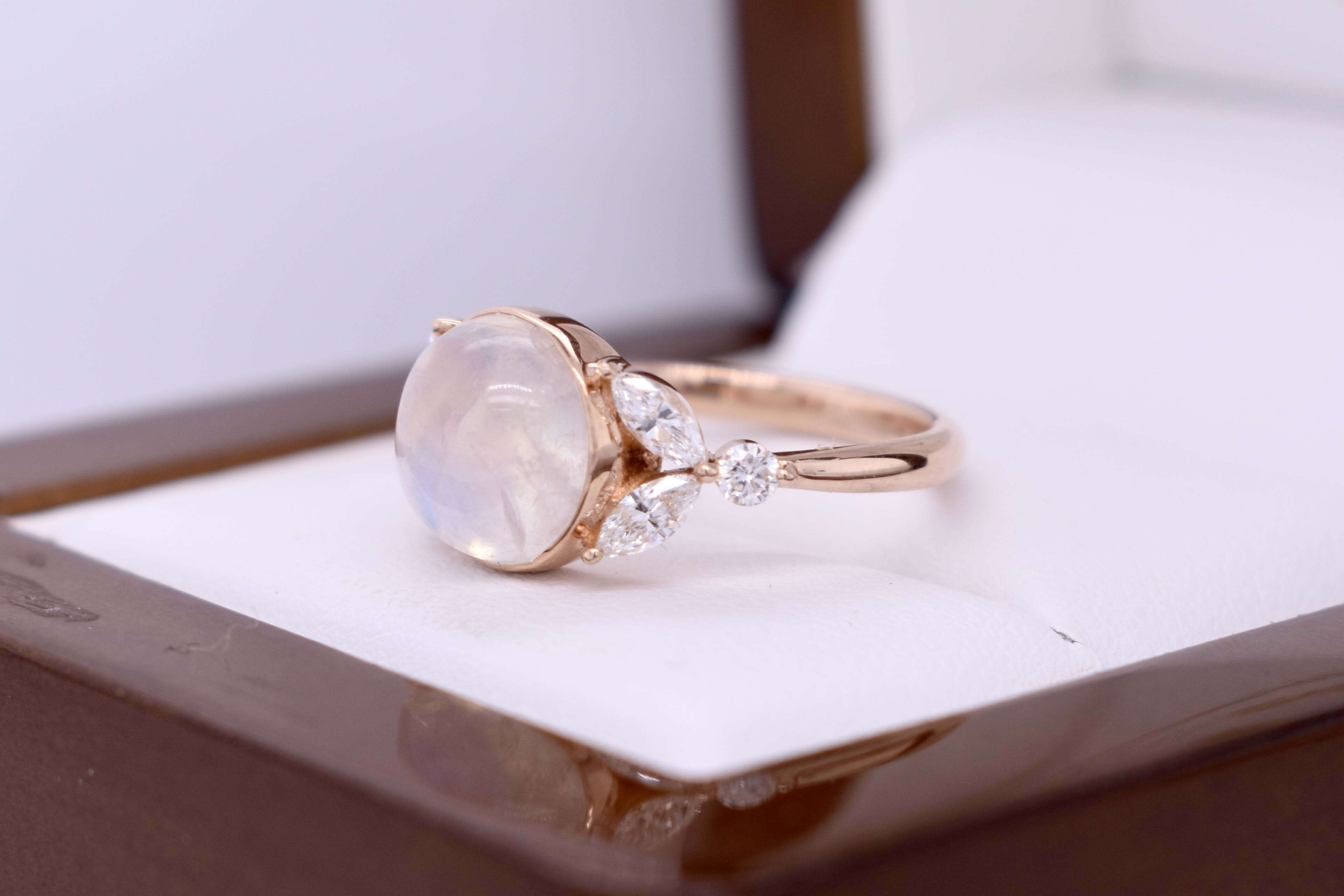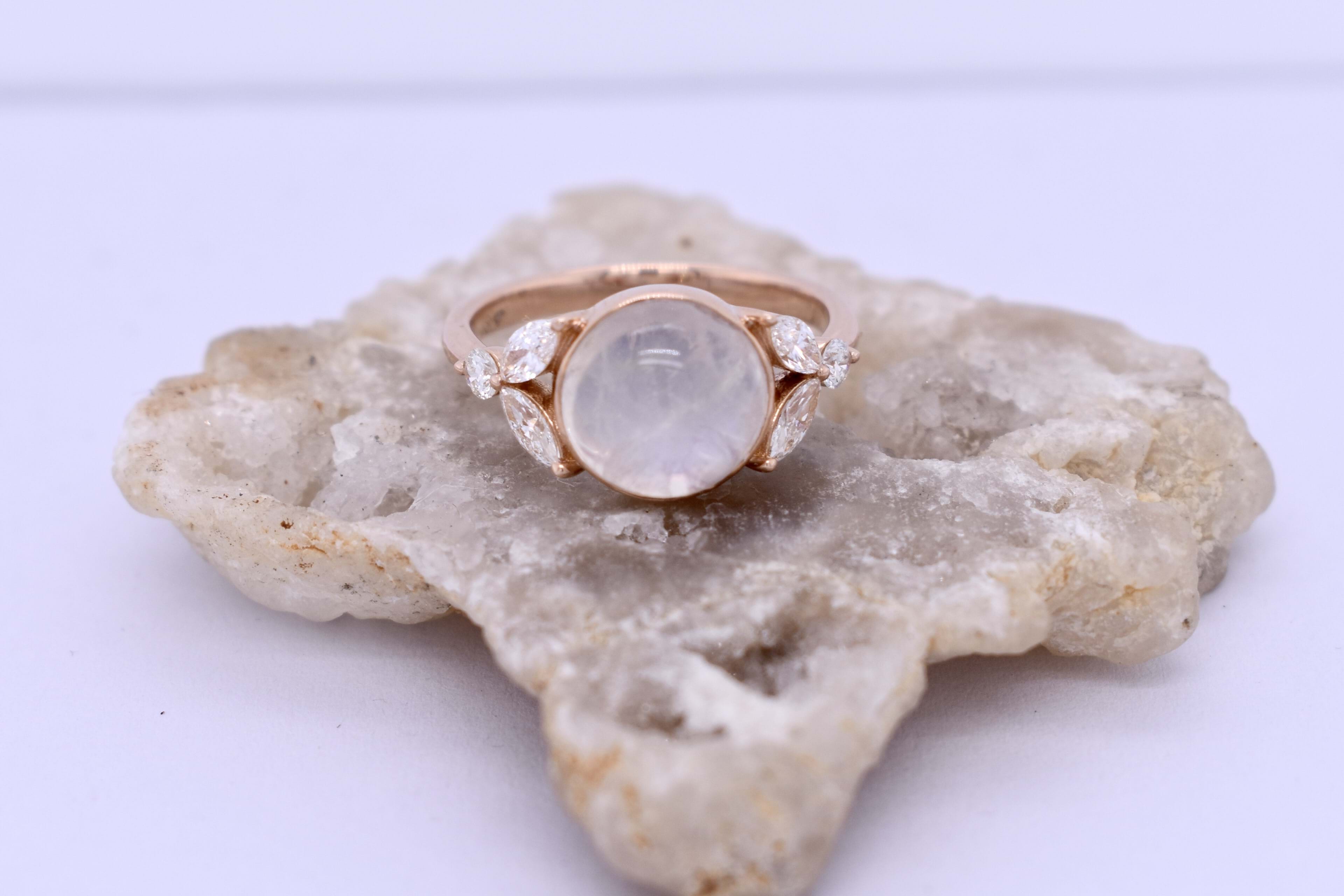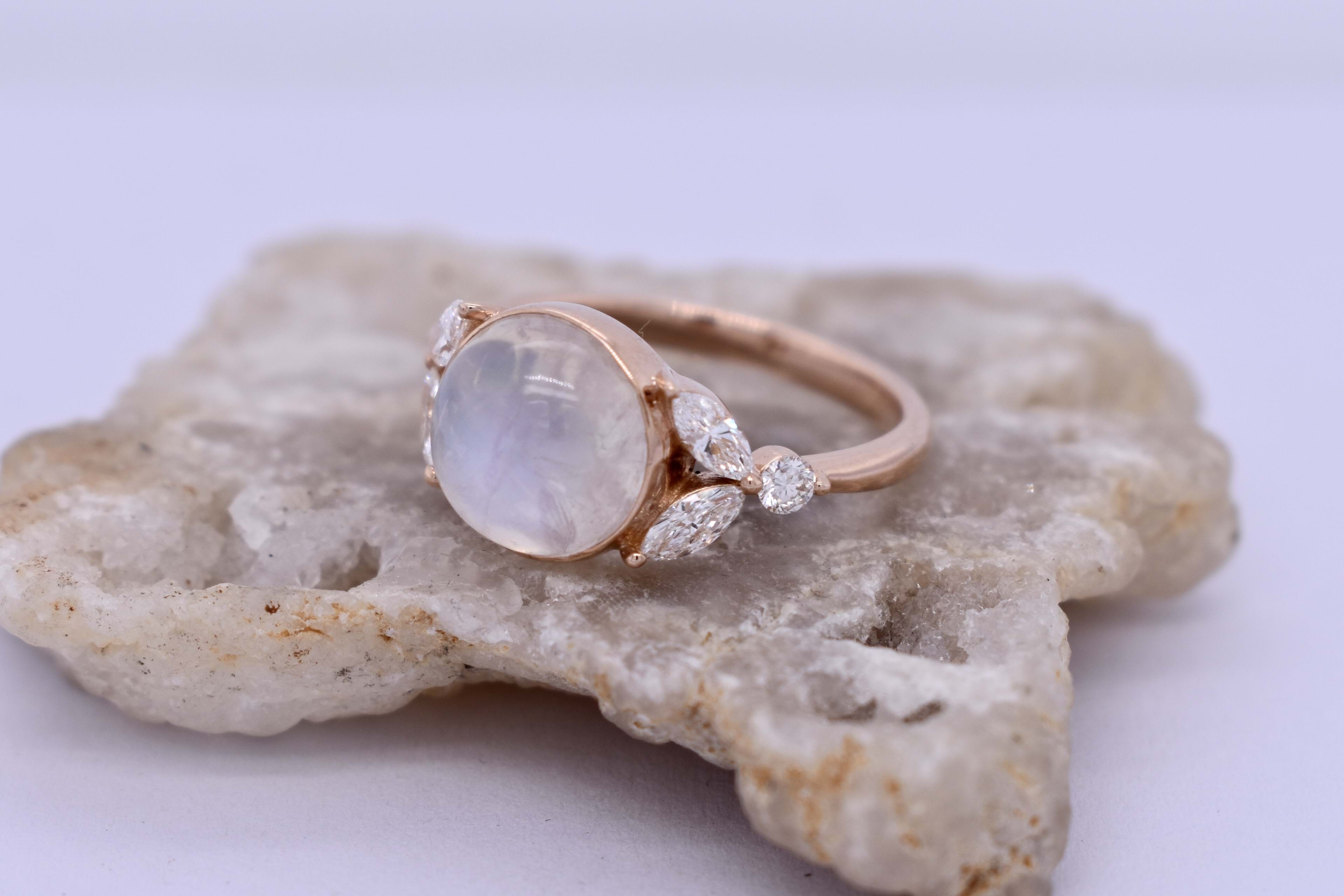 An alluring 18ct rose gold ring, featuring a cabochon round 9.55x9.55x6.07mm moonstone of 3.76ct, bezel set with leaf designed sides. Each side contains two marquise diamonds measuring 4.60x2.20mm, equalling 0.34ct G VS, with a round brilliant cut 2.30mm diamond each side, all claw set. Round diamonds totalling 0.11ct G VS. Completed on a half round 2.20mm band. Finger size L.