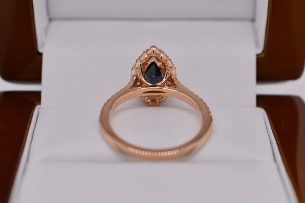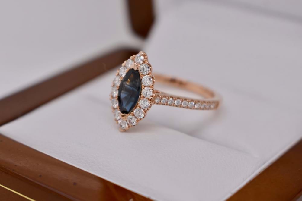 18ct rose gold ring set with a 0.98ct dark blue Australian marquise shape sapphire surrounded by a halo of white, round brilliant cut diamonds with diamonds also down the shoulders. Finger size M. Total of 34 diamonds = 0.54ct. Independent valuation supplied