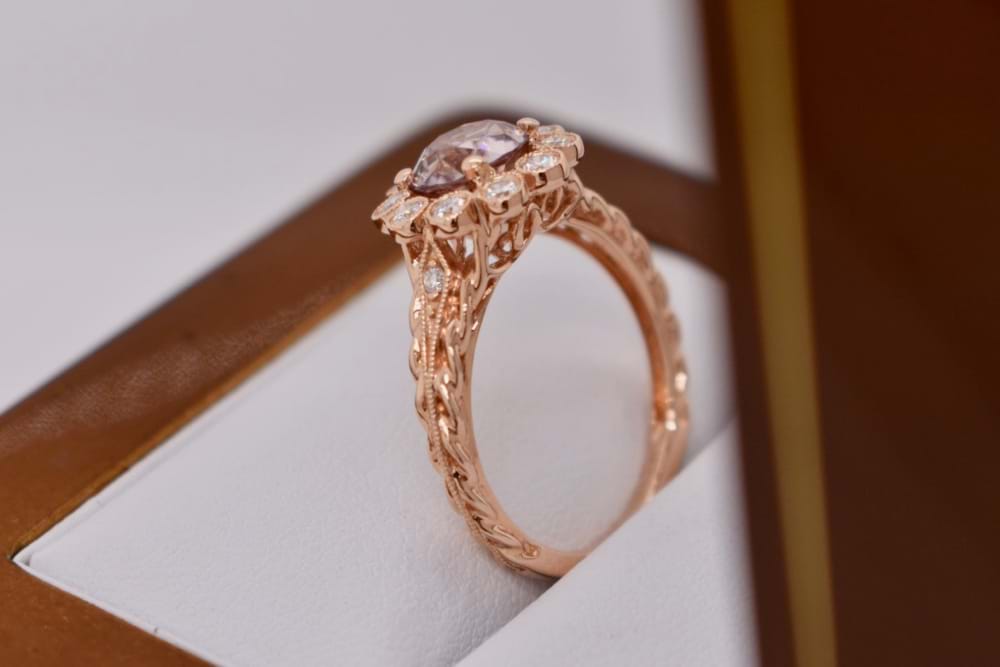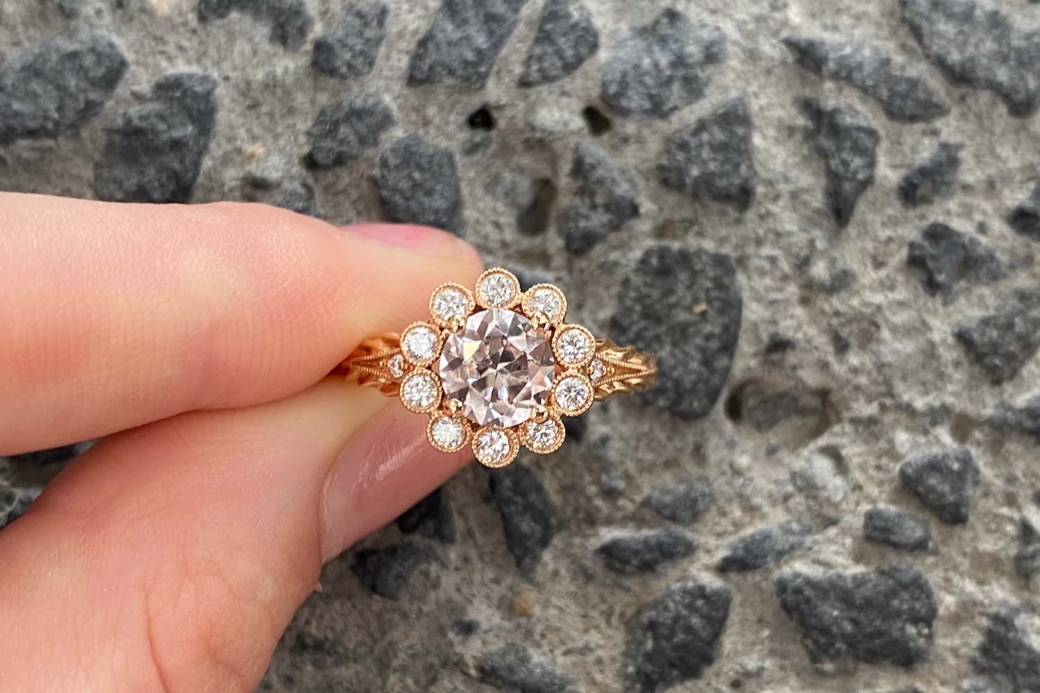 18ct rose gold antique inspired daisy ring featuring one natural 1.58ct pale pink Zircon surrounded by 10 round brilliant cut diamonds in a mill edge rub over daisy design. Total diamond weight is 0.31ct. Finger size M. Independent valuation supplied