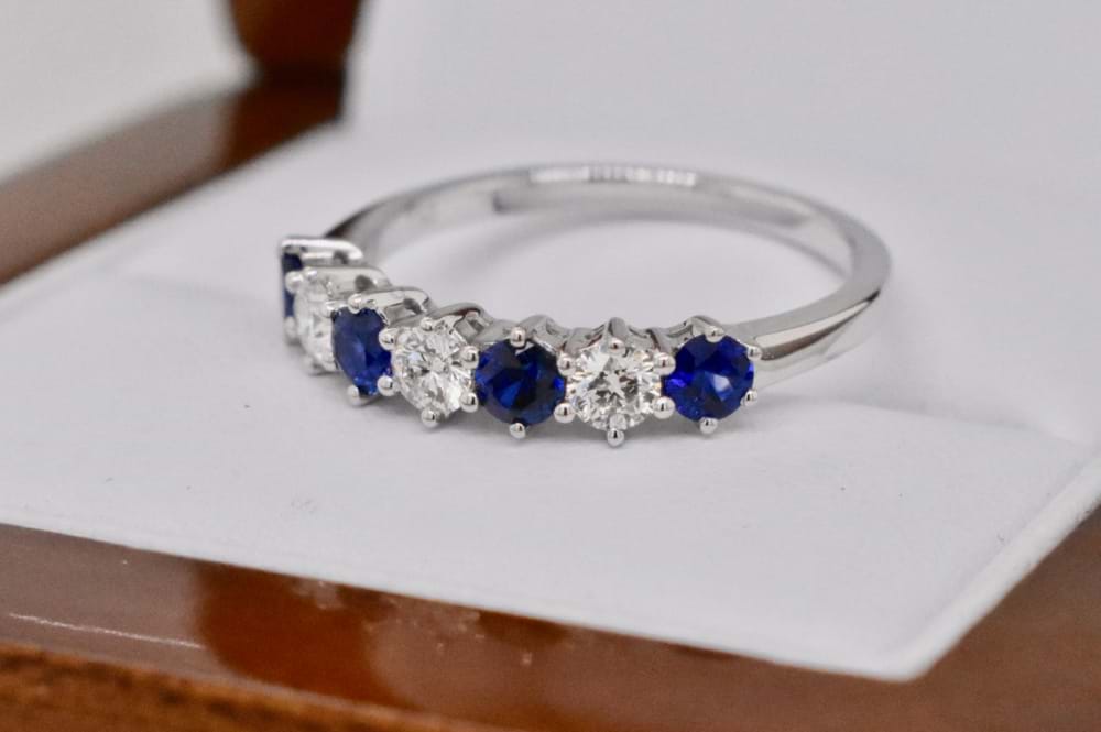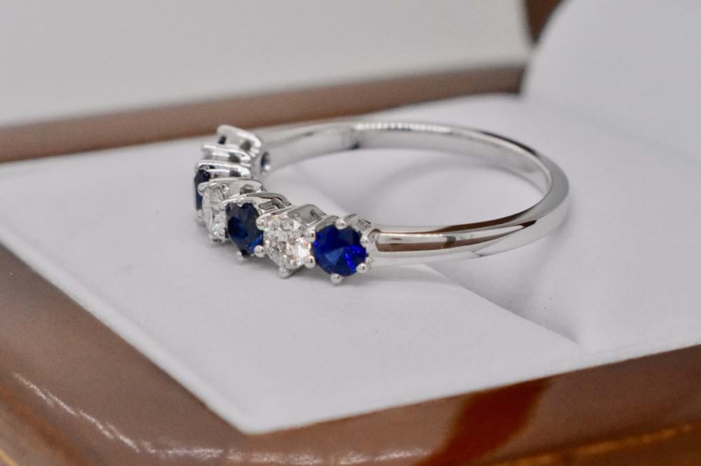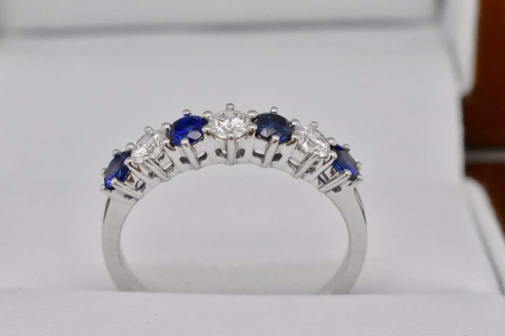 Timeless and classic desgin. Crafted in 18ct white gold this claw set, seven stone, band features natural blue sapphires and sparkling round brilliant cut diamonds. With four sapphires totalling 0.53cts and three diamonds totalling 0.32cts (G/SI1) this band makes a gorgeous stacking, anniversary, wedding or just because band! Independent Valuation Supplied. Finger size M