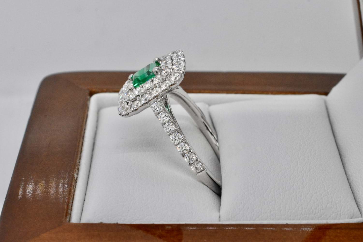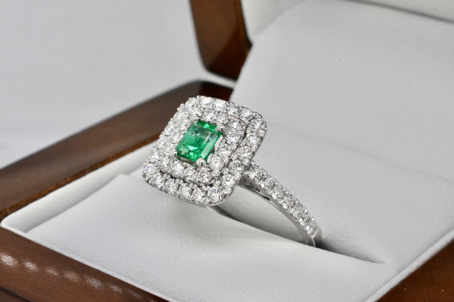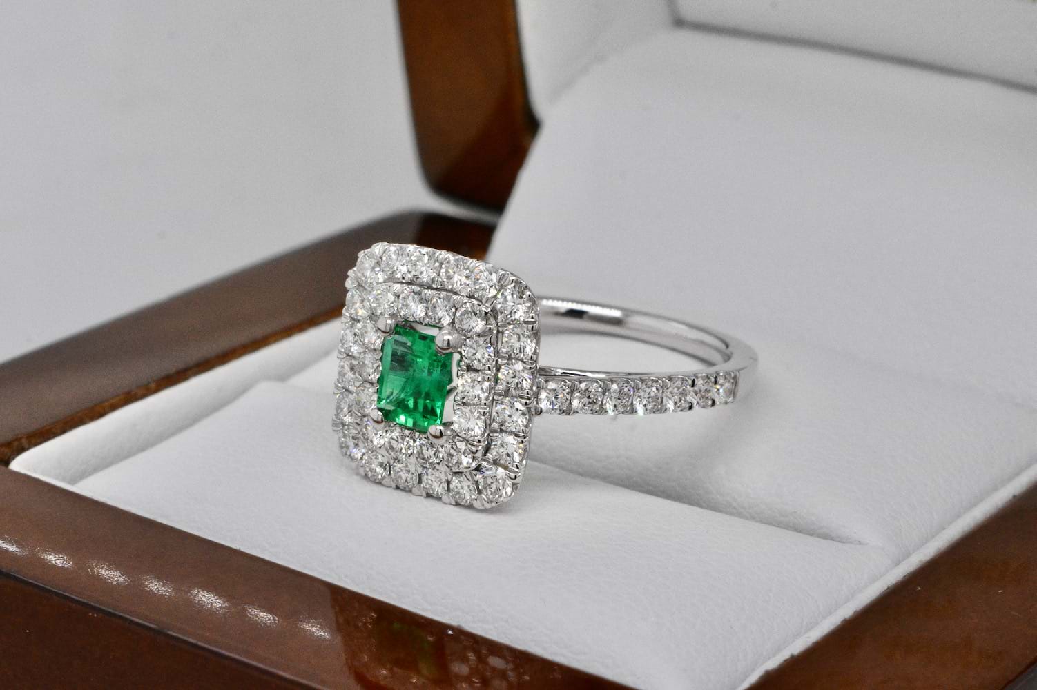 Stunning 0.30ct emerald cut Colombian emerald hand selected to be the feature of this custom made 18ct white gold double cushion halo diamond set ring. Featuring a total of 48 diamonds combined in the two halos and down the shoulders equaling 0.92cts GVS. This ring will sit beautifully with bands or alone as a dress ring. Finger size L+ Independent Valuation Supplied
