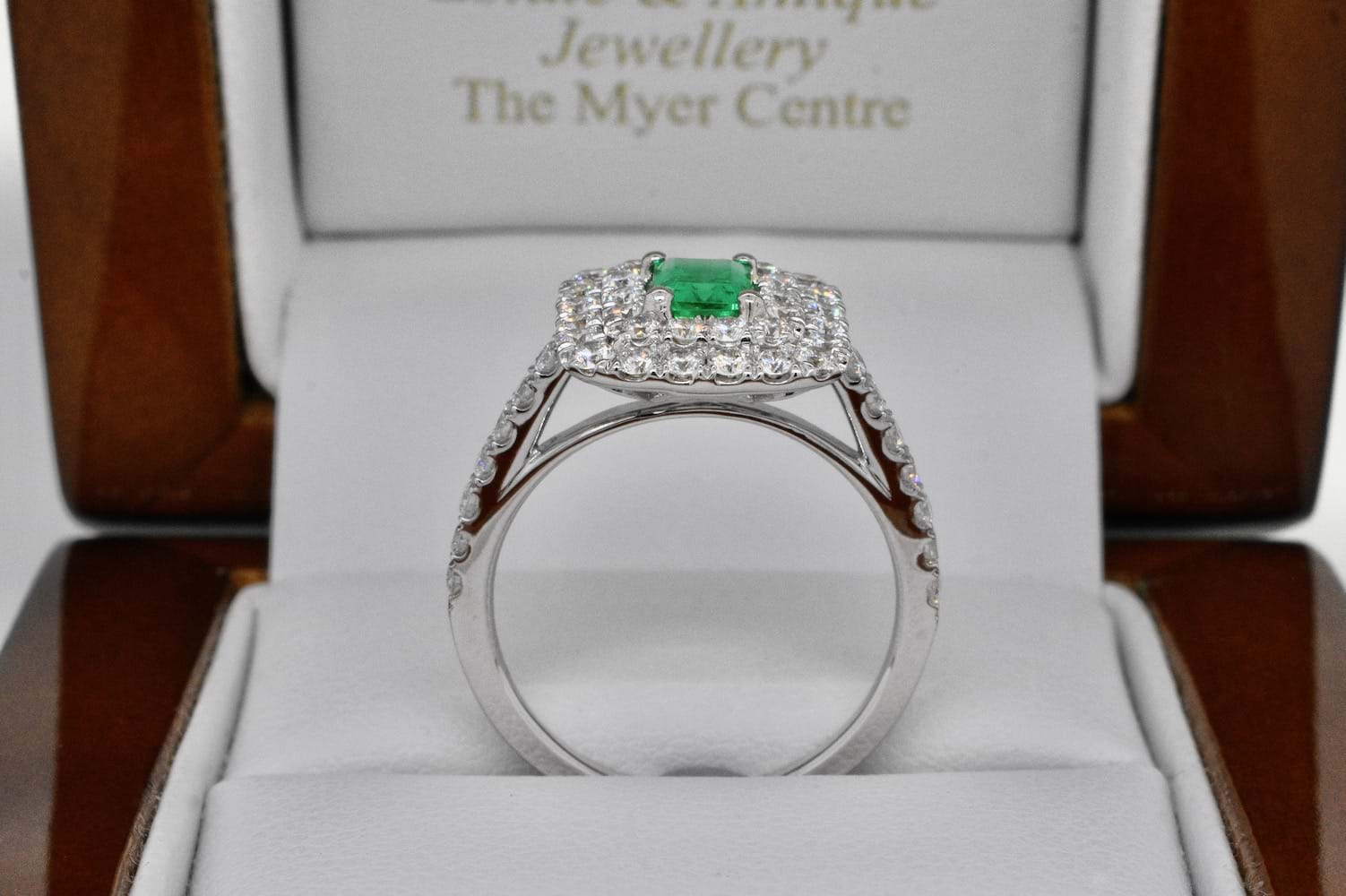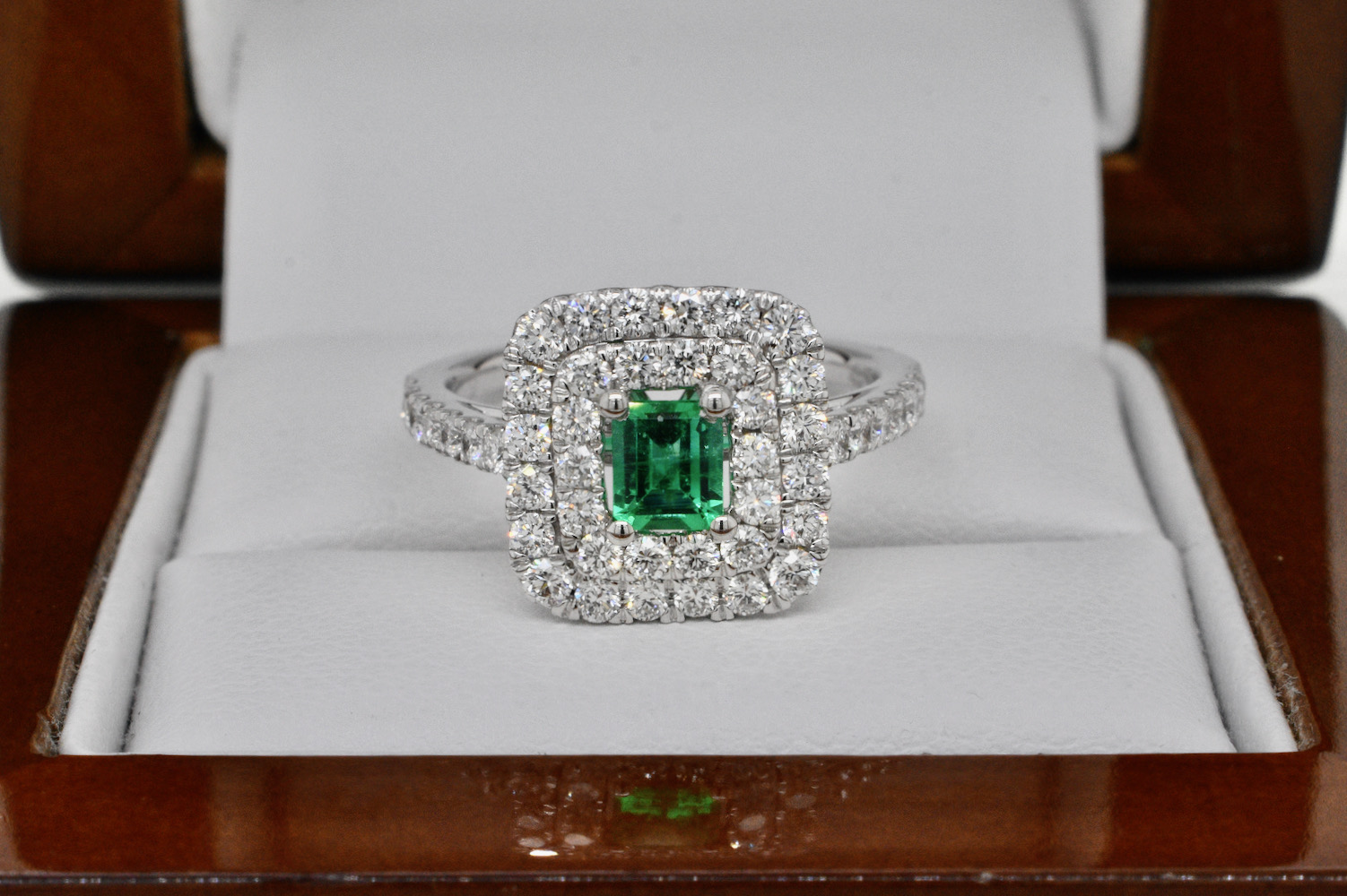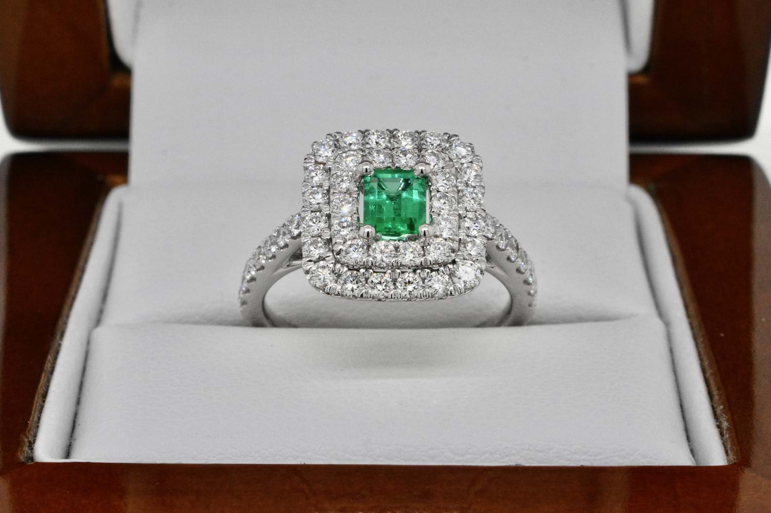 Stunning 0.30ct emerald cut Colombian emerald hand selected to be the feature of this custom made 18ct white gold double cushion halo diamond set ring. Featuring a total of 48 diamonds combined in the two halos and down the shoulders equaling 0.92cts GVS. This ring will sit beautifully with bands or alone as a dress ring. Finger size L+ Independent Valuation Supplied