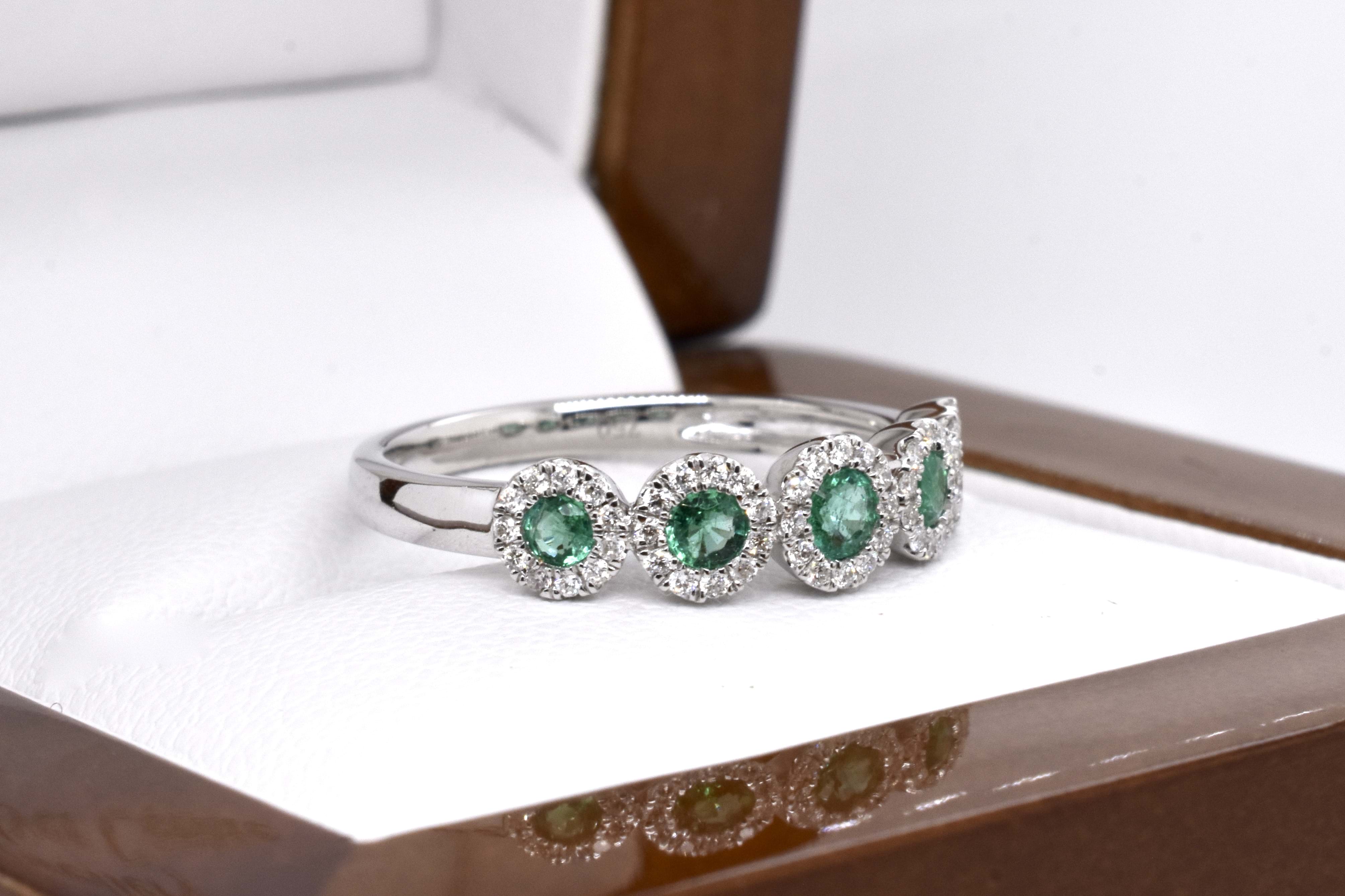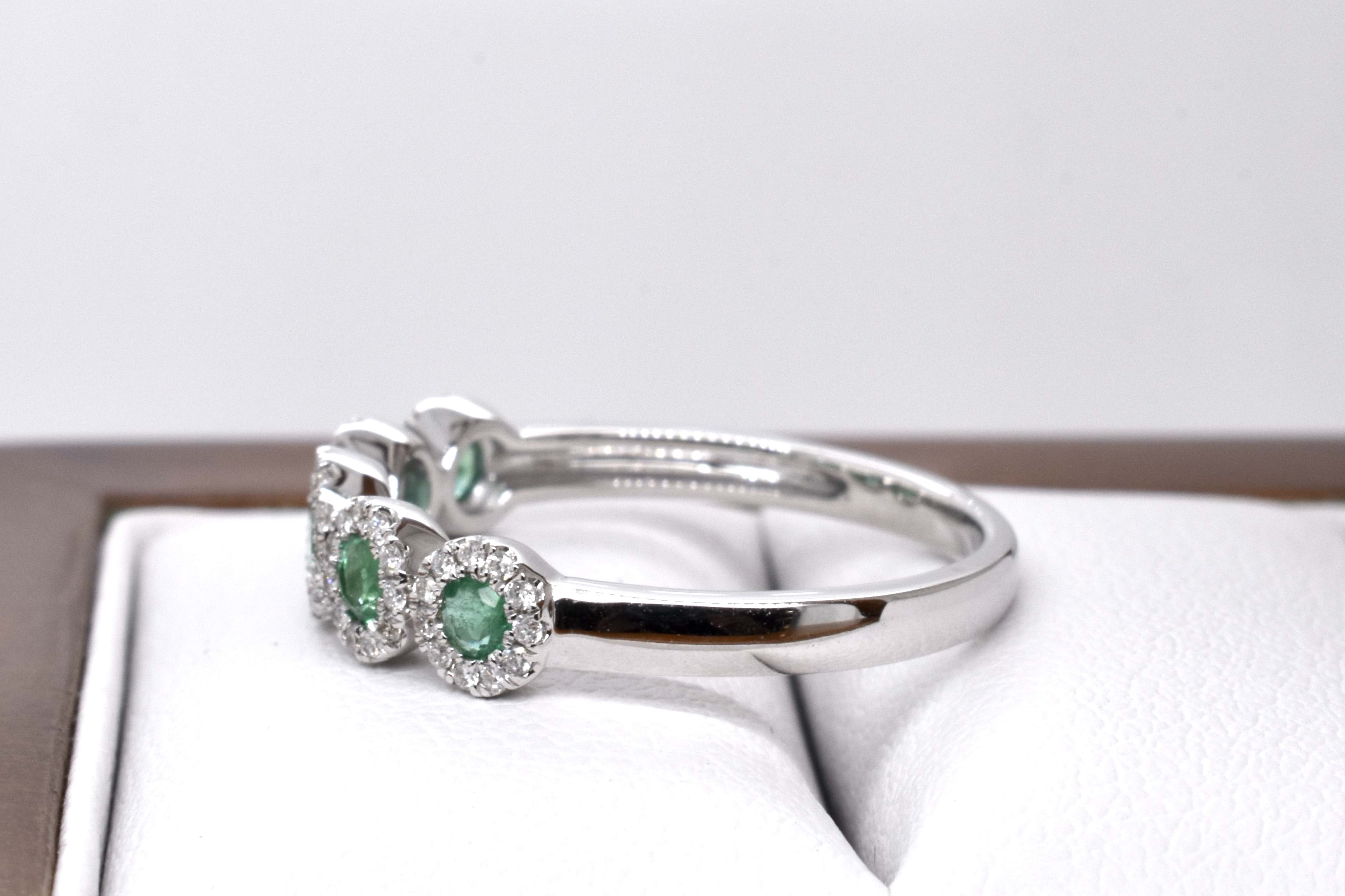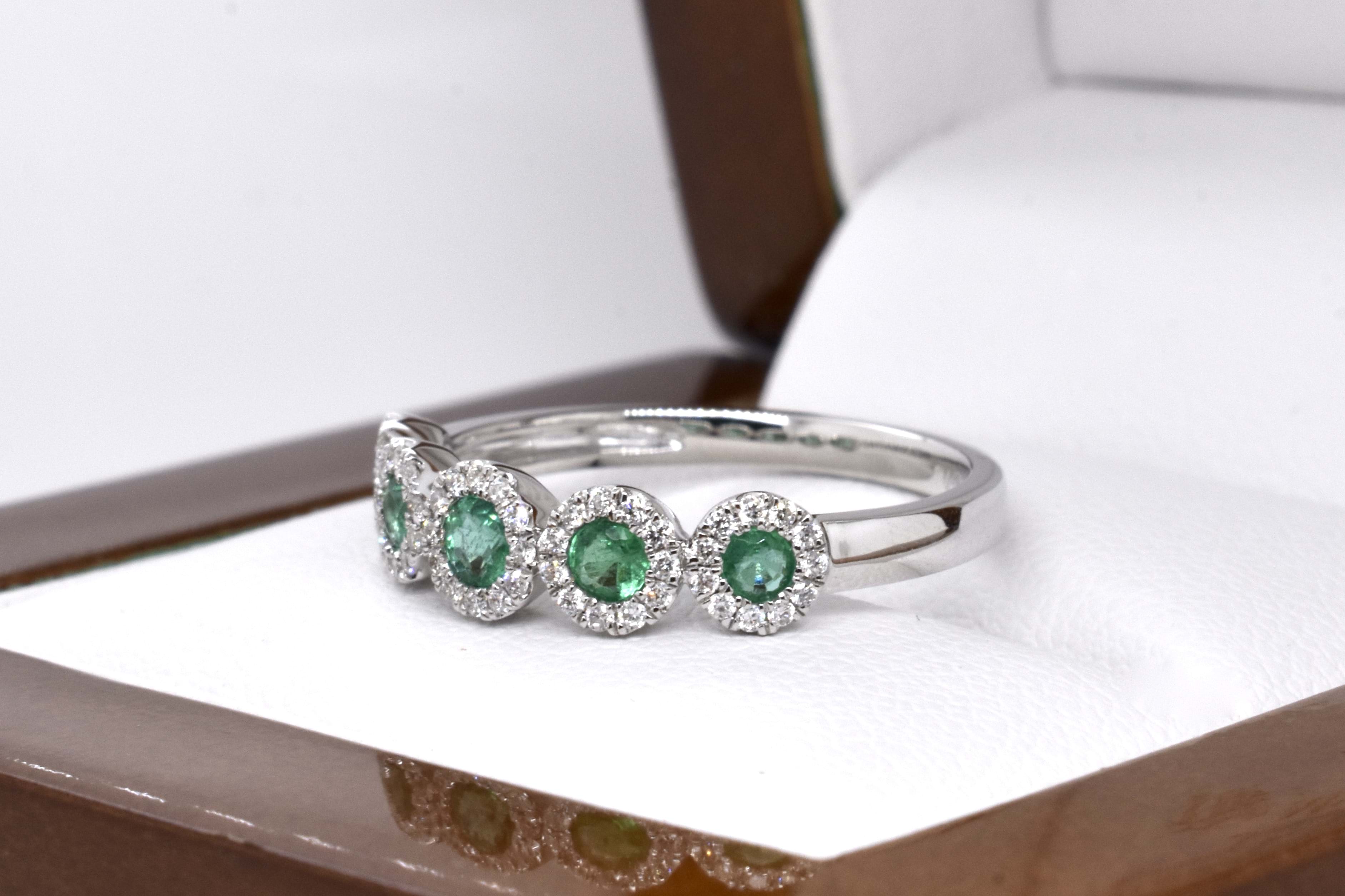 A classy and timeless Art Deco style look, this ring is crafted in 18ct yellow gold and features 5 round mid green emeralds totalling 0.33ct, each with its own halo of shimmering white diamonds for a total of 56 equalling 0.18ct, on a plain band. Finger size M+