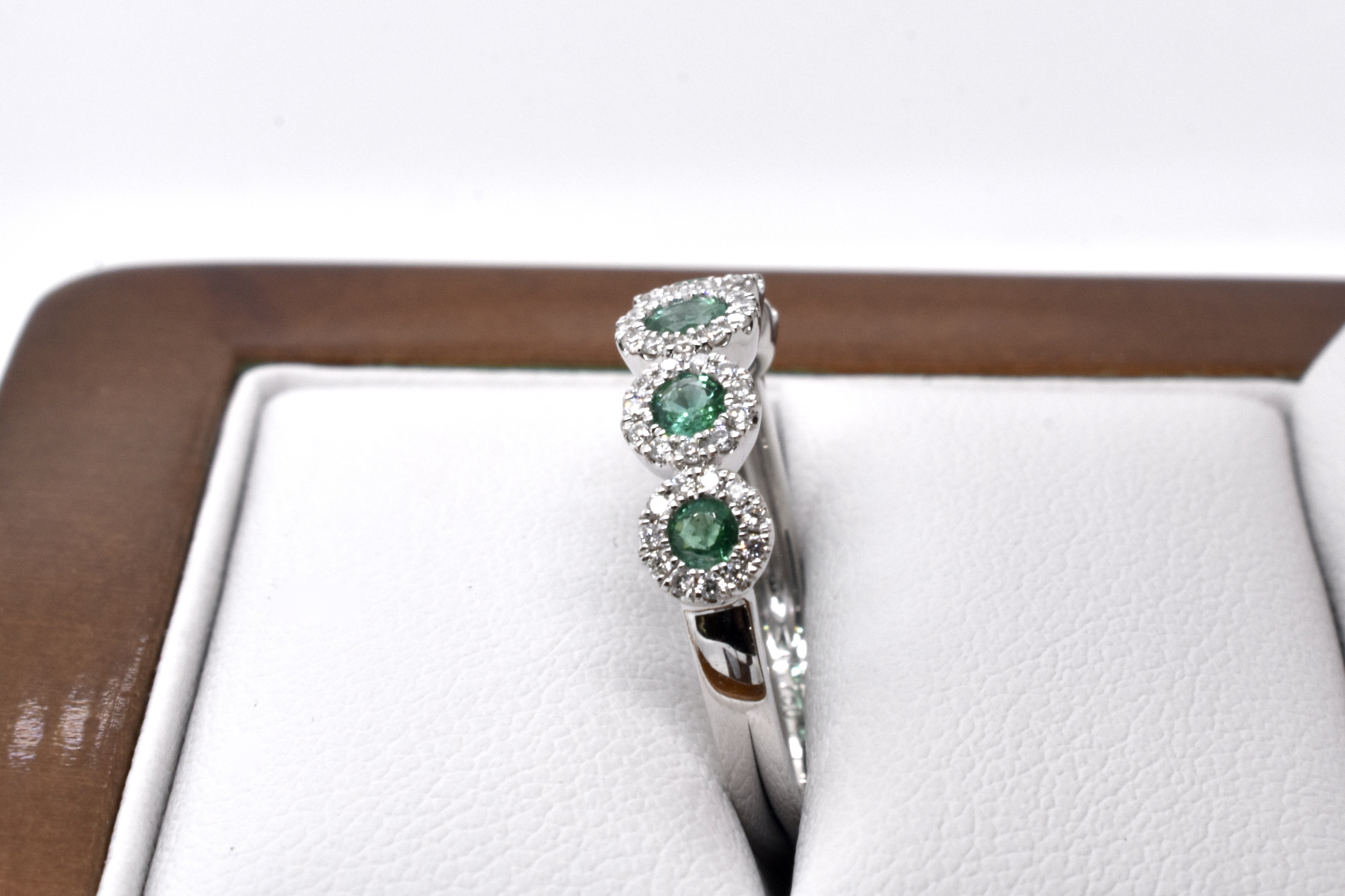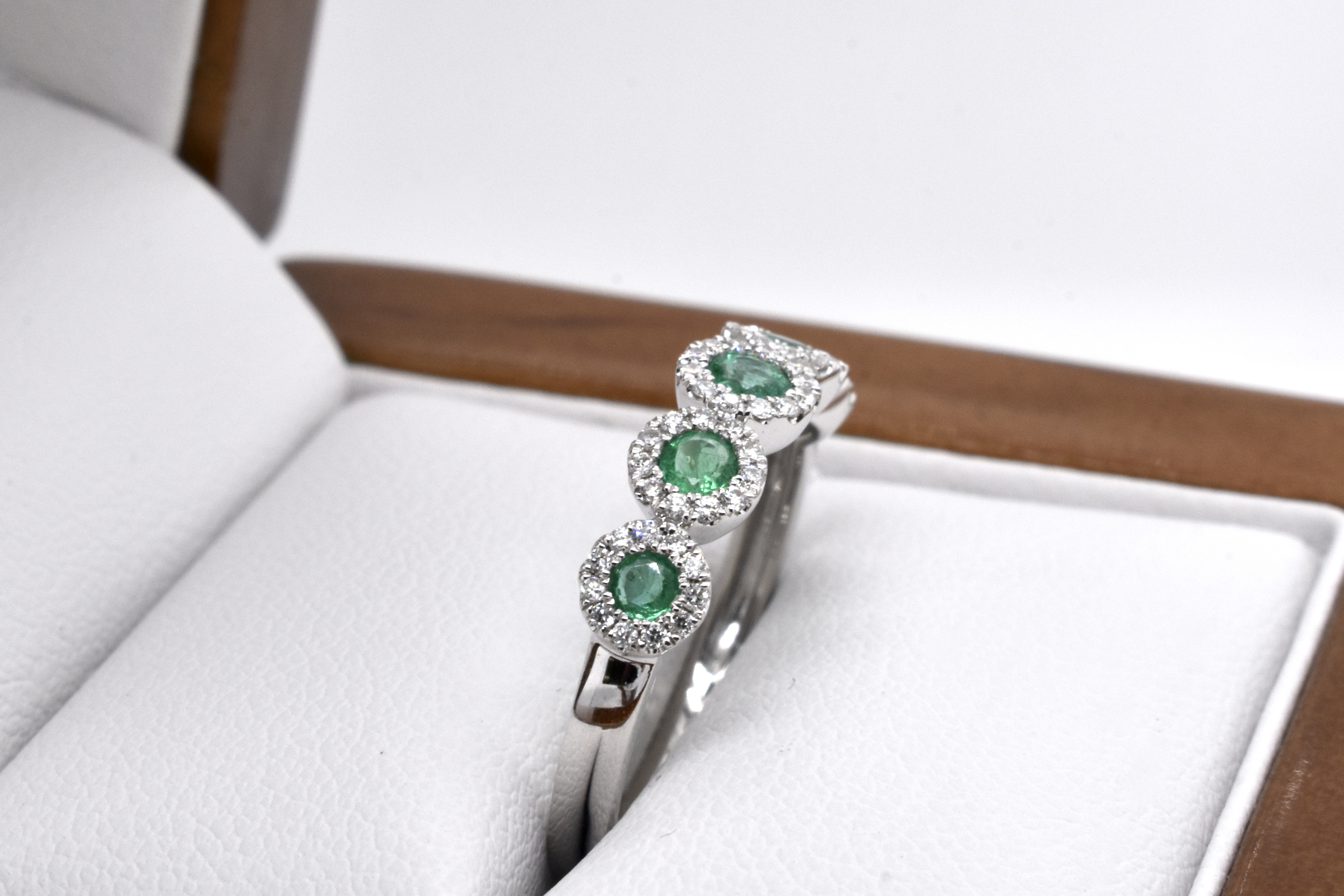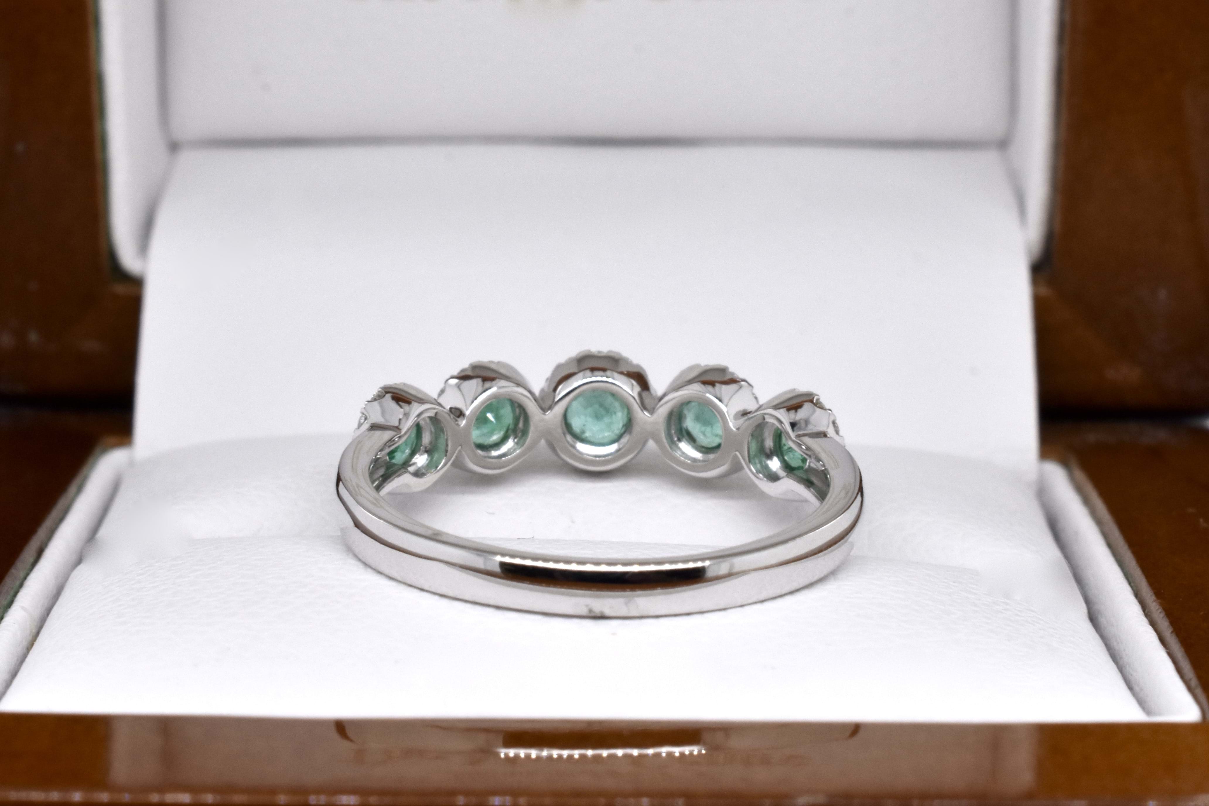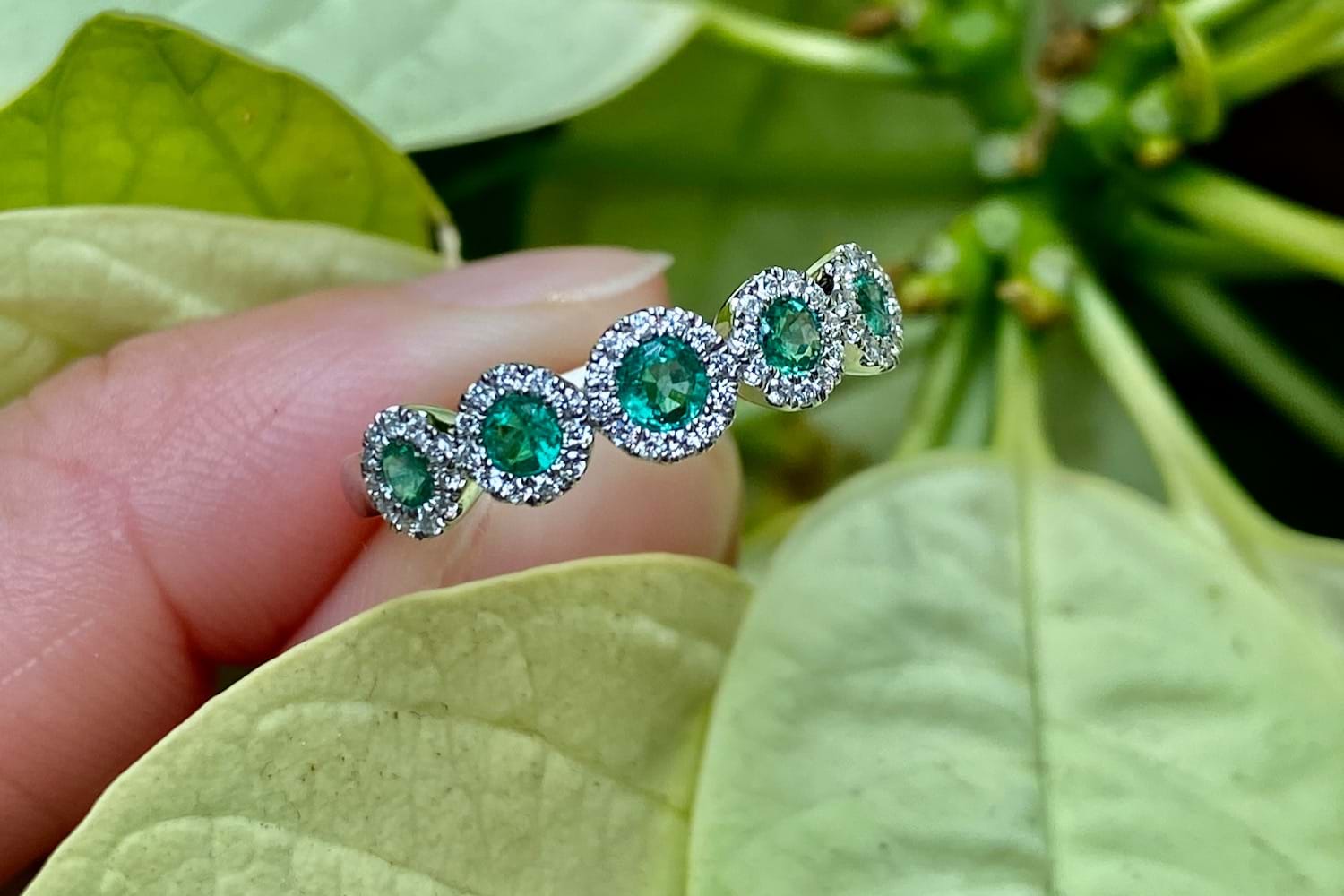 A classy and timeless Art Deco style look, this ring is crafted in 18ct yellow gold and features 5 round mid green emeralds totalling 0.33ct, each with its own halo of shimmering white diamonds for a total of 56 equalling 0.18ct, on a plain band. Finger size M+