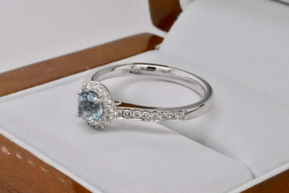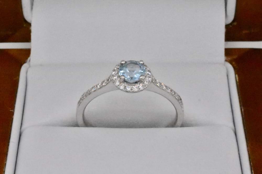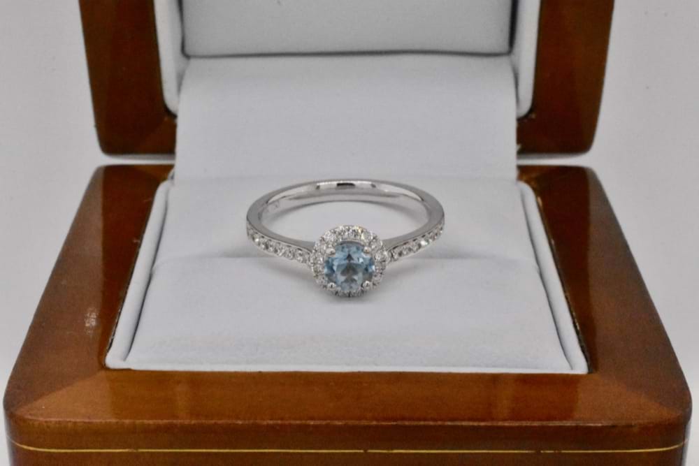 This 0.45ct light blue aquamarine was selected to the be feature of this delicate and feminine halo design in 18ct white gold. With a total of 32 round brilliant cut diamonds both in the halo and down the shoulders totalling 0.26cts (GH/VS-SI), this beautiful ring is pretty when worn alone or with diamond bands. Independent Valuation Supplied. Finger size O