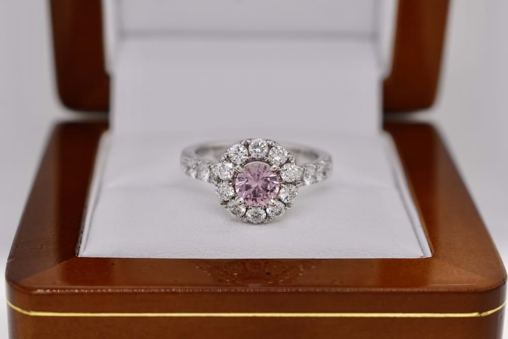 This stunning 18ct white gold ring has a beautiful 0.79ct unheated pink sapphire in the centre, surrounded by a halo of round brilliant cut G VS-SI sparking white diamonds which continue down the shoulders, 18 in total equalling 1.15cts. Finger size N