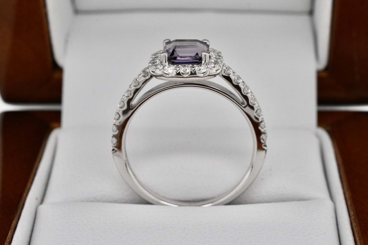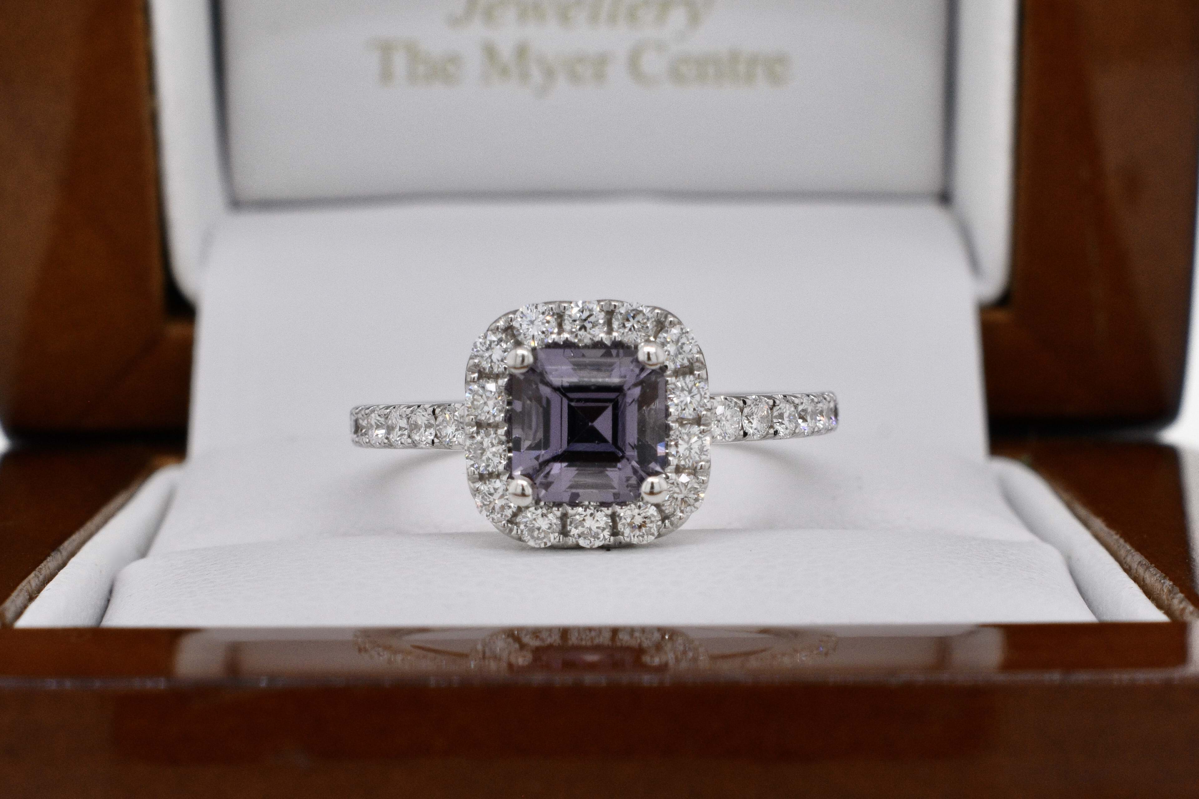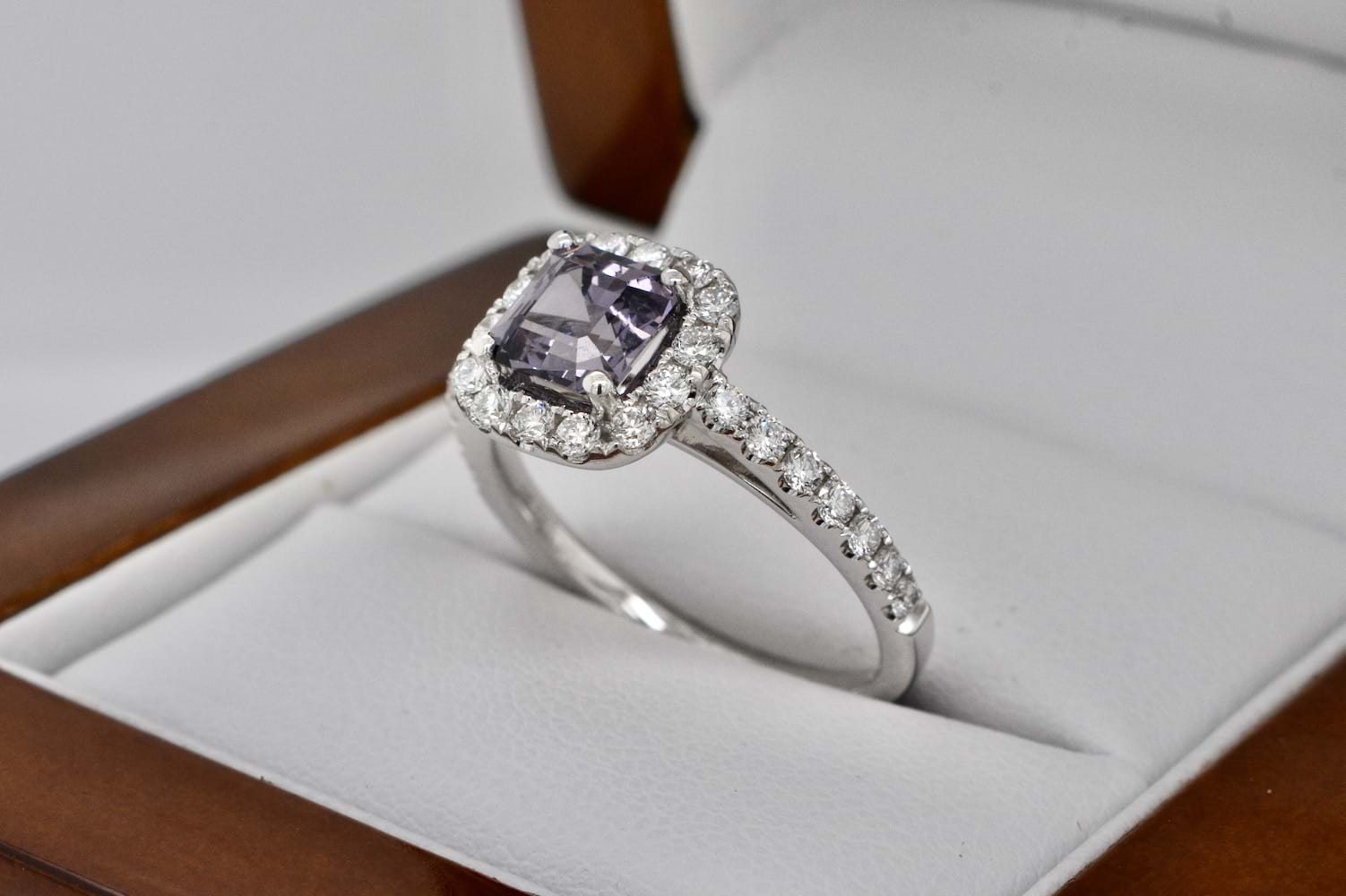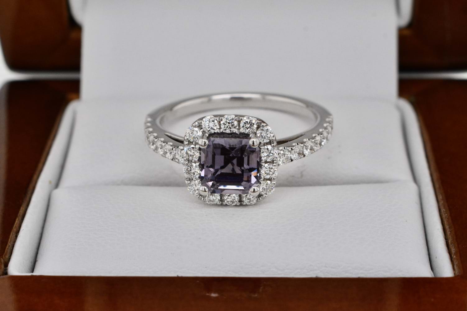 This scintillating 1.17ct square emerald cut spinel is a beautiful greyish purple colour and has been set into an 18ct white gold cushion shape halo with 28 round brilliant cut diamonds both in the halo and down the shoulders totalling 0.51cts G/VS-SI. This ring will sit beautifully when paired with a plain or diamond band. Finger size M. Independent Valuation Supplied