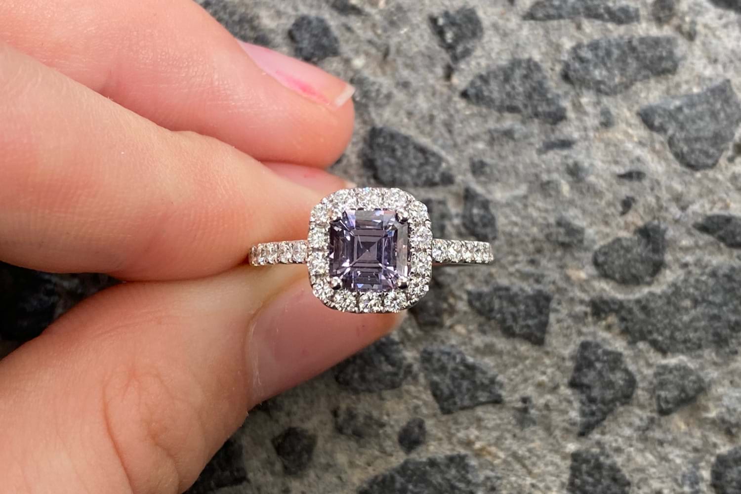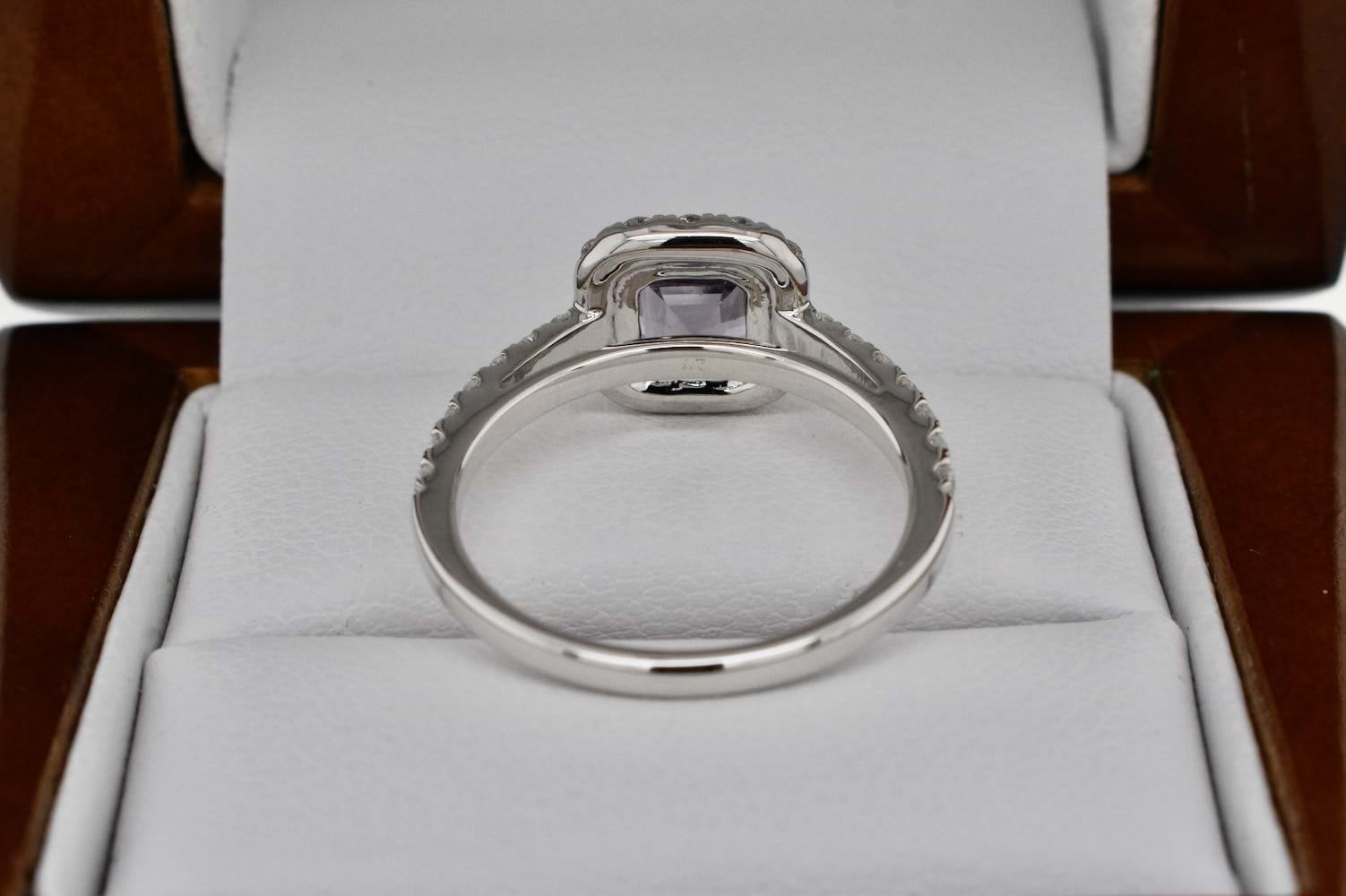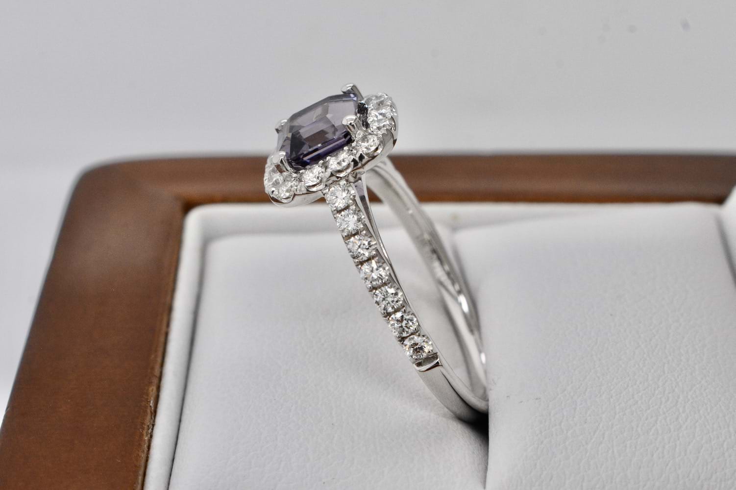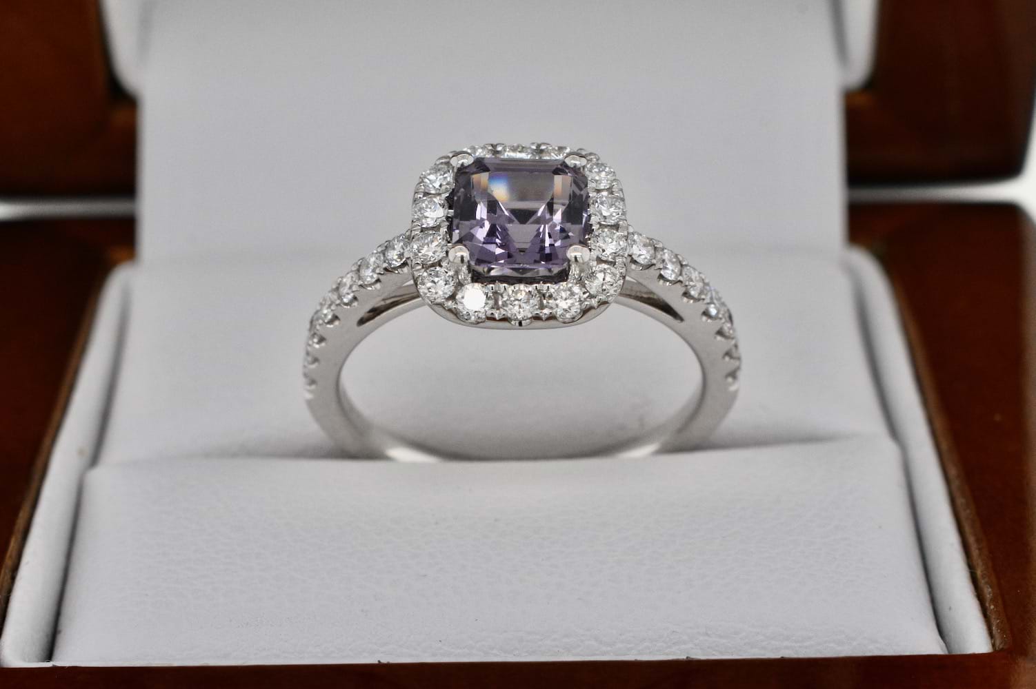 This scintillating 1.17ct square emerald cut spinel is a beautiful greyish purple colour and has been set into an 18ct white gold cushion shape halo with 28 round brilliant cut diamonds both in the halo and down the shoulders totalling 0.51cts G/VS-SI. This ring will sit beautifully when paired with a plain or diamond band. Finger size M. Independent Valuation Supplied