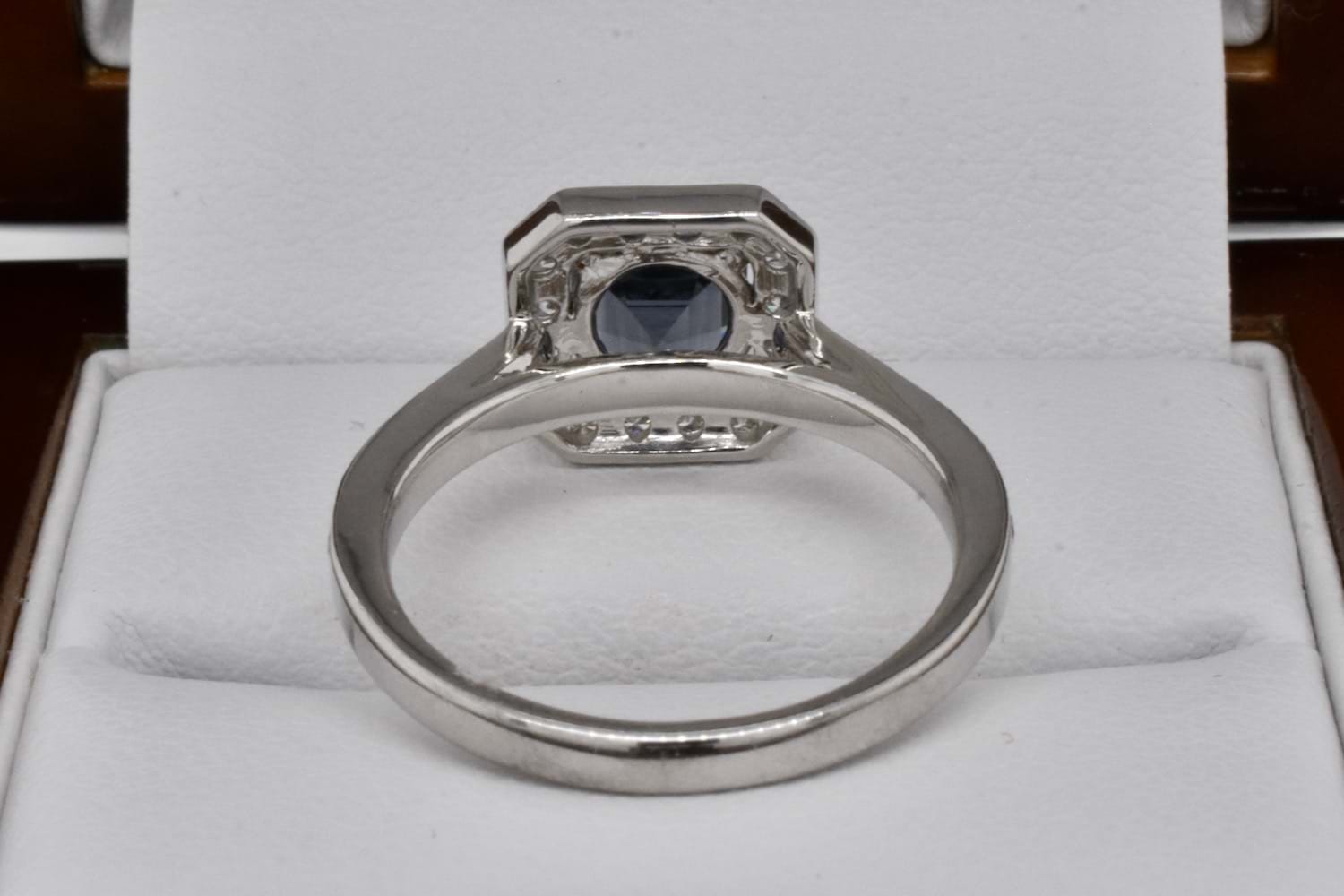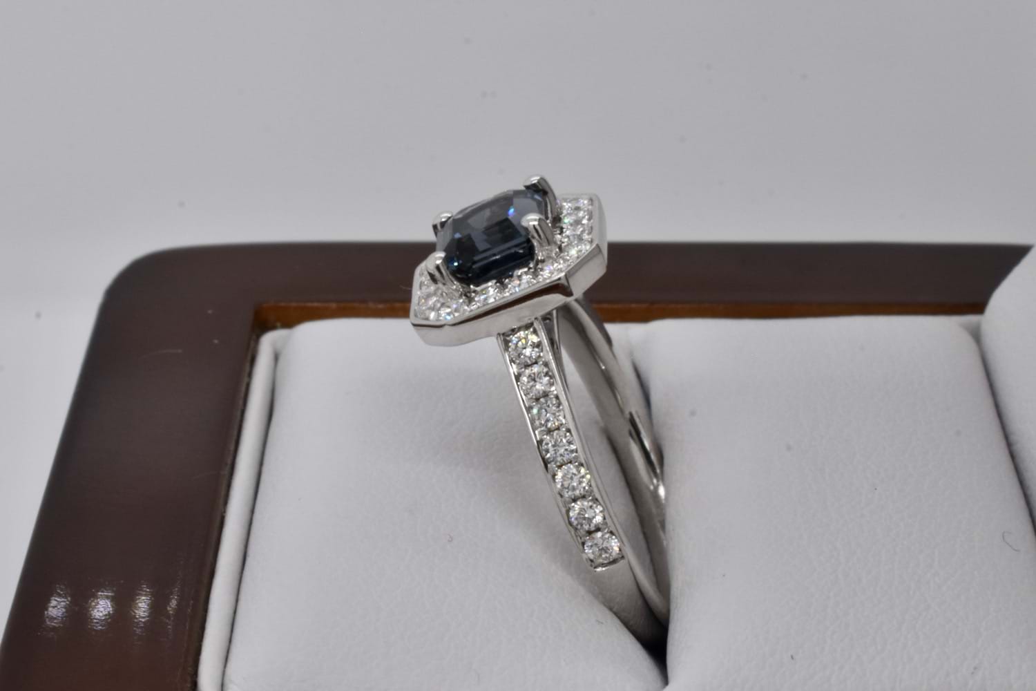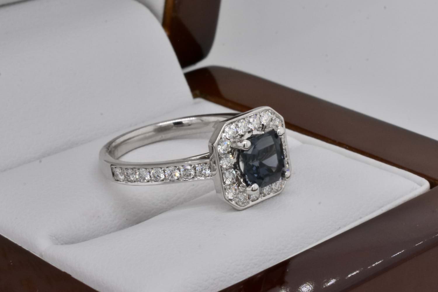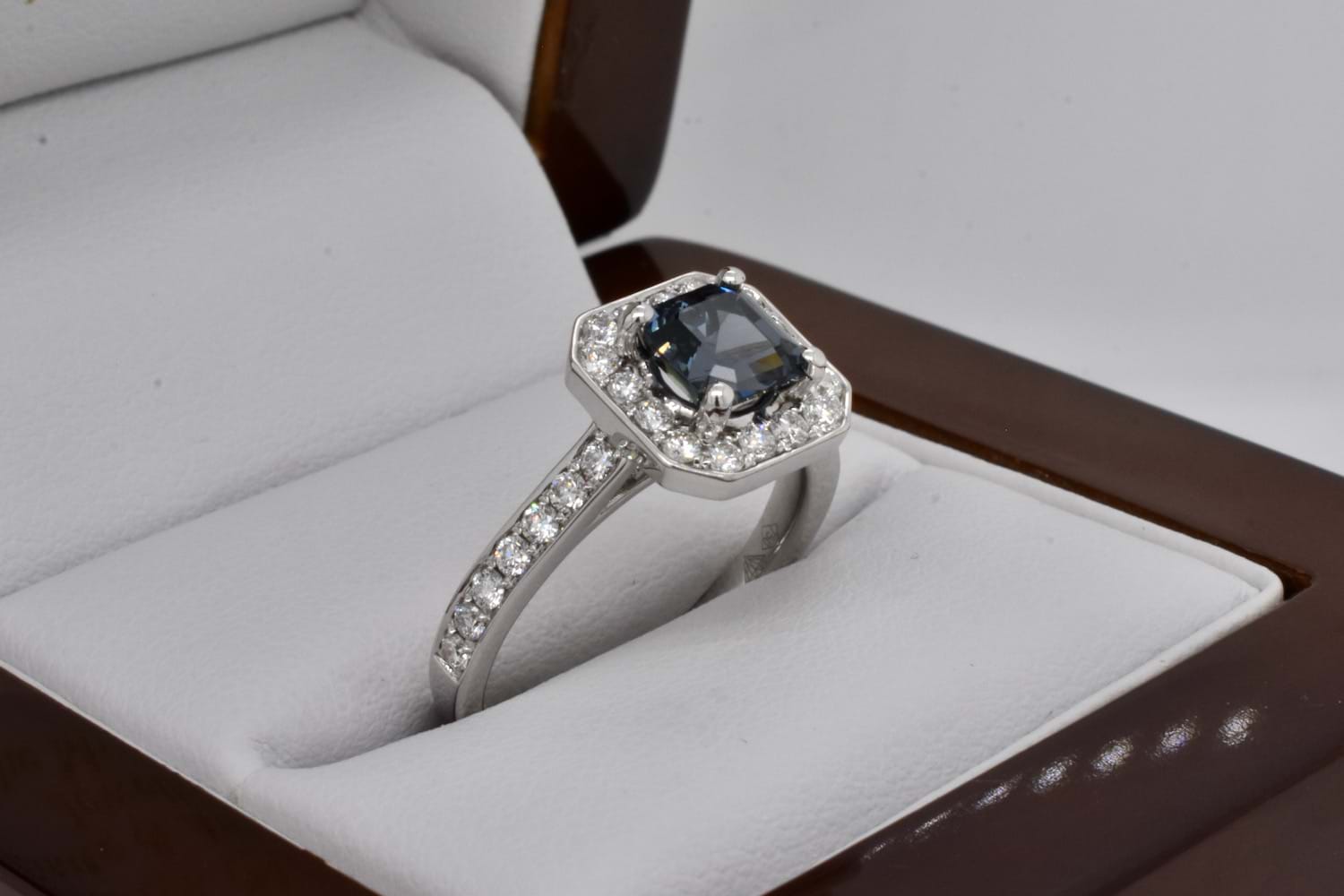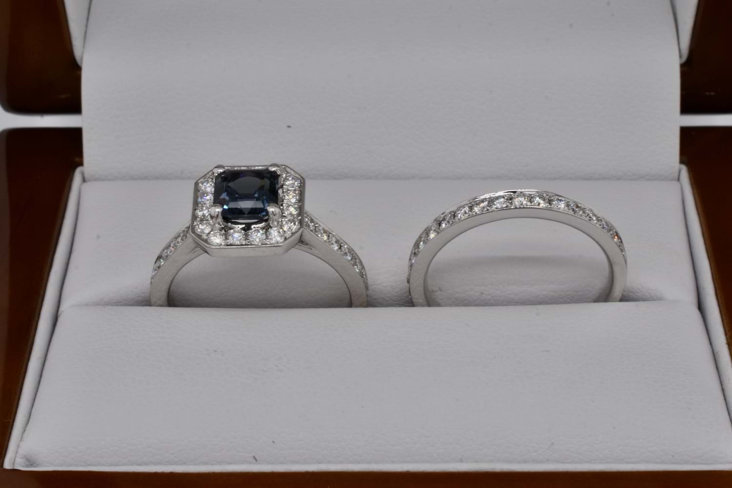 This moody and scintillating 1.28ct greyish blue spinel is a stunning square emerald cut four claw set into an 18ct white gold cut corner grain set halo with shimmering round brilliant cut diamonds in the halo and down the shoulders totalling 0.54cts FG/VS-SI. A matching diamond band has been designed to sit perfectly and act as a compliment to the stunning feature ring, containing 18 diamonds equalling 0.33cts FGVS-SI. Finger size M+. Priced as a set. Independent Valuation Supplied