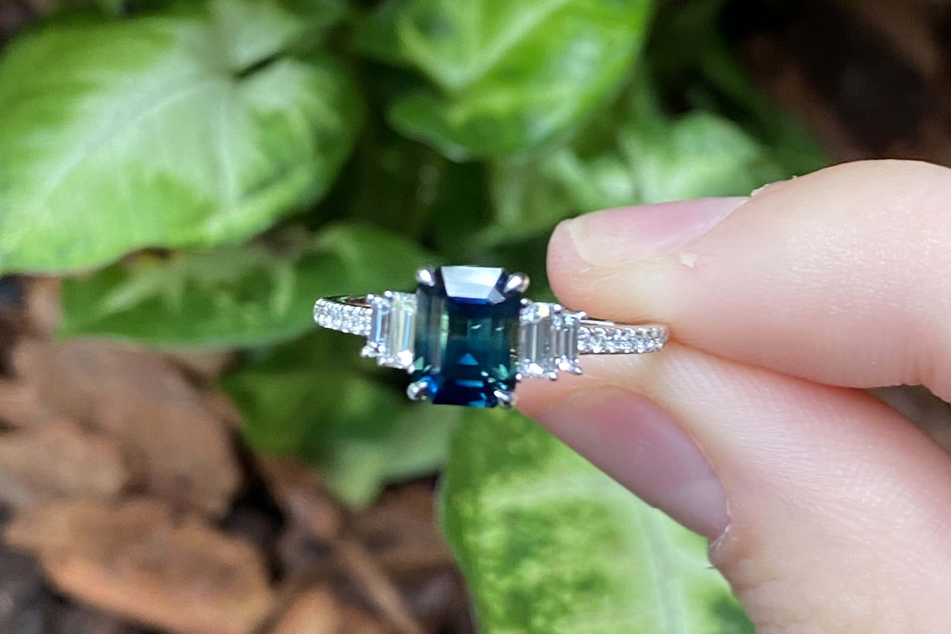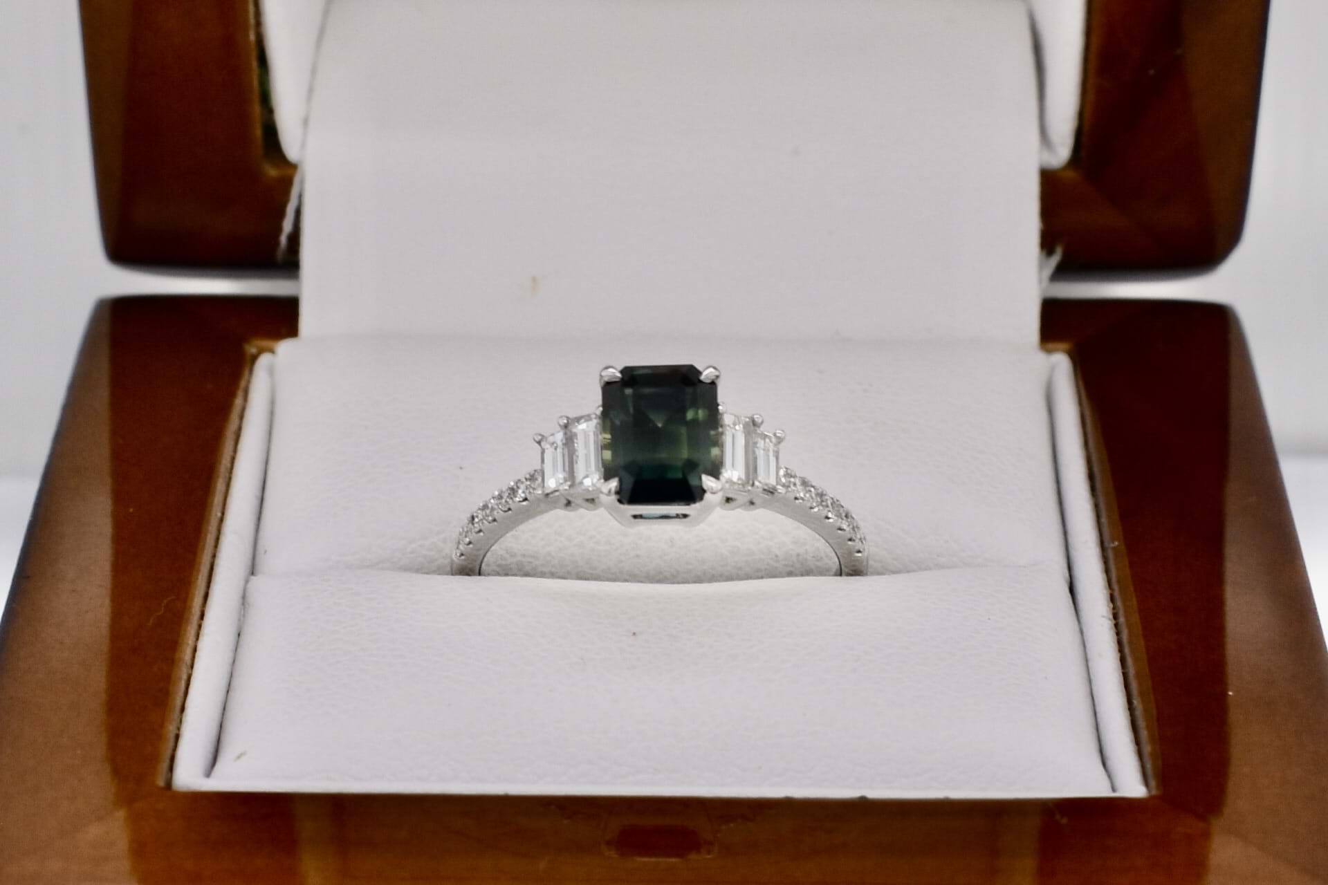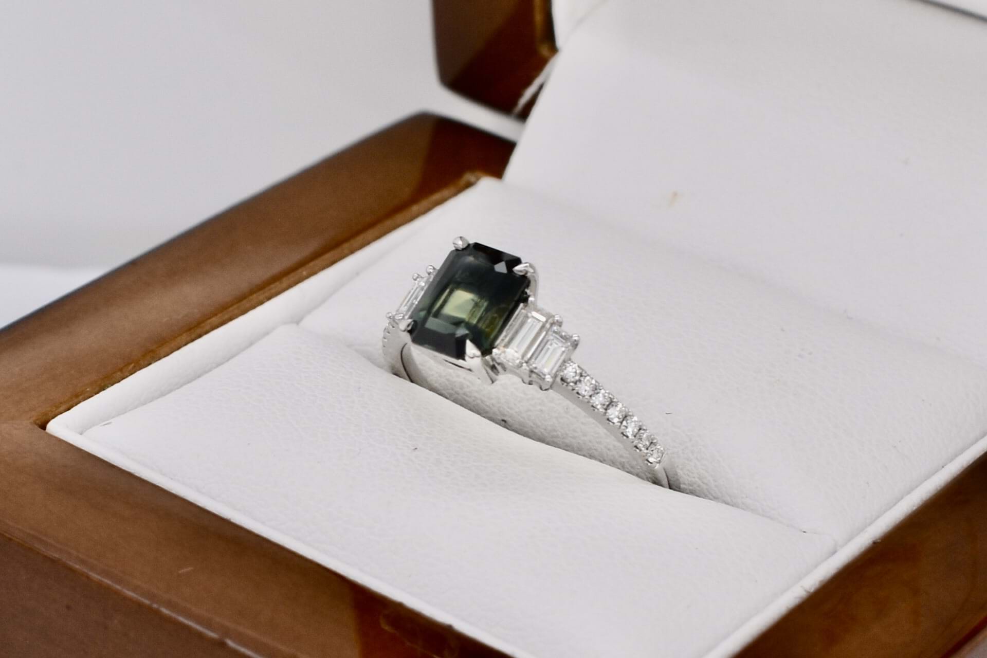 This beautiful greenish blue emerald cut Australian sapphire of 1.34ct, is crafted into an 18ct white gold ring, four claw set with two baguette diamonds on each side. Baguette diamonds measuring 3.70x1.95-3.00x1.5mm and totalling 0.23ct G VS. Further studded with fourteen more 1.00mm round brilliant cut diamonds set down the 1.41mm band, equalling 0.08ct G SI. Total diamonds equalling 0.31ct. Finger size M. Independent Valuation Supplied.