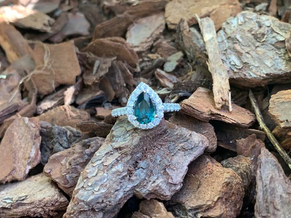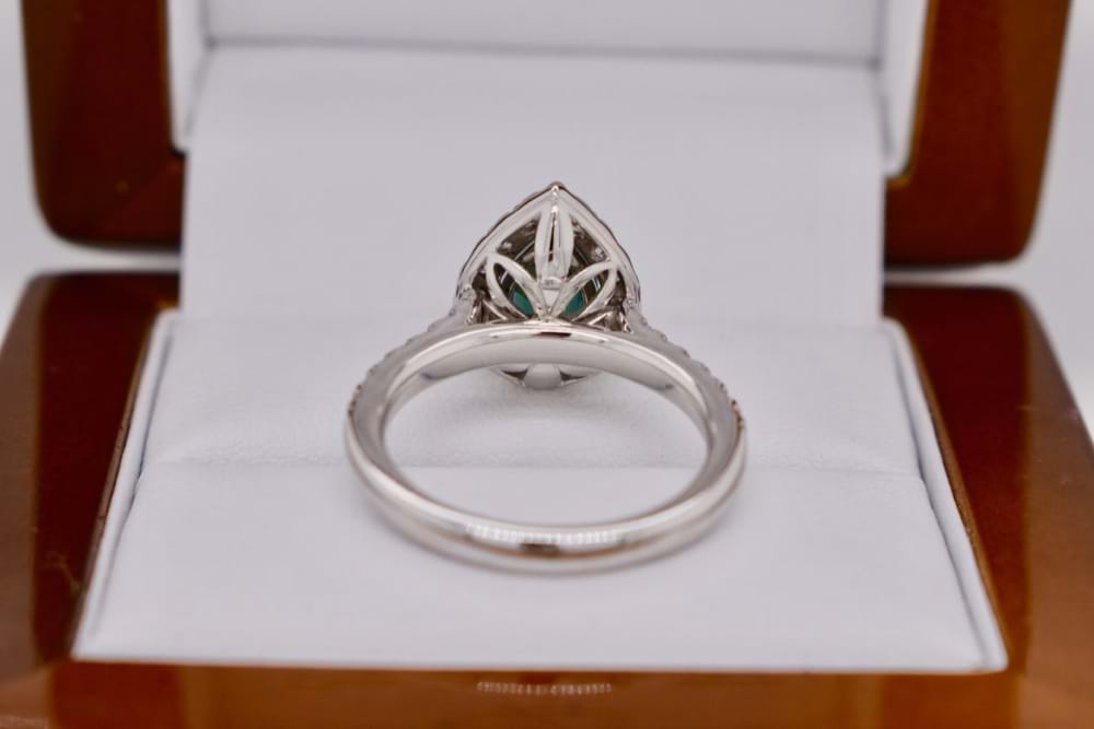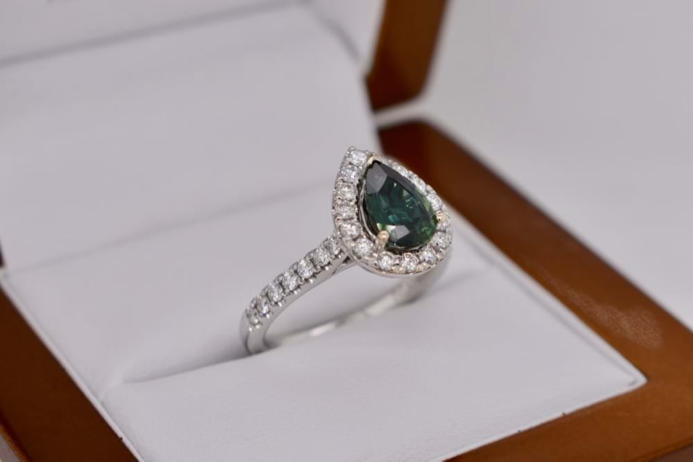 This mesmerising teal colour sapphire of Australian origin has been cut into a sparkling pearshape of 1.63cts and is the centre of this 18ct white gold halo design diamond ring. The ring contains a total of 29 round brilliant cut diamonds equalling 0.61cts (FG/SI) and is designed to sit perfectly next to diamond bands. Independent Valuation Supplied