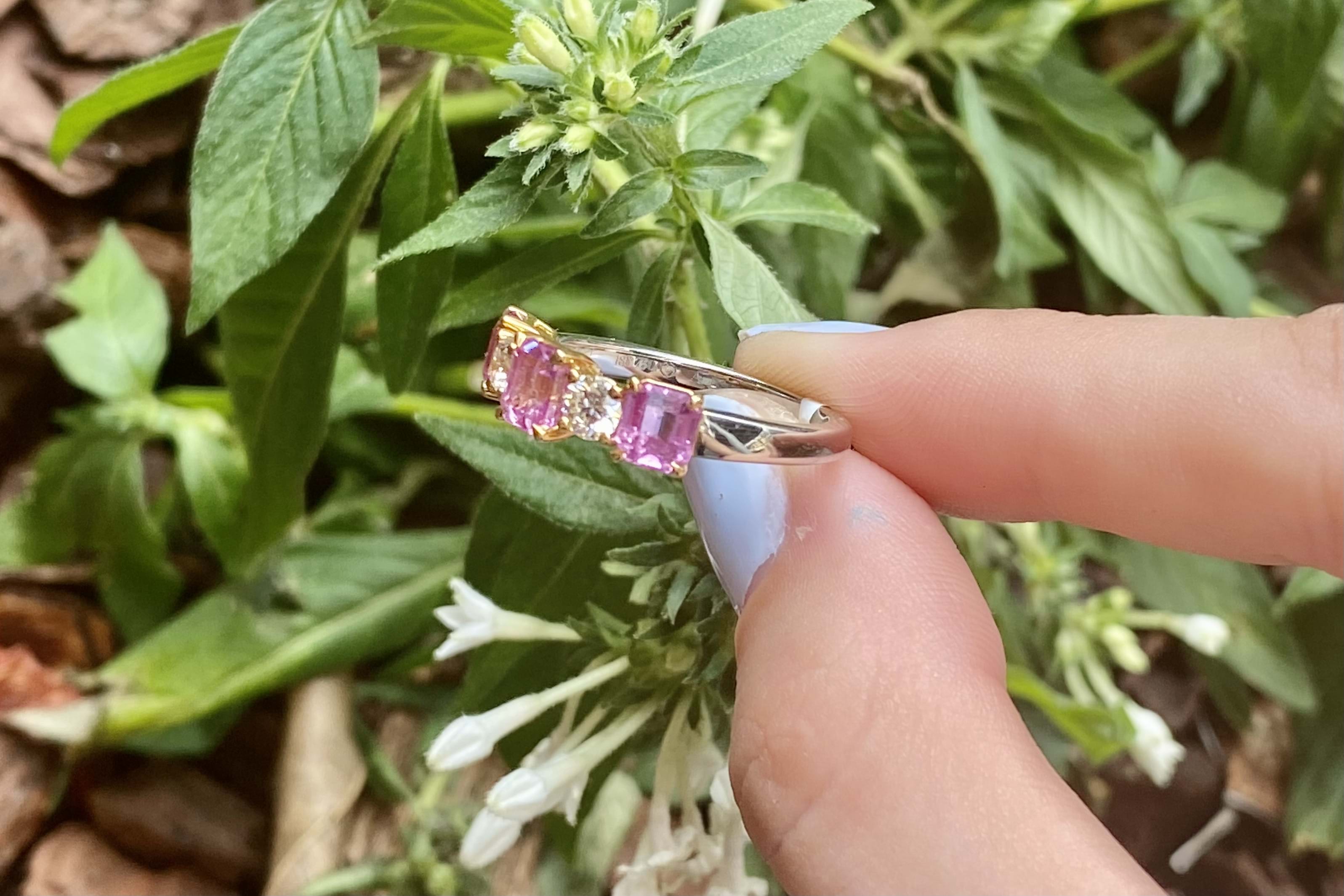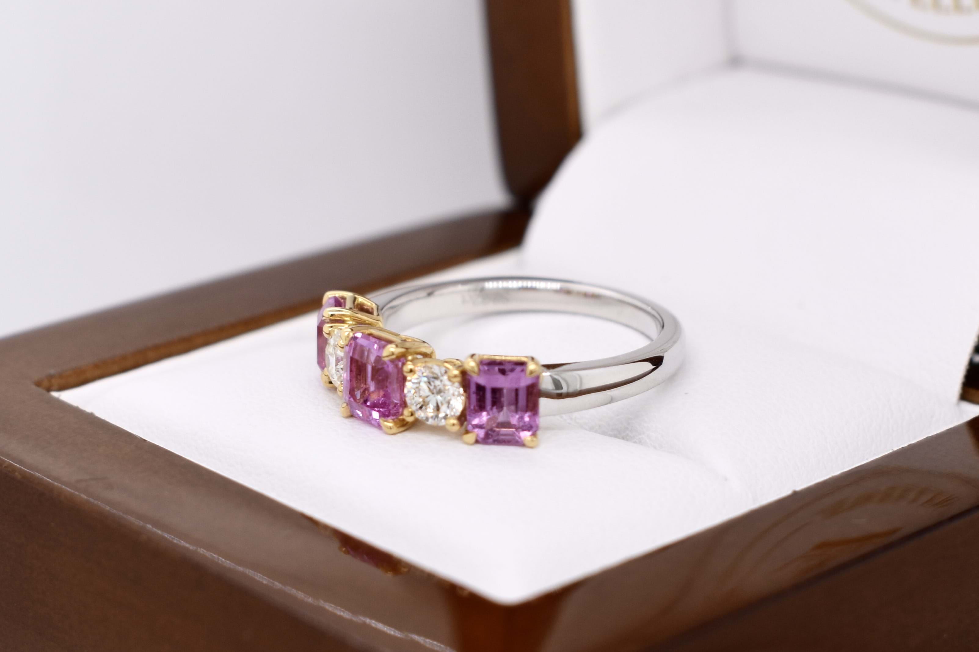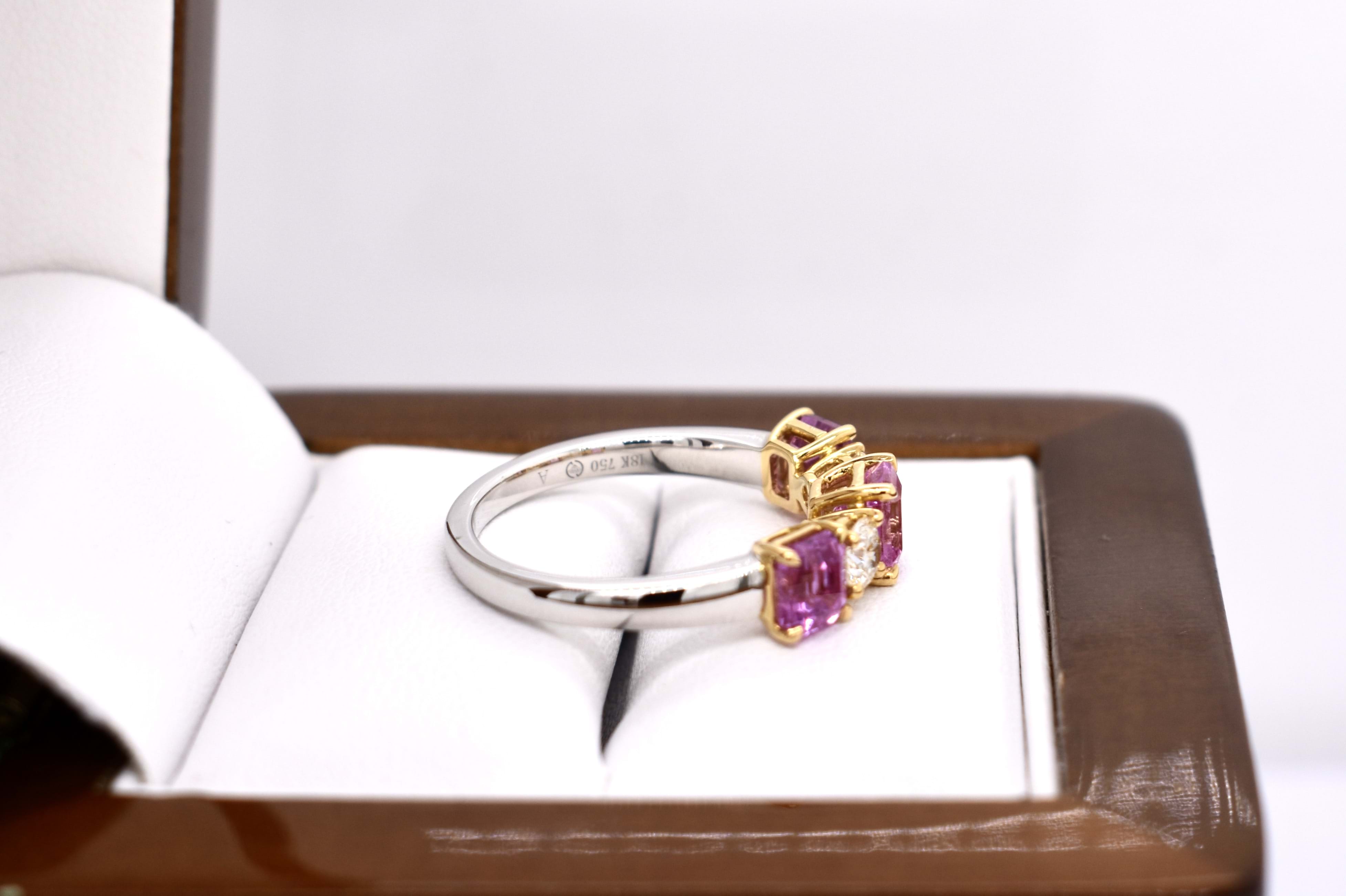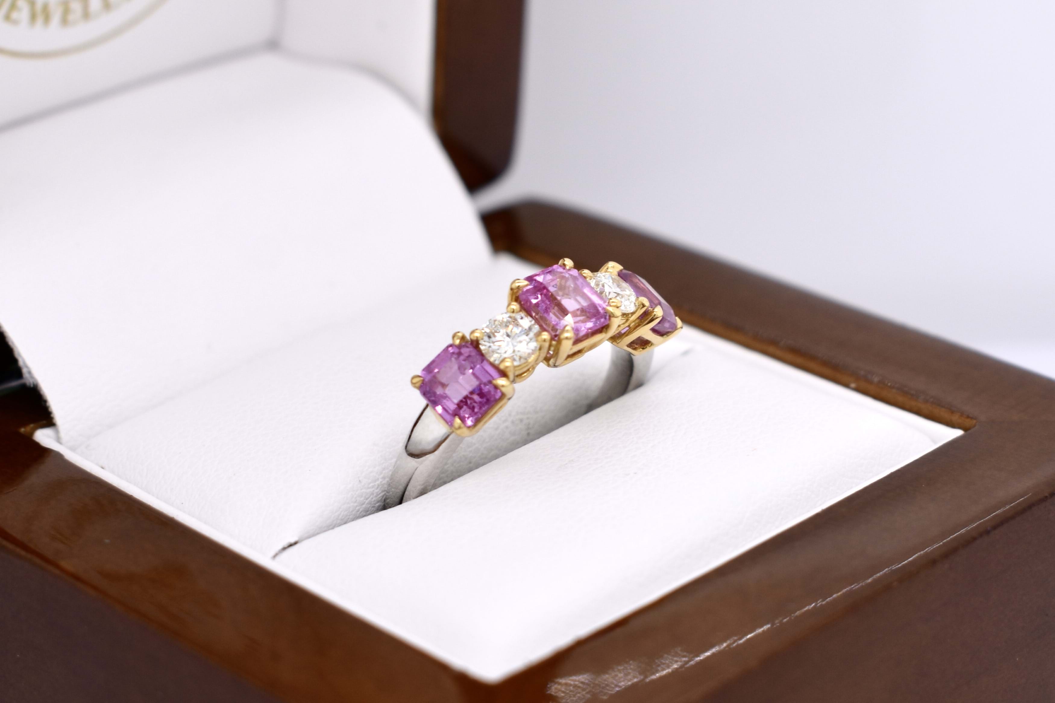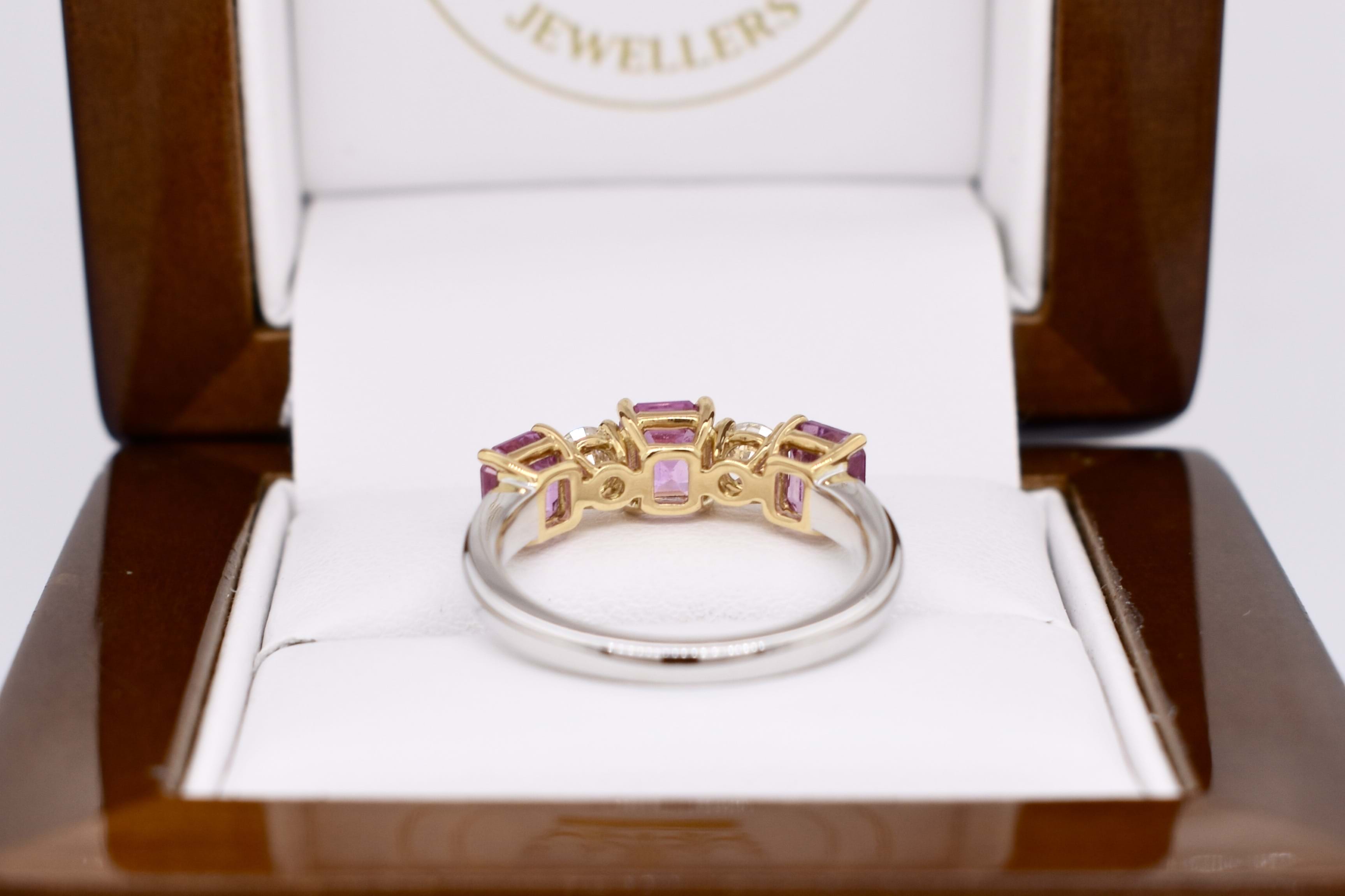 "Pretty and pink! This 18ct white gold ring features three bright pink emerald cut stones, totalling 2.32ct, four claw set with yellow gold claws. Alternating with the vibrant sapphires are two round brilliant cut diamonds, four claw set between, equalling 0.39ct GH SI. Completed on a plain white gold band. Finger size M. Independent Valuation available upon purchase.