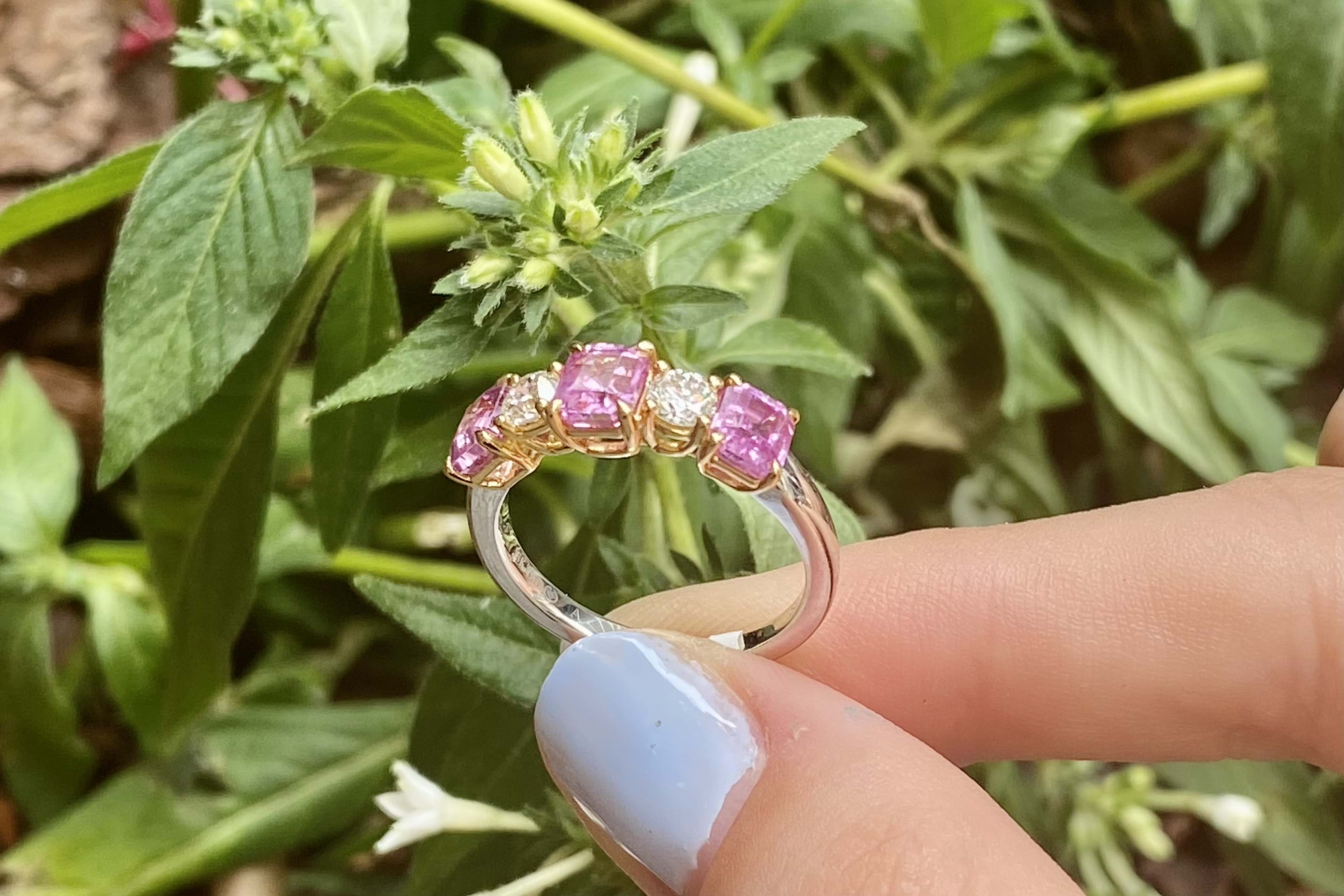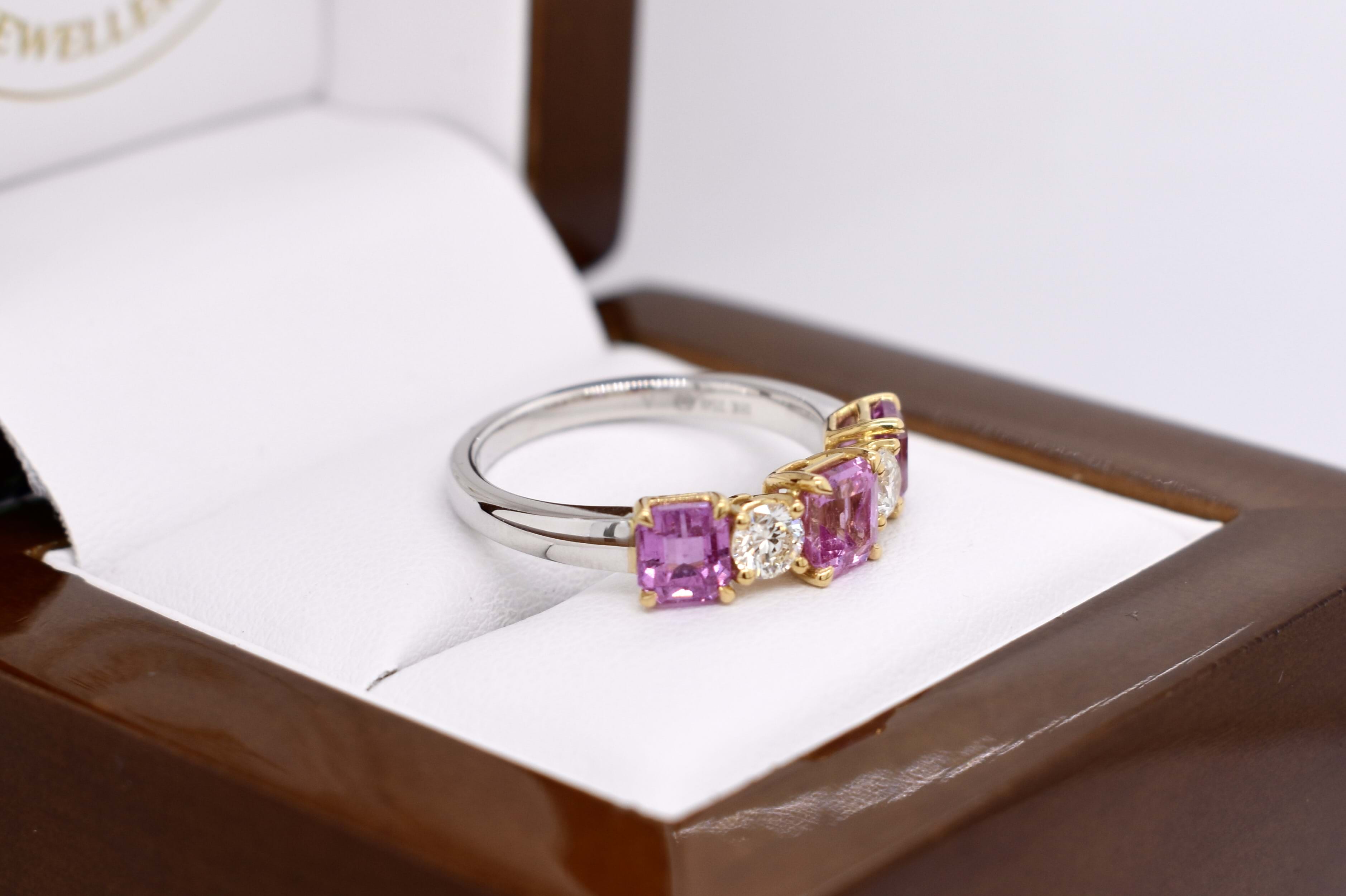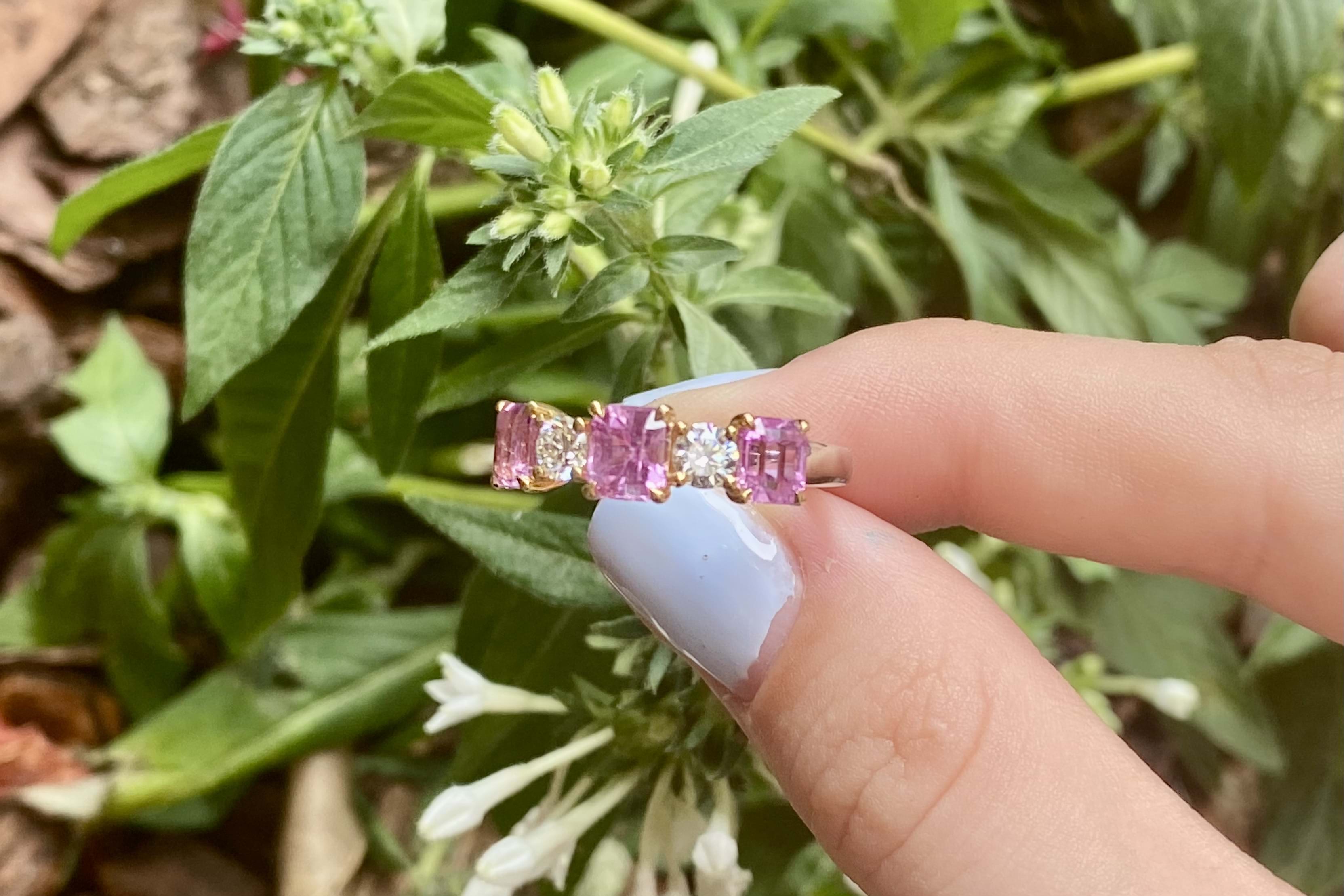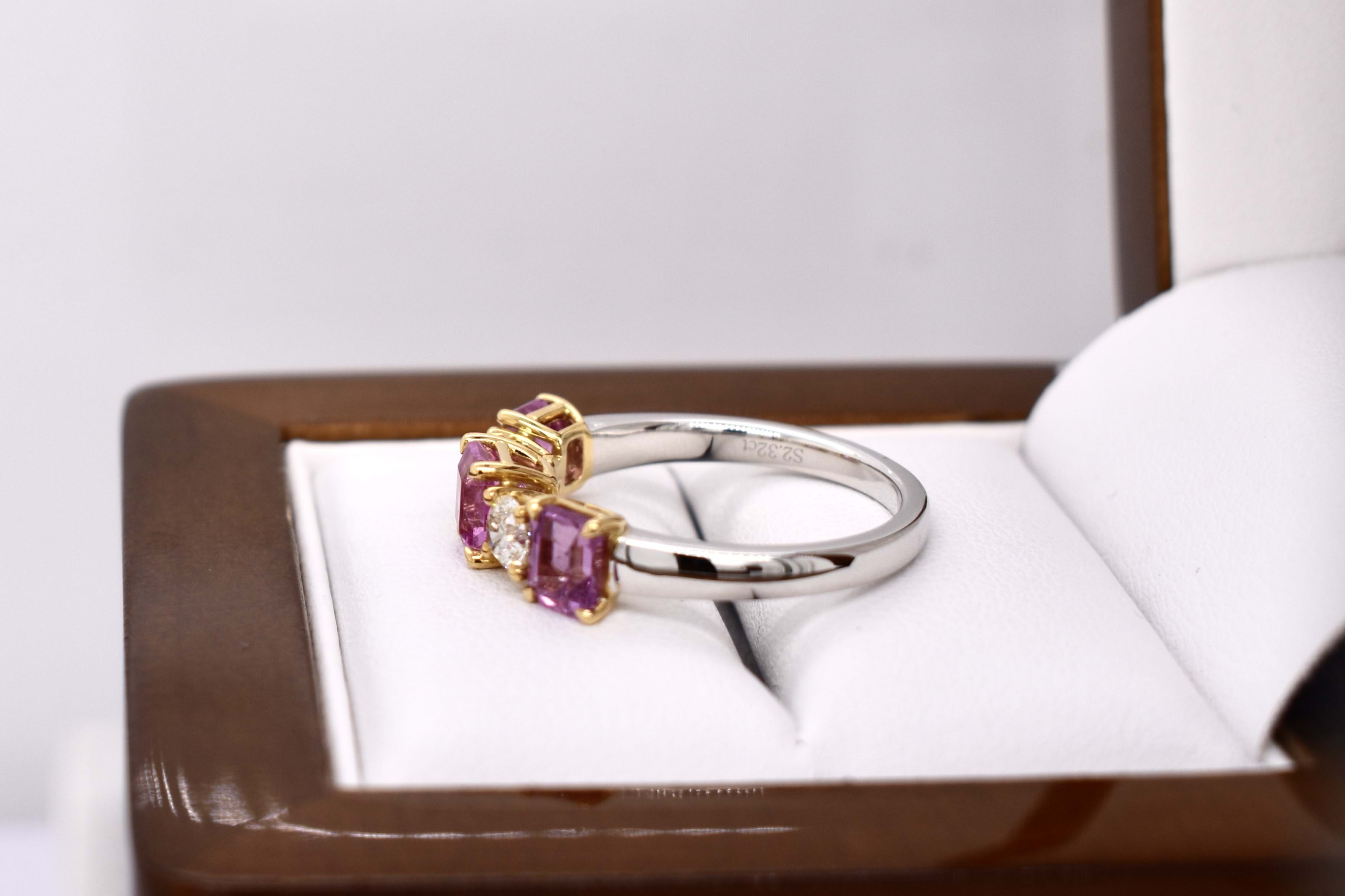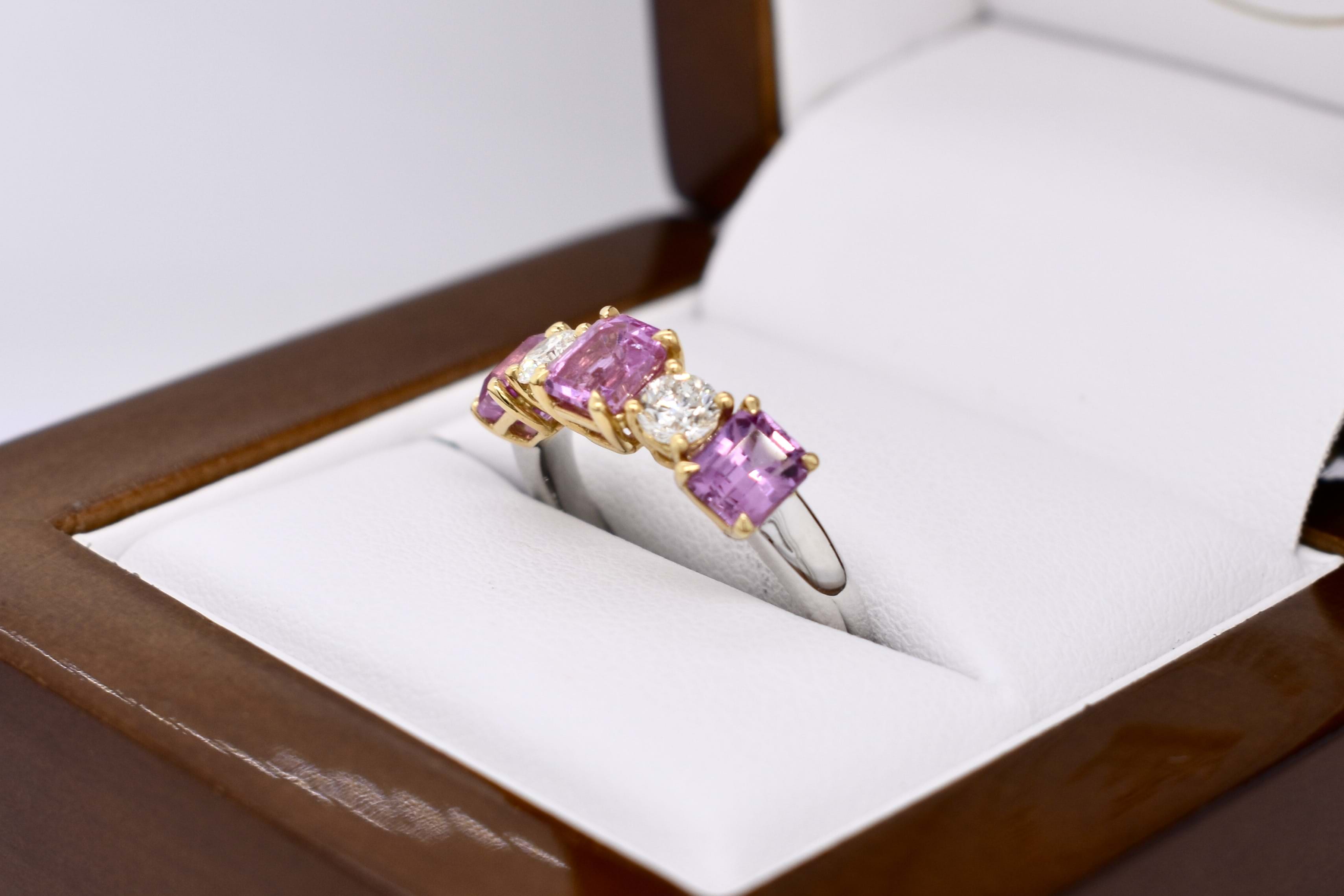 "Pretty and pink! This 18ct white gold ring features three bright pink emerald cut stones, totalling 2.32ct, four claw set with yellow gold claws. Alternating with the vibrant sapphires are two round brilliant cut diamonds, four claw set between, equalling 0.39ct GH SI. Completed on a plain white gold band. Finger size M. Independent Valuation available upon purchase.
