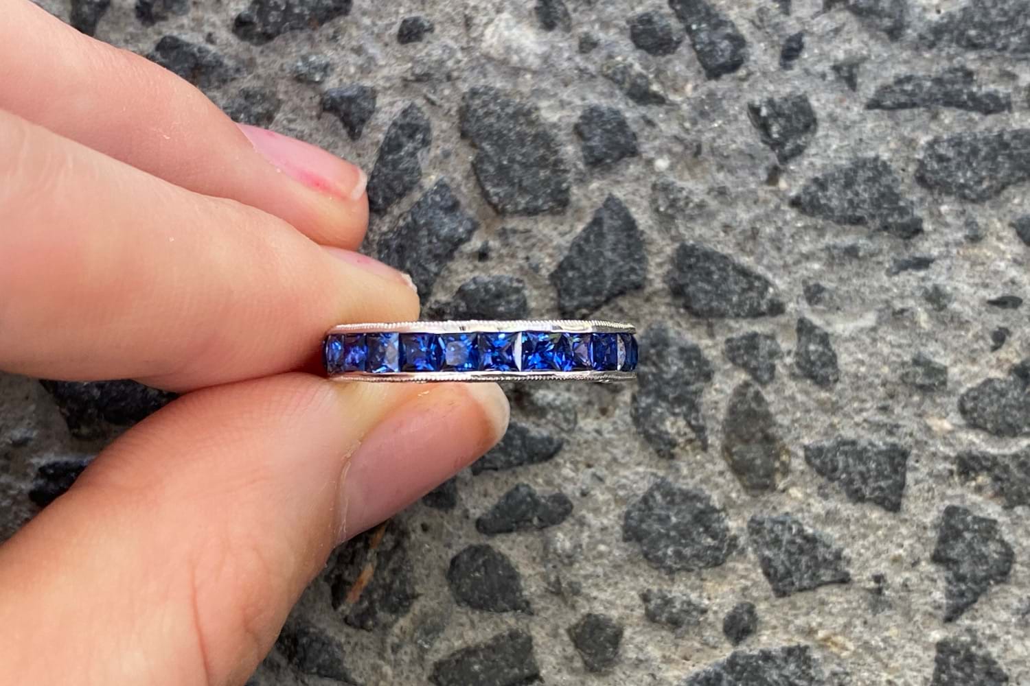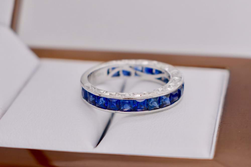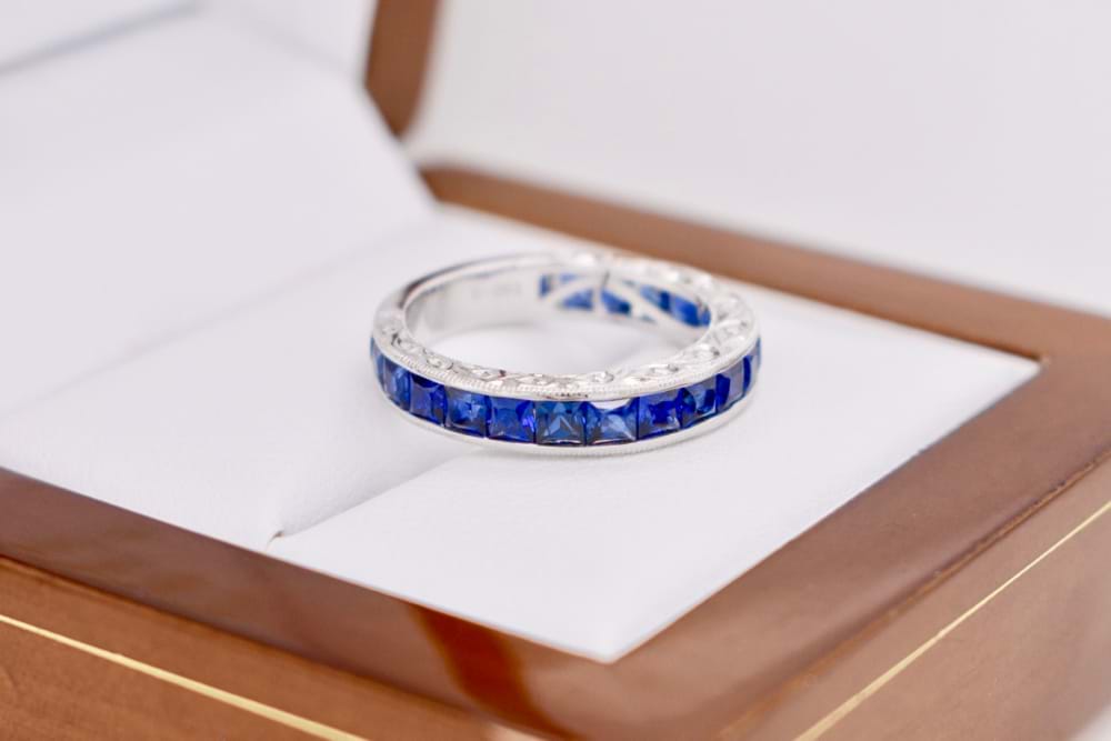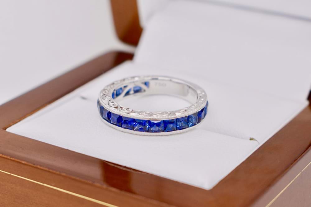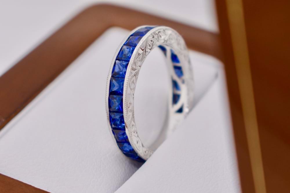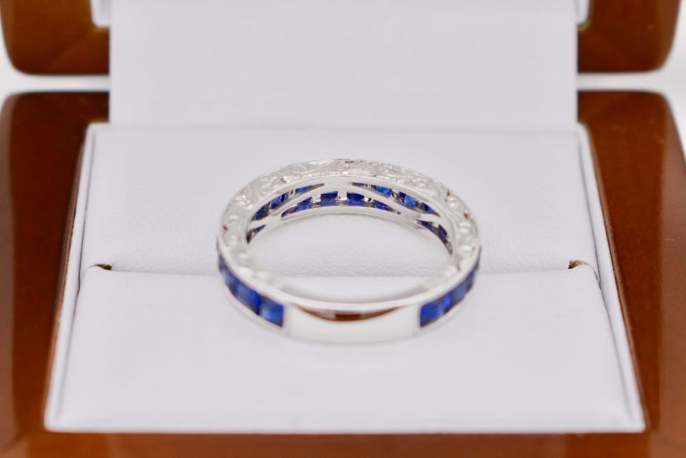 A spectacular design featuring 20 princess cut blue sapphires totaling 2.81cts, beautifully colour matched, and set into an 18ct white gold channel setting going 3/4 around the finger. With intricately engraved side profiles, the band has a plain section at the base for minimal resizing and for practicality. Finger size M+. Independent Valuation Supplied