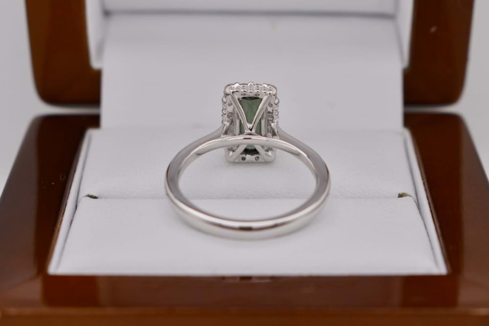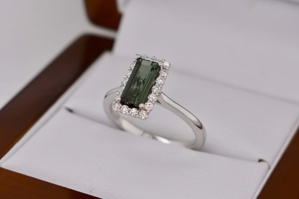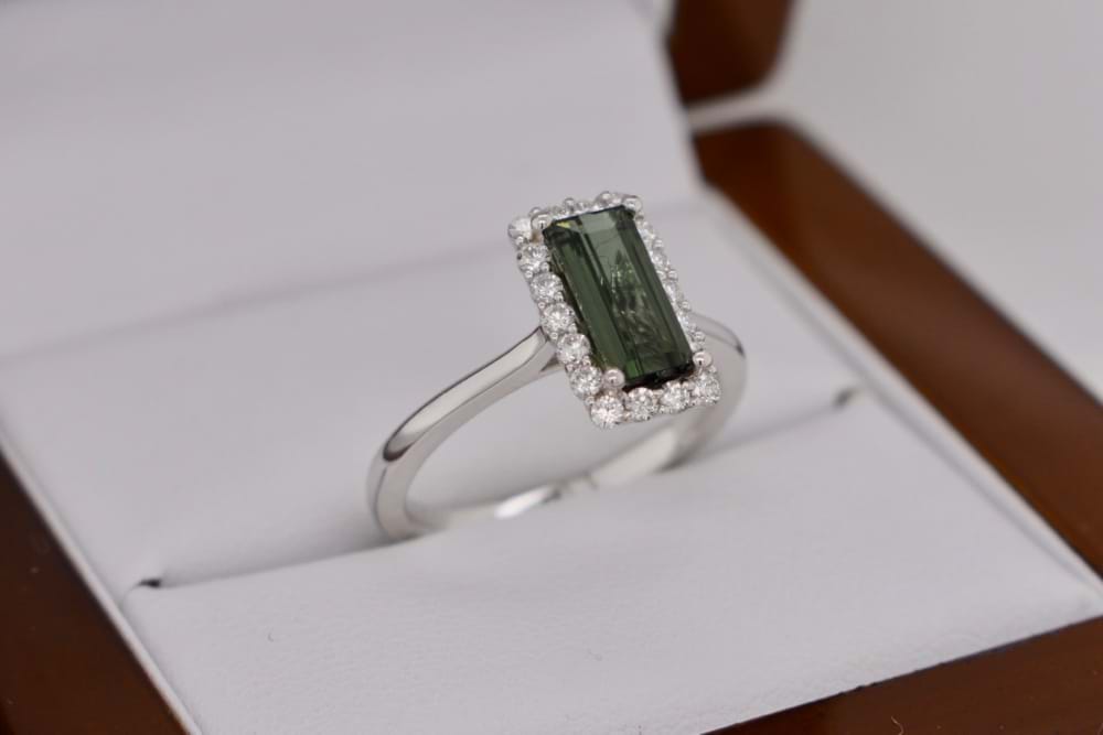 18ct white gold ring set with an elongated baguette cut olive green Tourmaline measuring 8.8 x 4.1mm weighing 1.15ct and surrounded by a halo of 18 diamonds, totalling 0.29ct. Finger size L 1/2. Independent valuation supplied