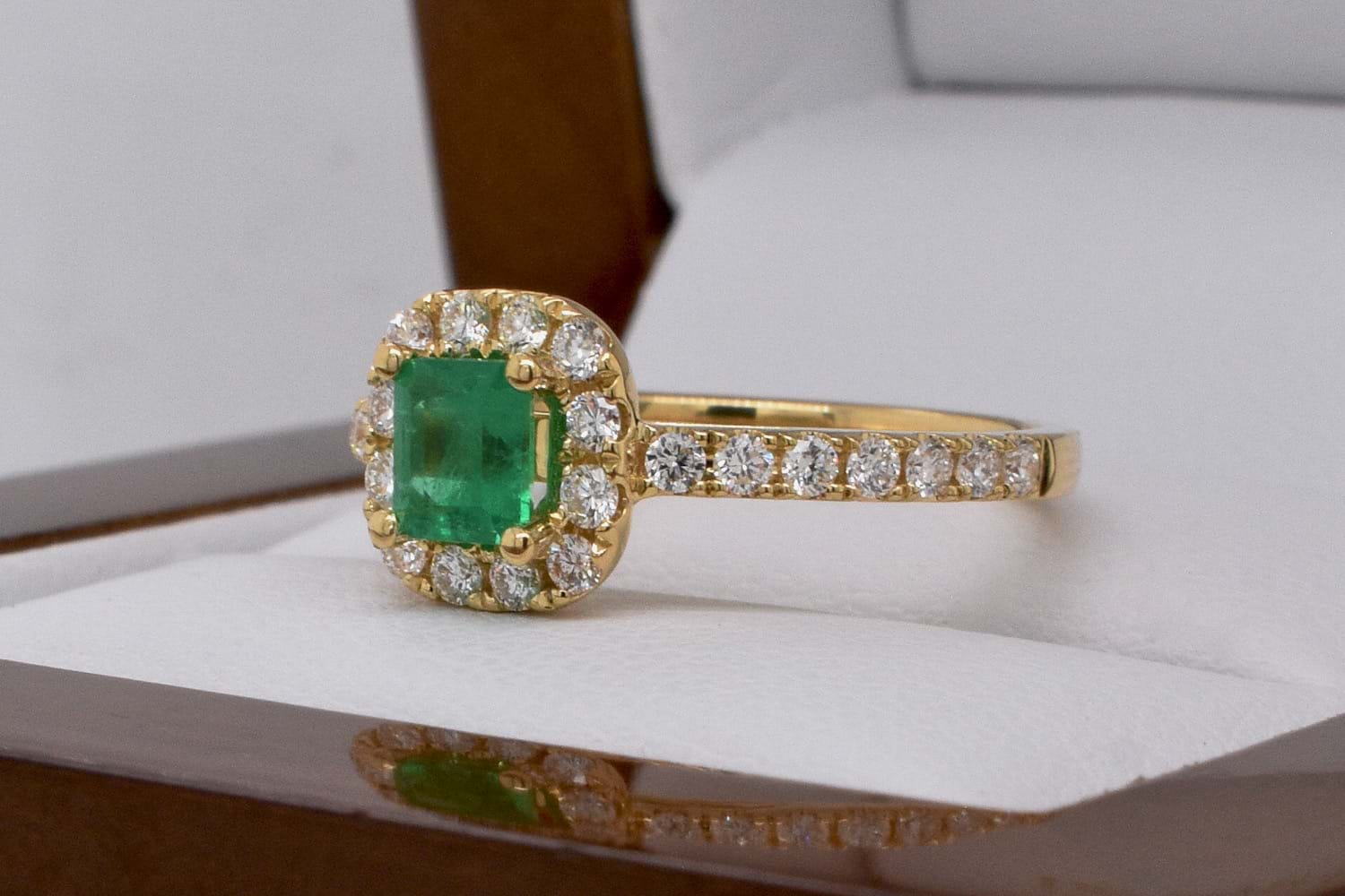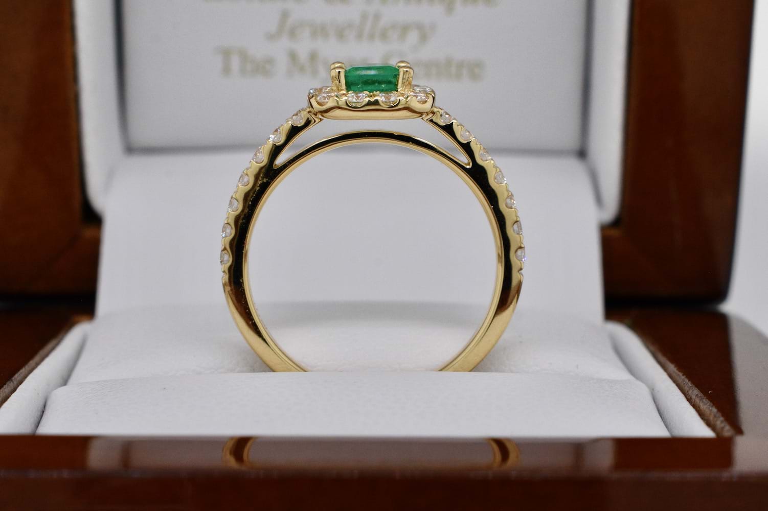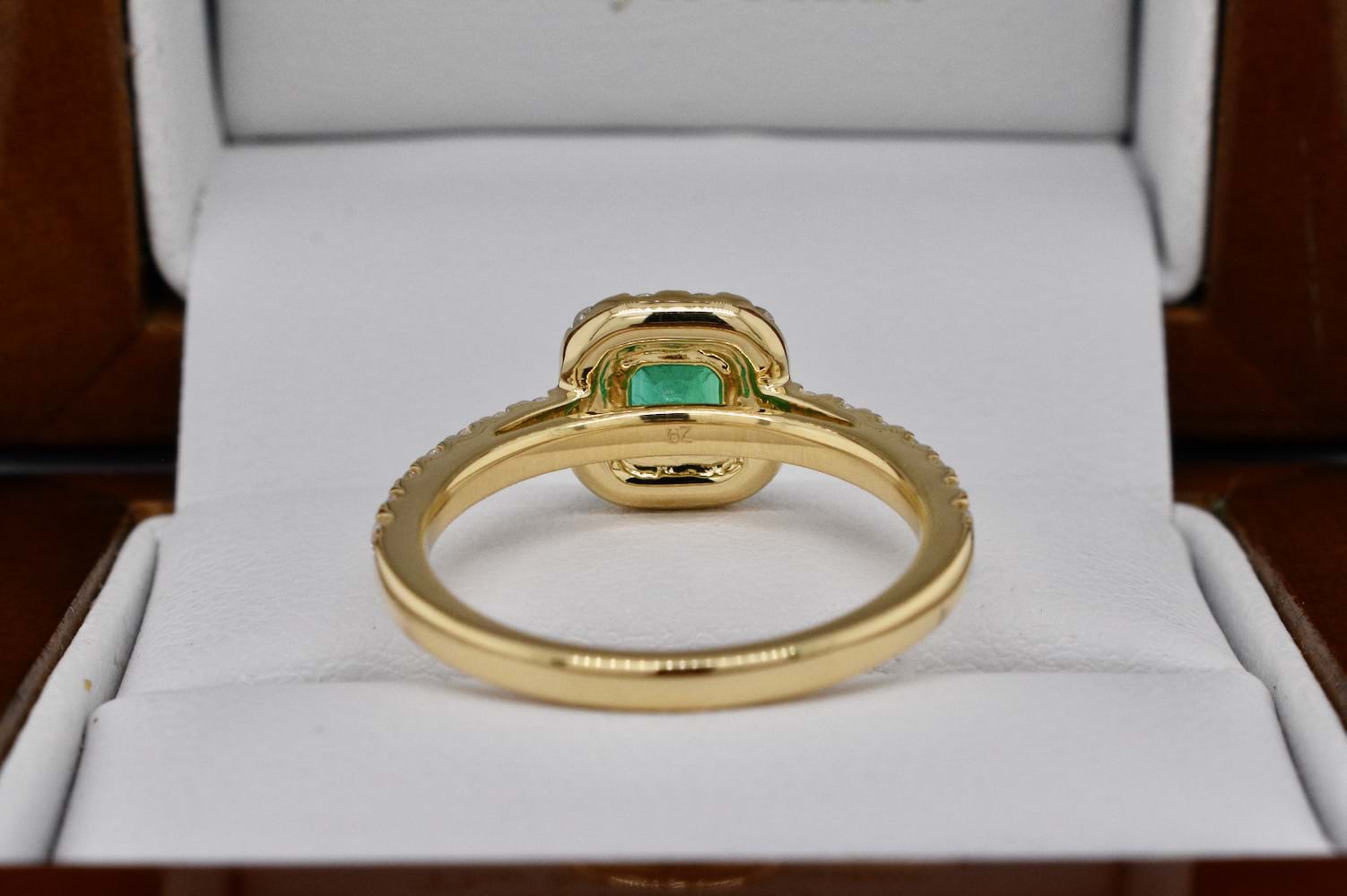 A stunning 0.46ct Colombian emerald in a square emerald cut hand chosen to be the feature of this 18ct yellow gold cushion shape halo ring. Containing 26 shimmering round brilliant cut diamonds both in the halo and down the shoulders totalling 0.44cts GVS-SI, this ring will sit perfectly with diamond bands. Finger size M. Independent Valuation Supplied