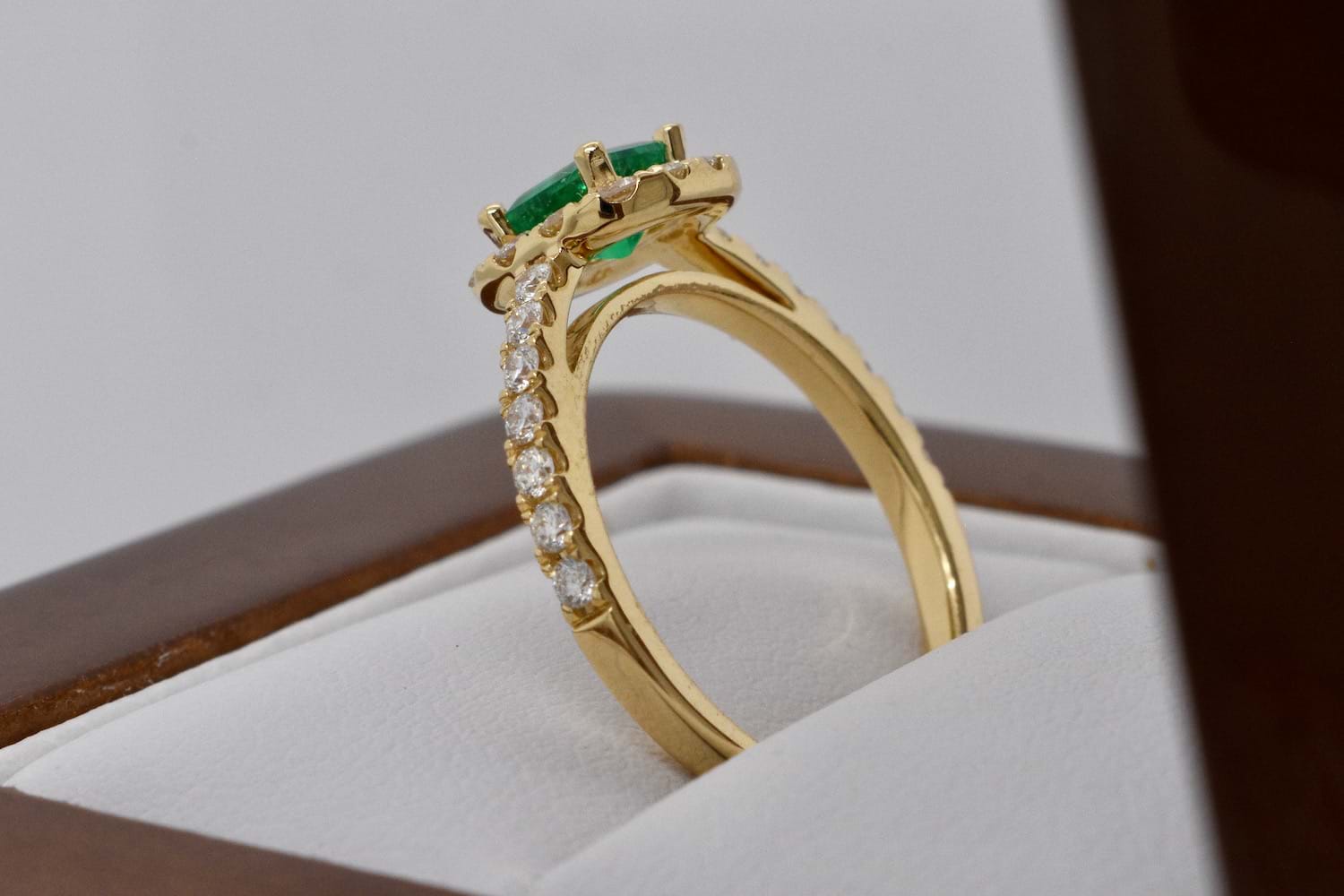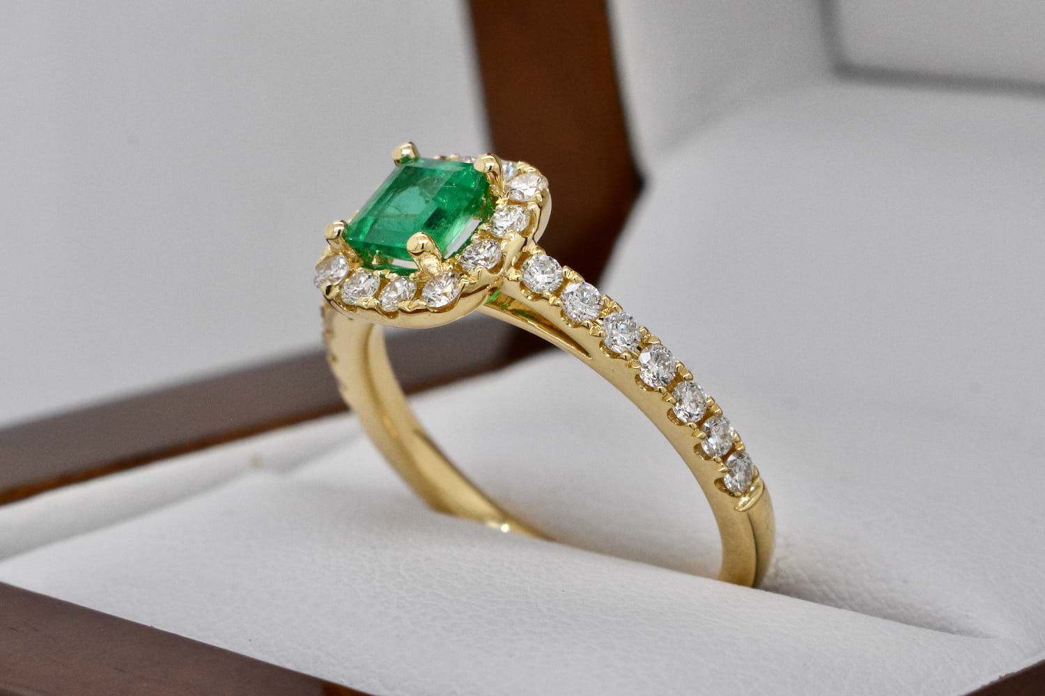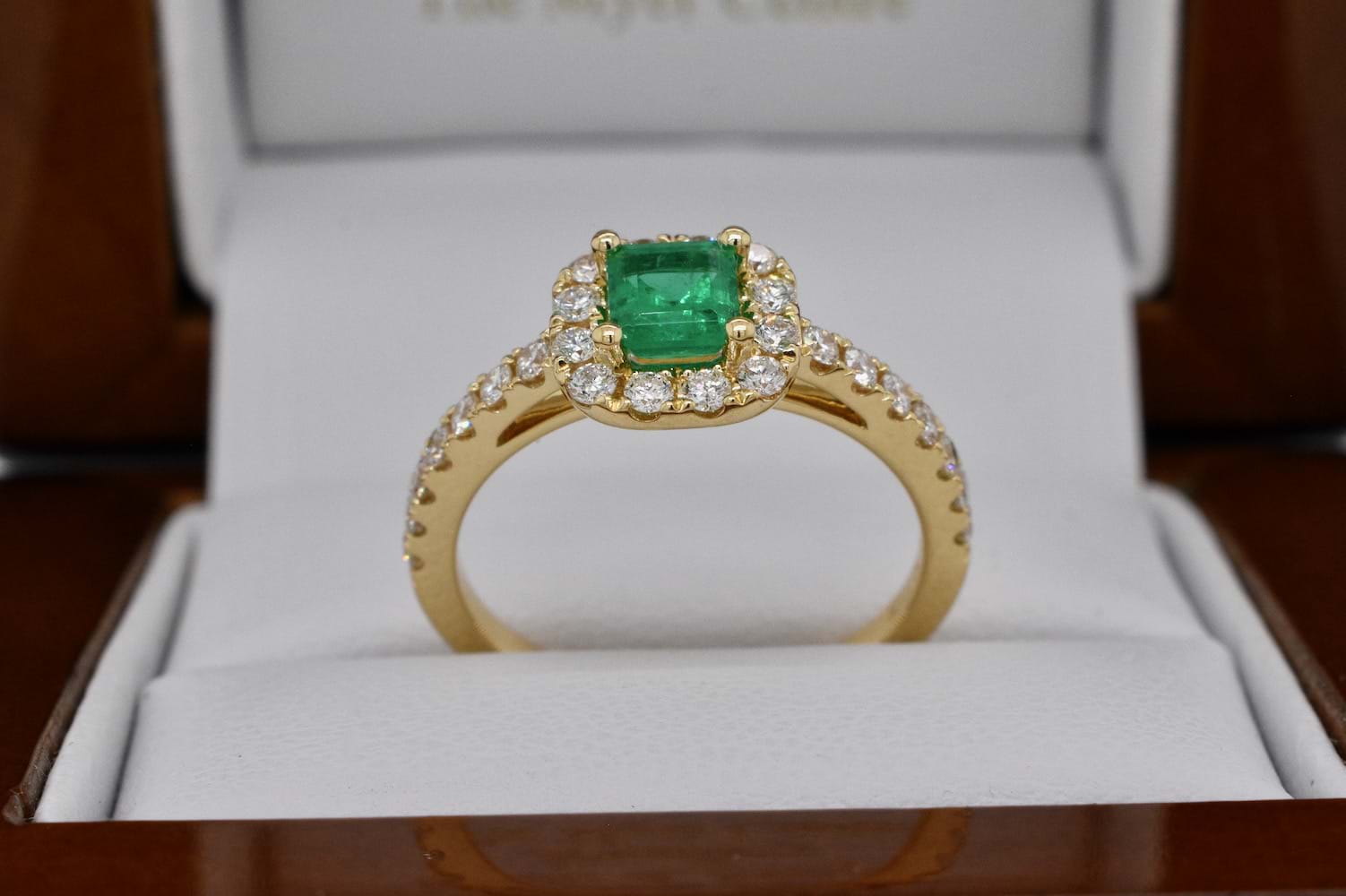 A stunning 0.46ct Colombian emerald in a square emerald cut hand chosen to be the feature of this 18ct yellow gold cushion shape halo ring. Containing 26 shimmering round brilliant cut diamonds both in the halo and down the shoulders totalling 0.44cts GVS-SI, this ring will sit perfectly with diamond bands. Finger size M. Independent Valuation Supplied