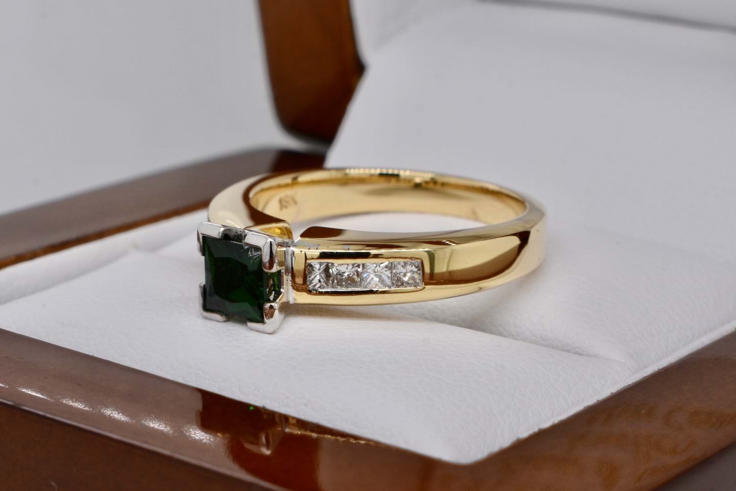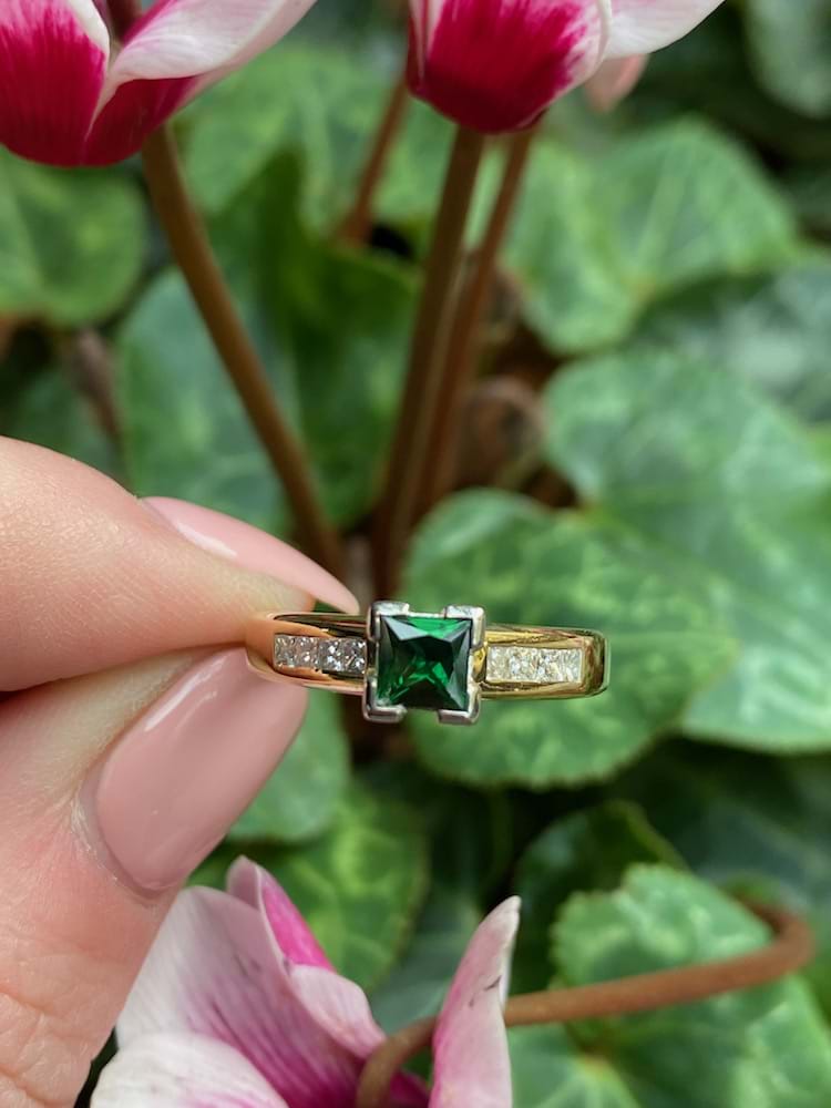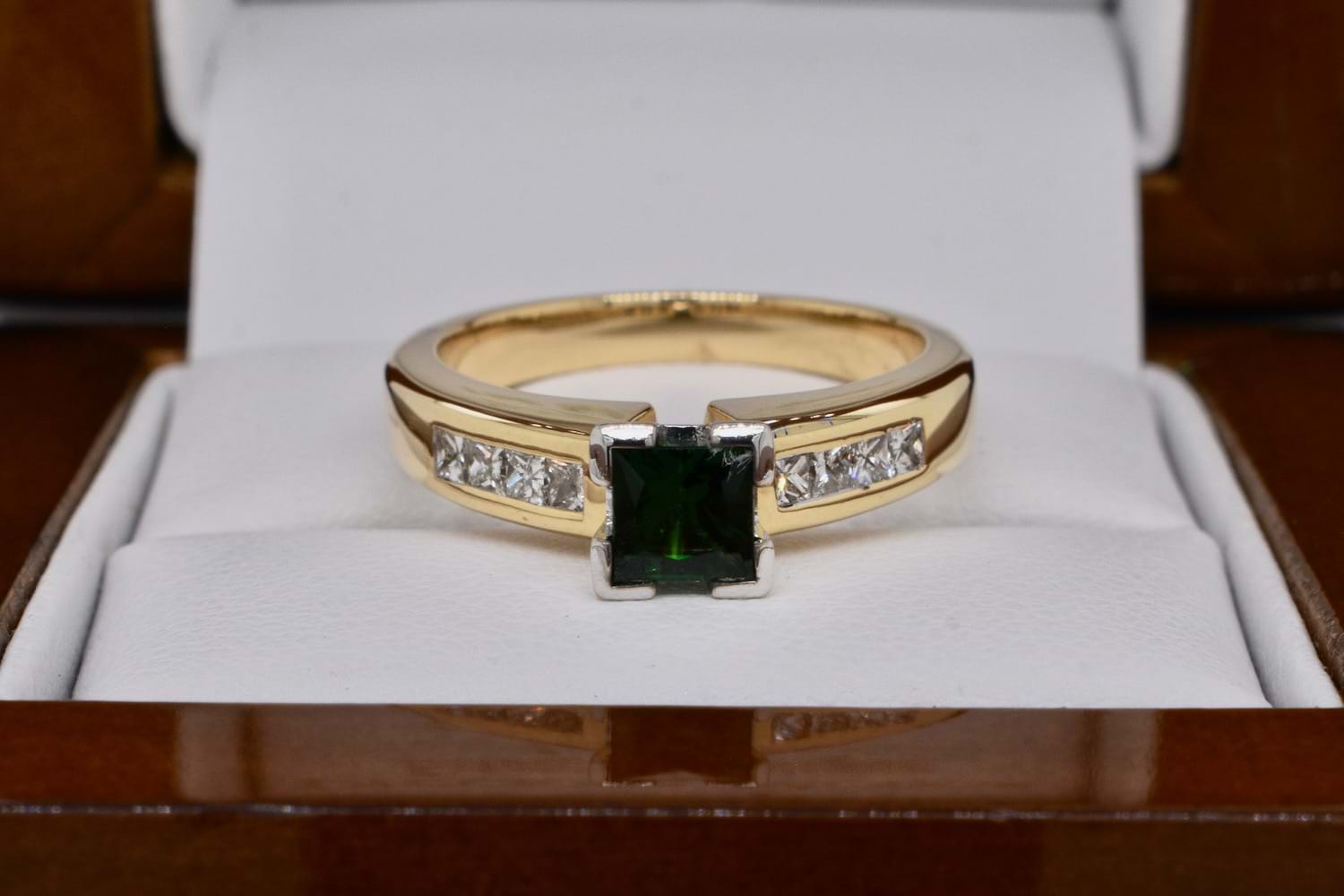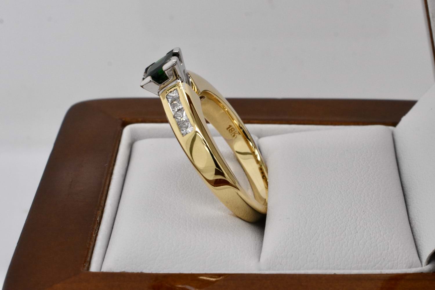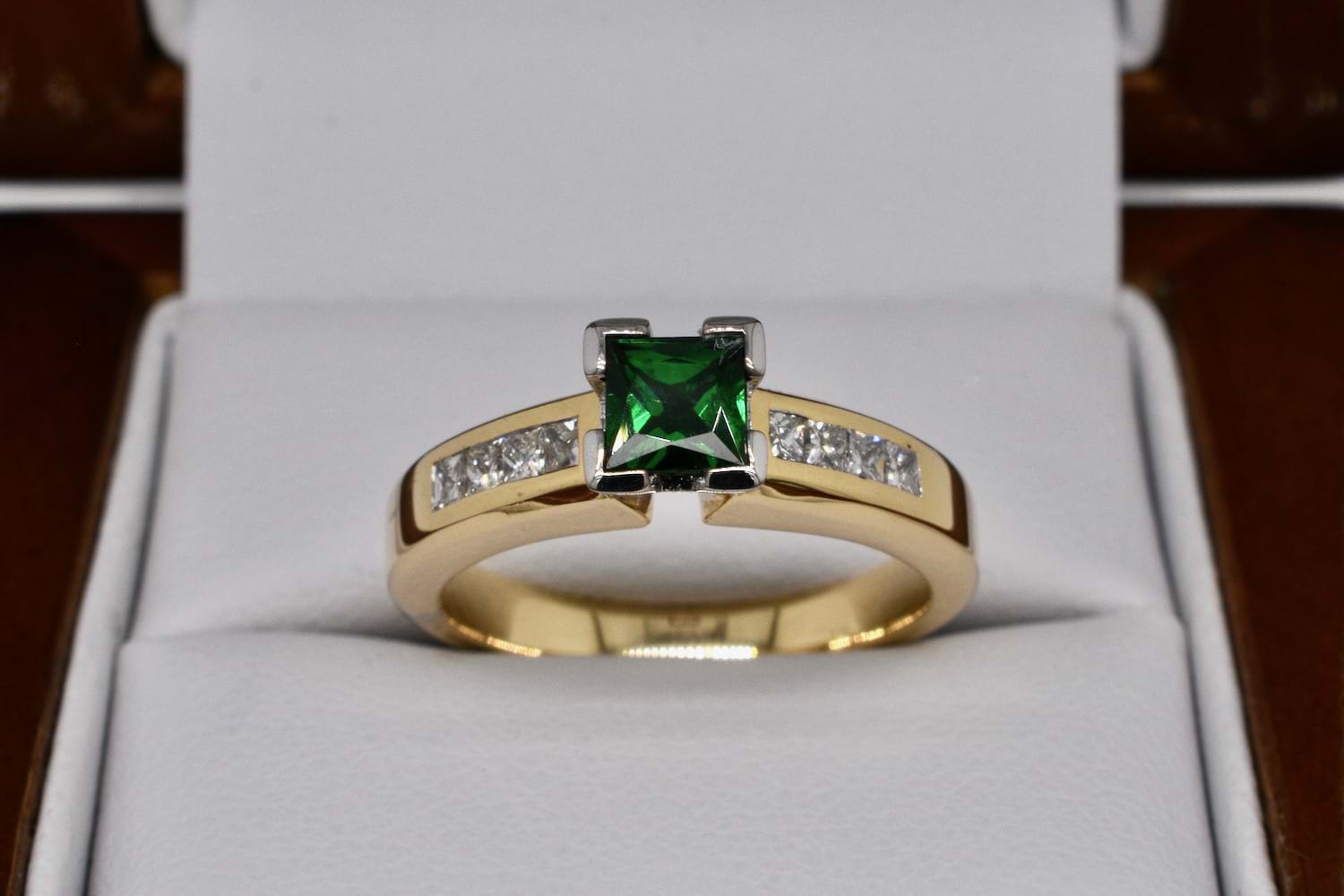 A striking bright dark green Tsavorite garnet of 0.50cts set into four 18ct white gold corner caps on a solid, old school, 18ct yellow gold band with channel set princess cut diamonds on each shoulder. The ring contains a total of eight princess cut diamonds equaling 0.30cts GH/SI, and will sit well with bands or alone. Finger size N+. Independent Valuation Supplied