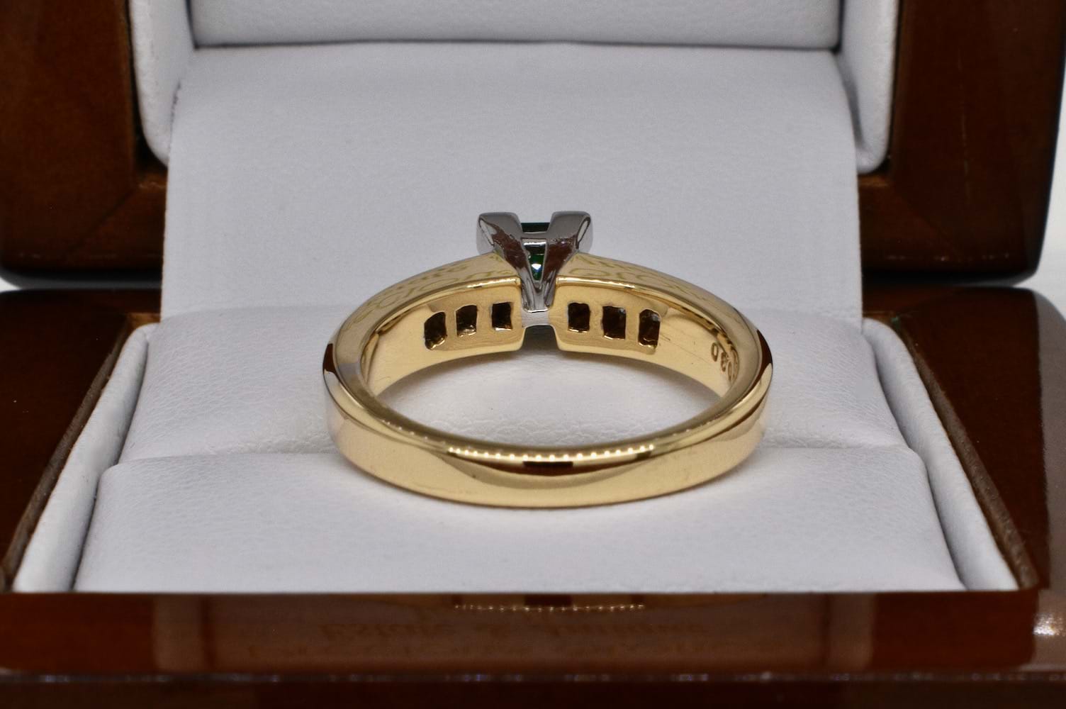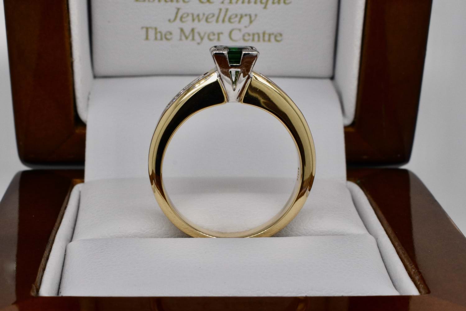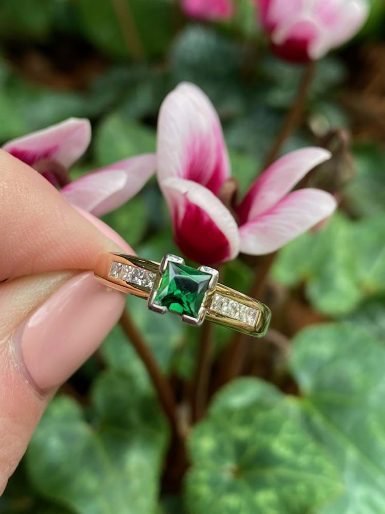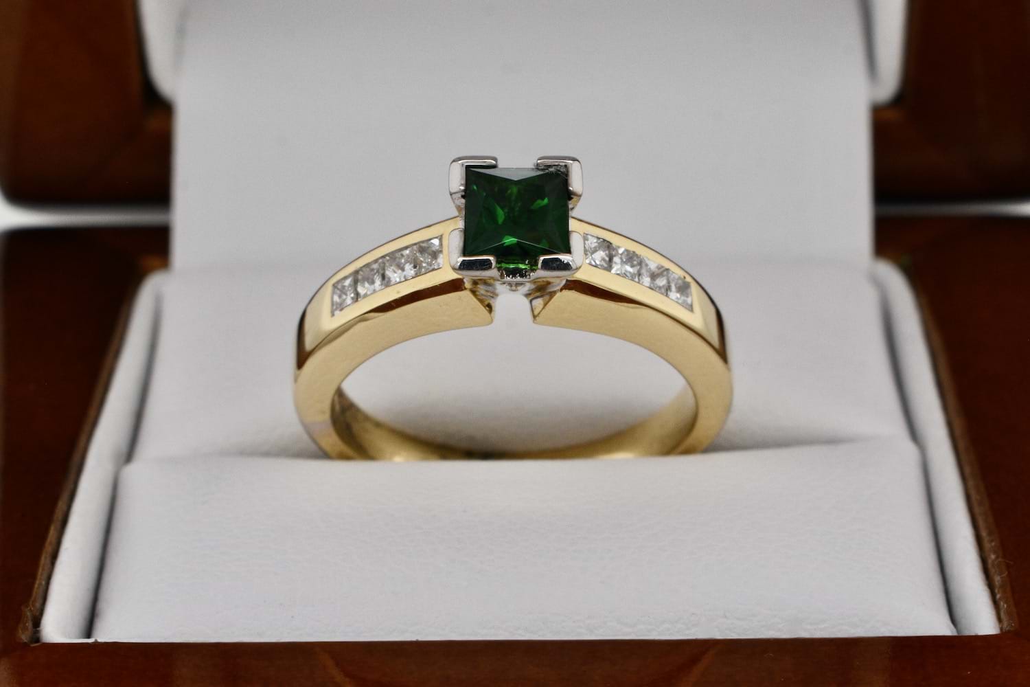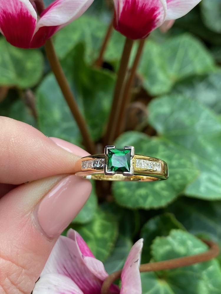 A striking bright dark green Tsavorite garnet of 0.50cts set into four 18ct white gold corner caps on a solid, old school, 18ct yellow gold band with channel set princess cut diamonds on each shoulder. The ring contains a total of eight princess cut diamonds equaling 0.30cts GH/SI, and will sit well with bands or alone. Finger size N+. Independent Valuation Supplied