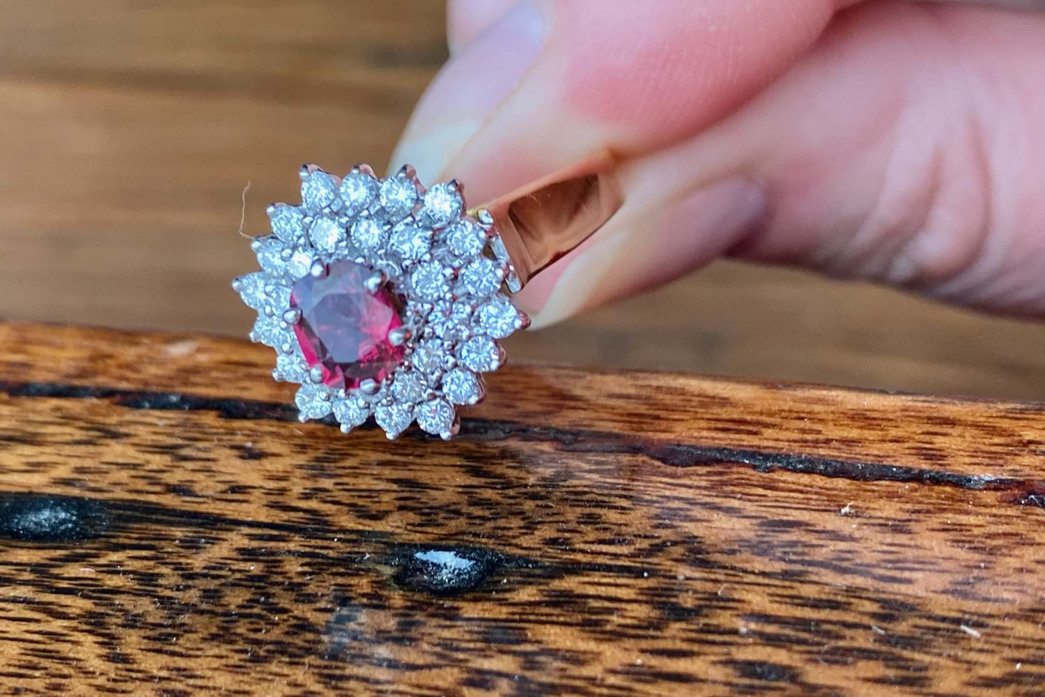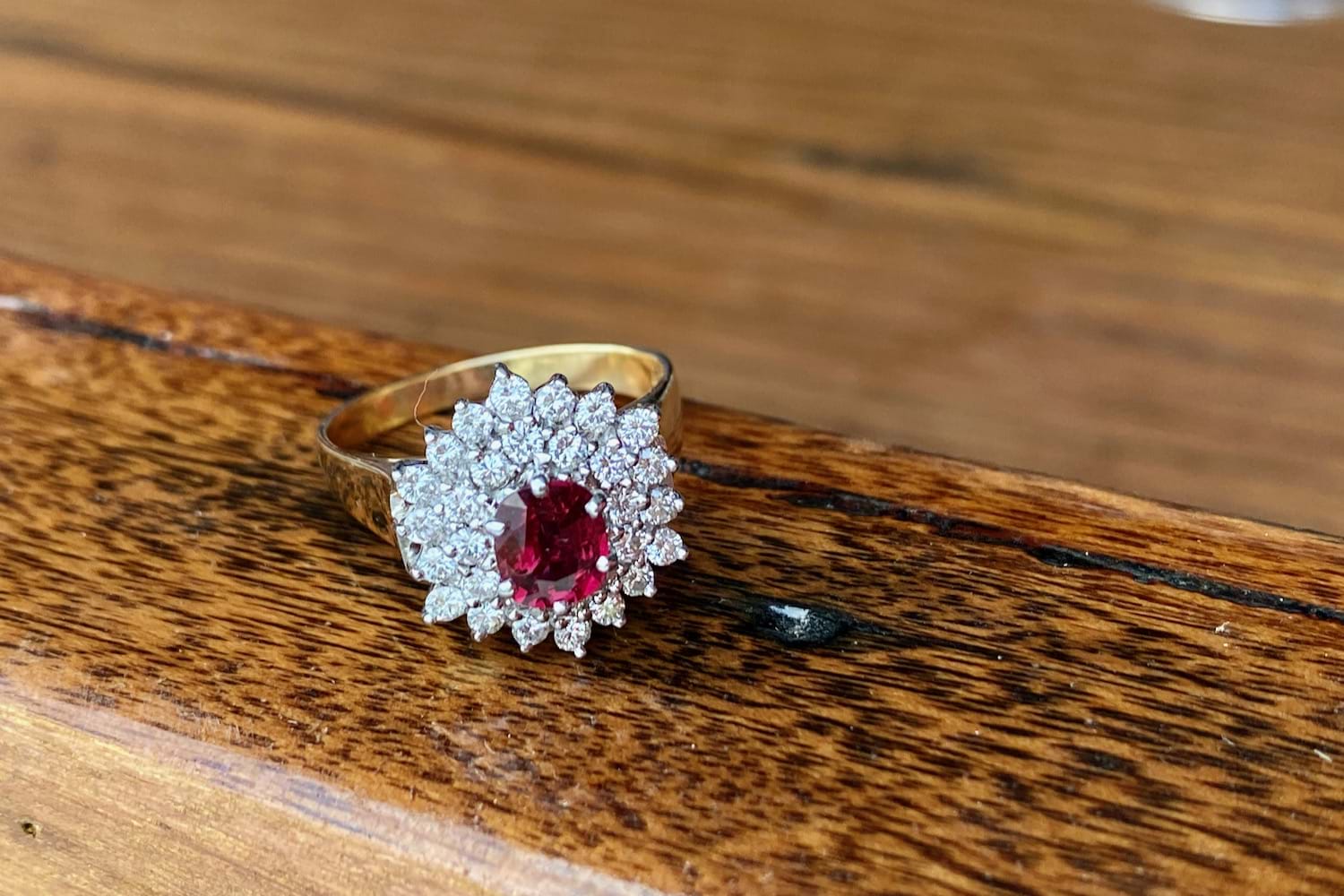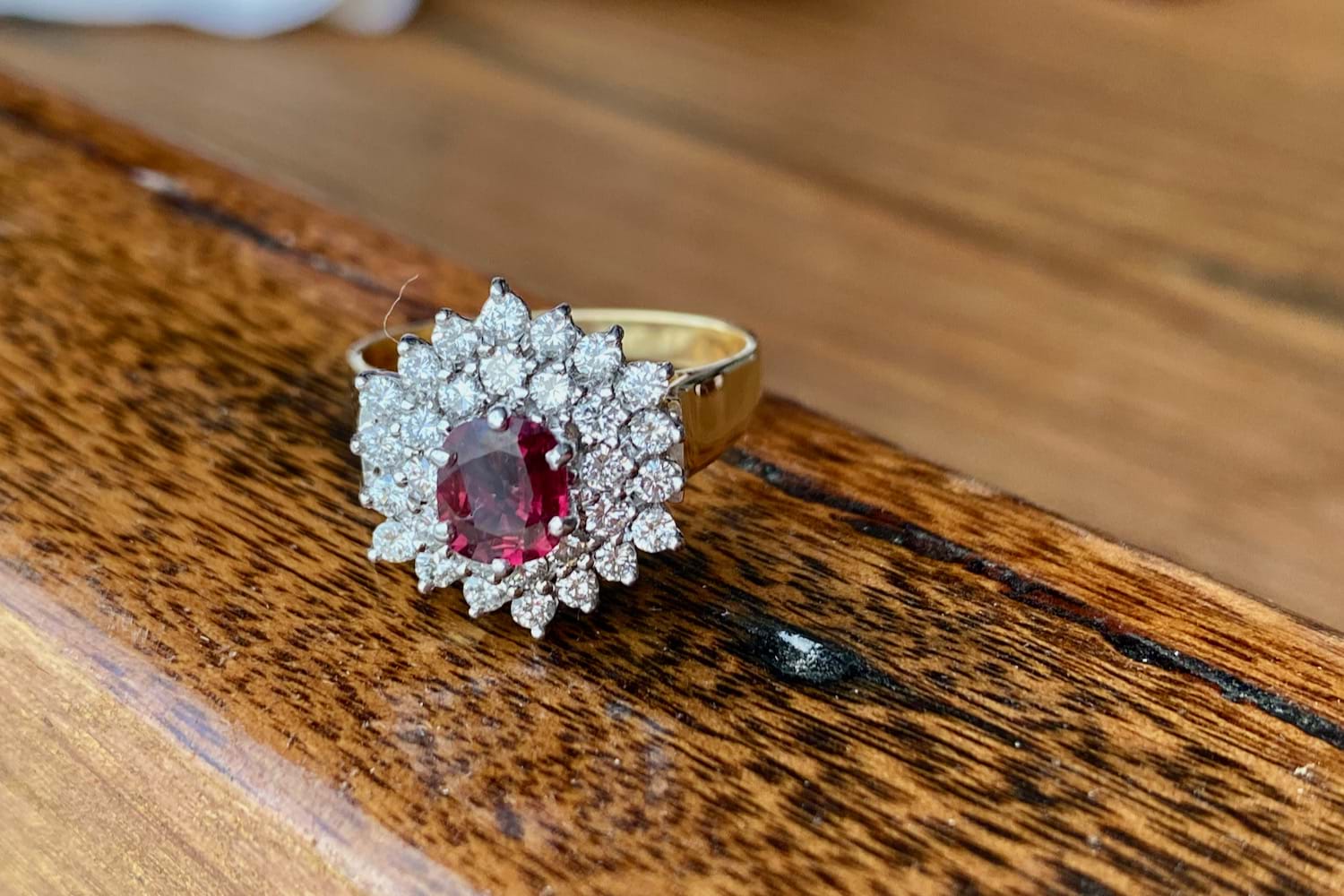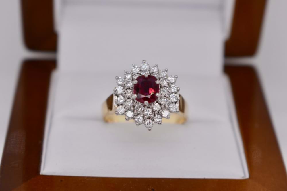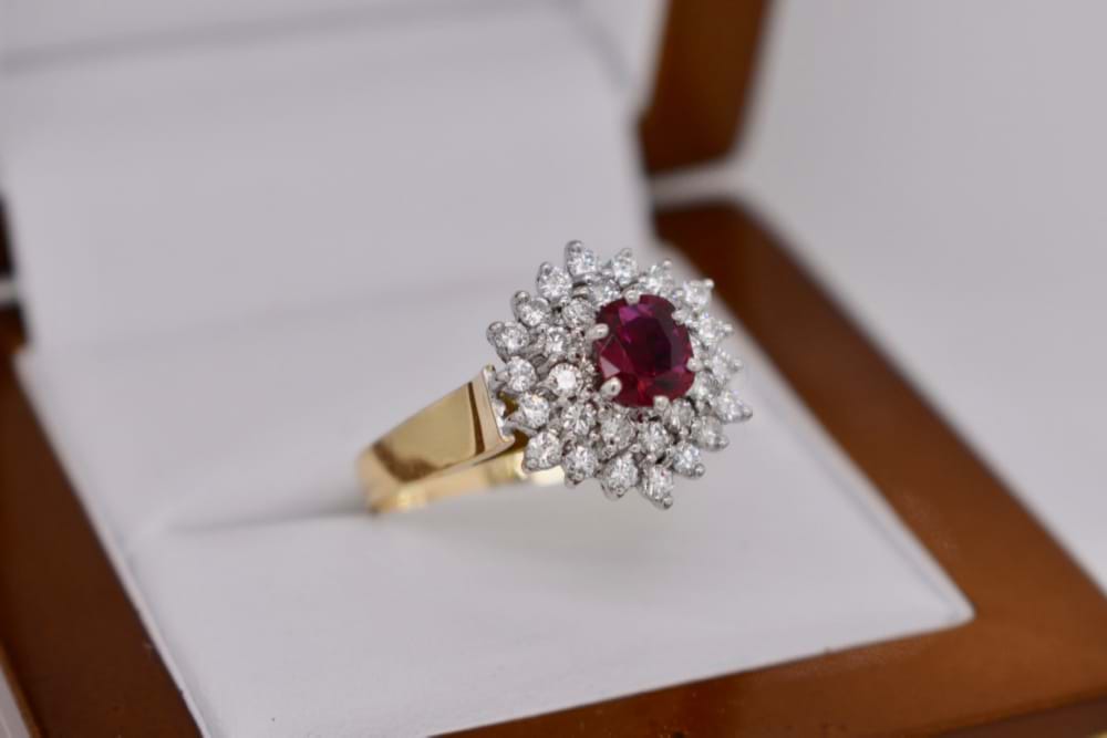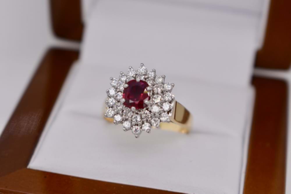 In the centre of this gorgeous vintage / estate ring is a 0.90ct oval deep purpish red natural Ruby surrounded by a stunning burst of 38 white, round brilliant cut Diamonds totalling 0.59ct. The band is 18ct yellow gold with swept up shoulders. Finger size R