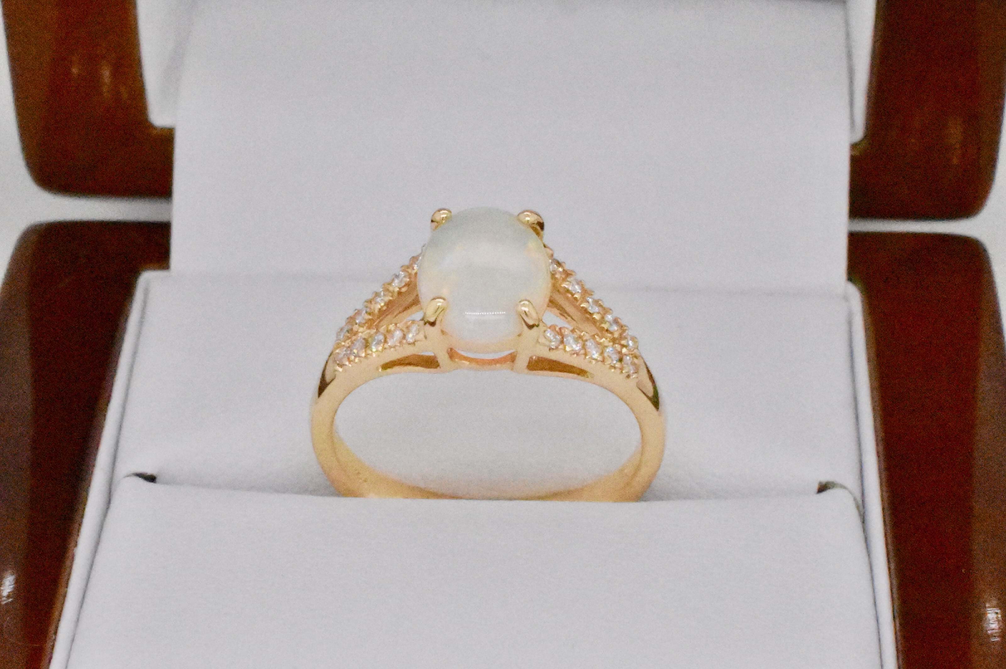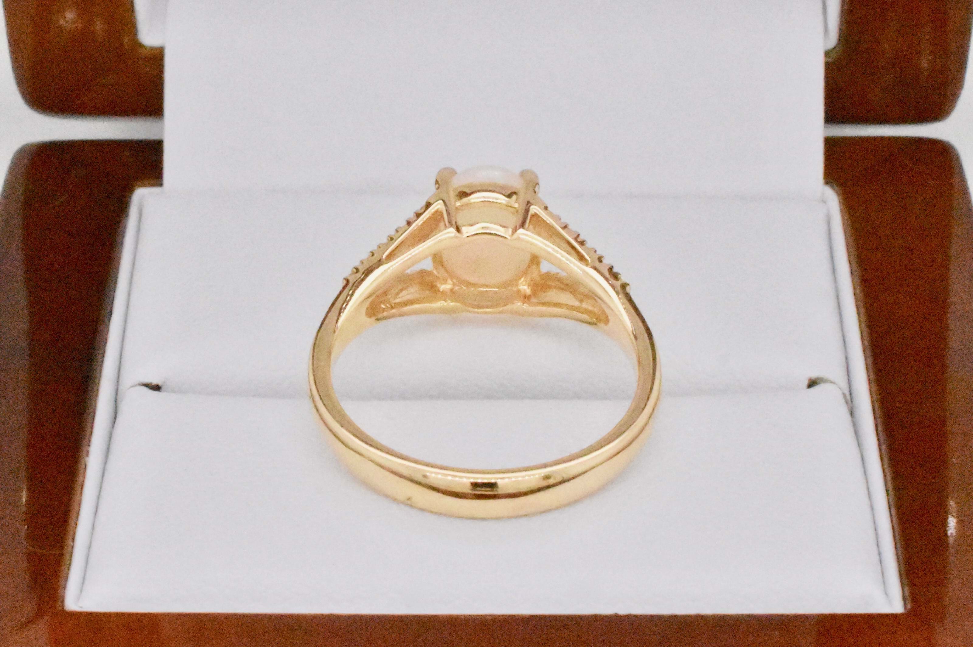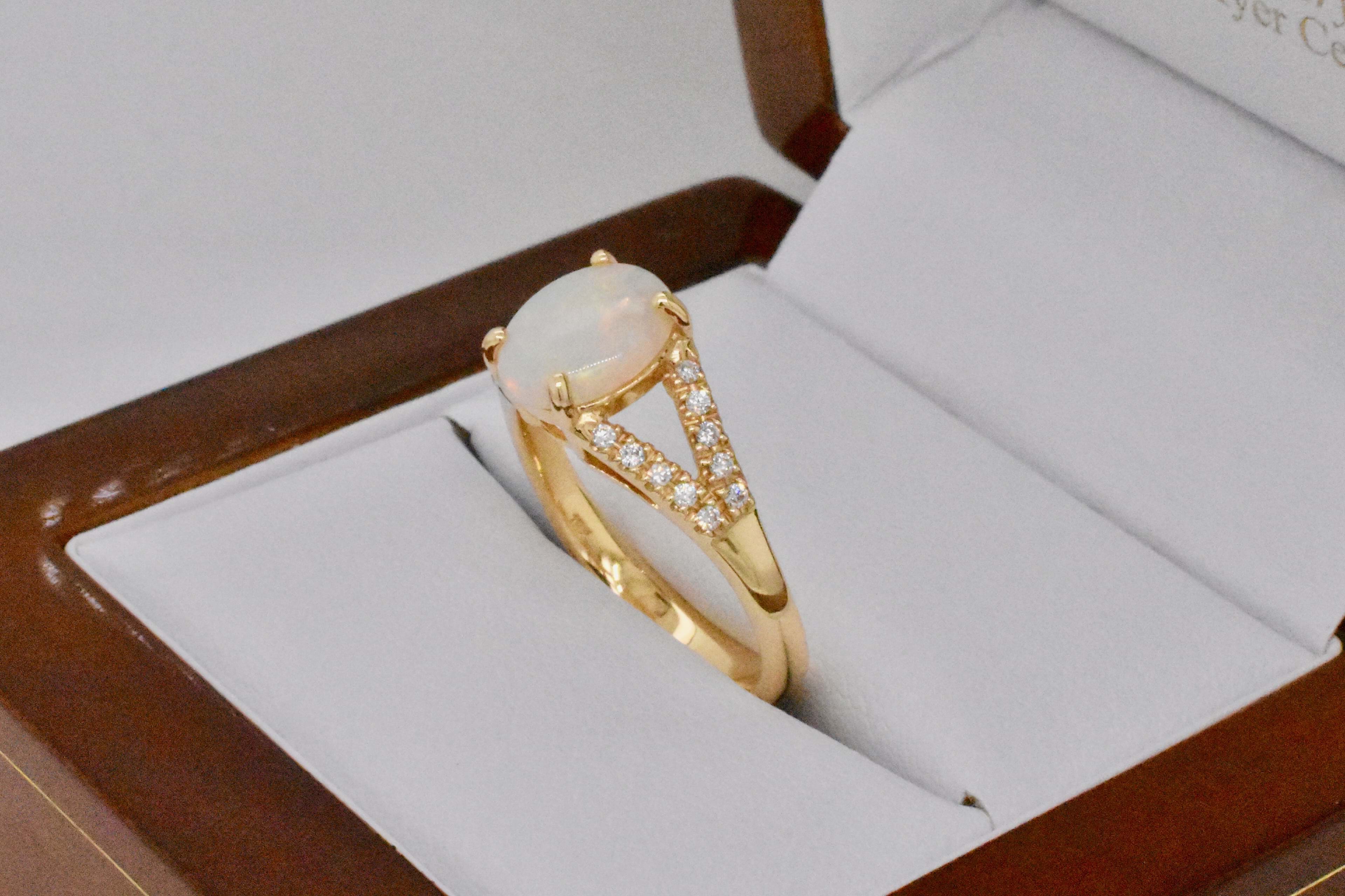A 1.05ct white opal crystal with orange, pink, blue and green flashes set into a four flaw 18ct yellow gold ring with split shoulders set with sparkling round brilliant cut diamonds. Total diamond content equals 0.16cts. Independent Valuation Supplied