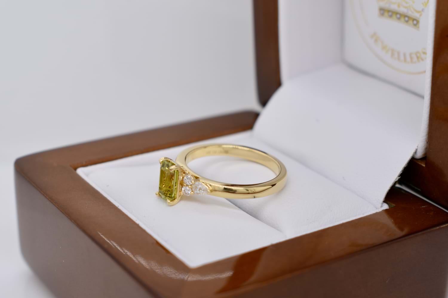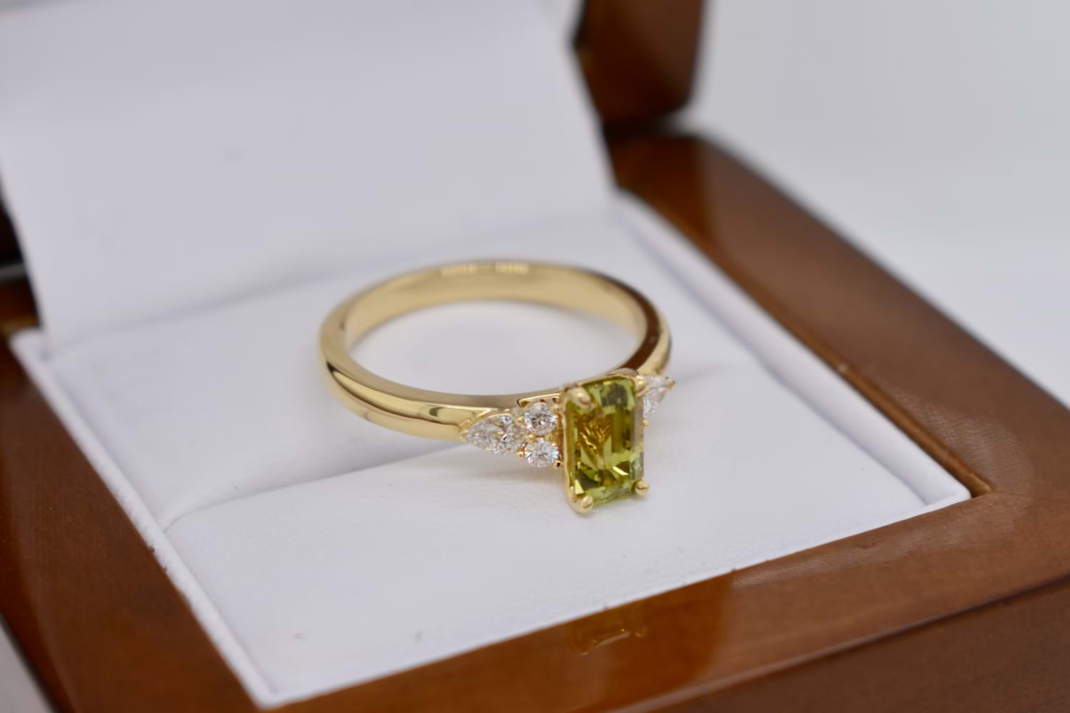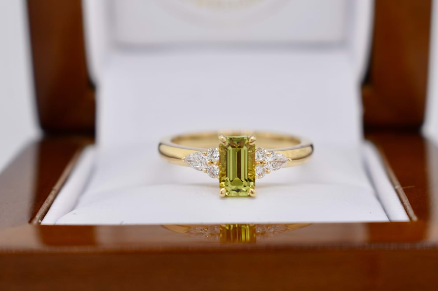 This gorgeous ring is made in 18ct yellow gold and set with a centre 1.10ct emerald cut greenish yellow Australian sapphire in four fine claws, with an elegant complement of pear shape and RBC diamonds to the shoulders with six totalling 0.24ct FG/VS, on a plain band. This ring has been designed to either be worn on its own or sit flush with other bands. Finger size M