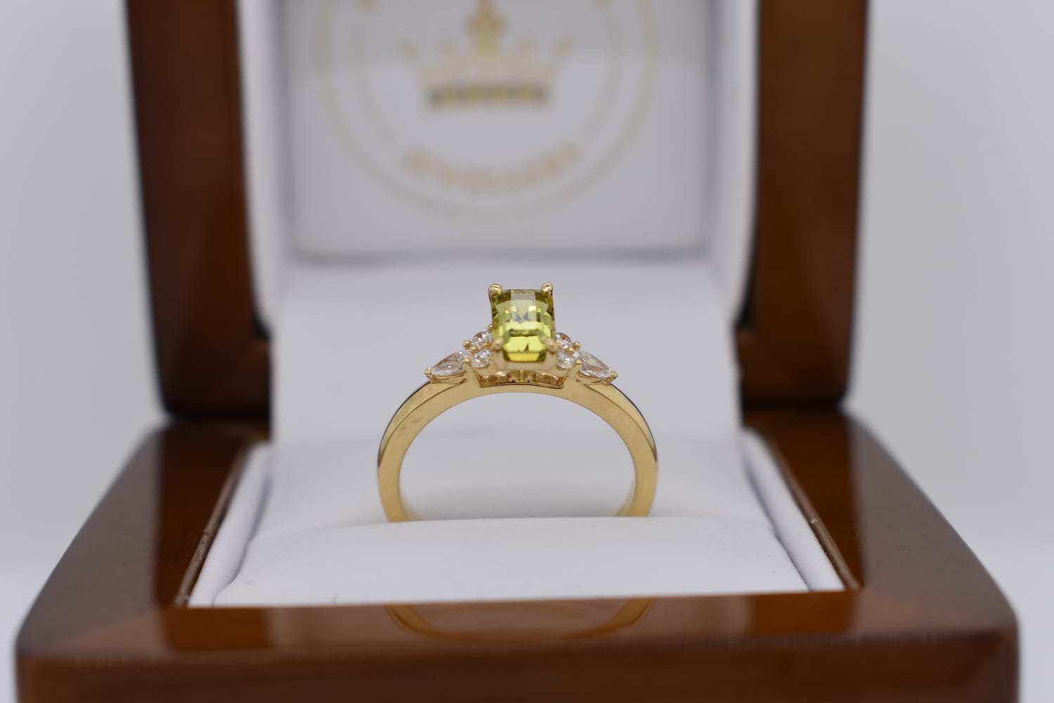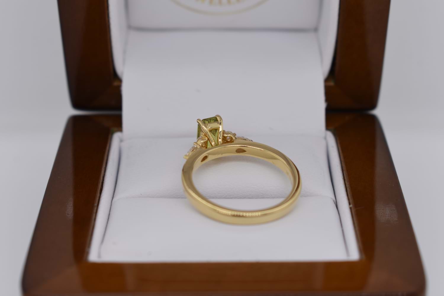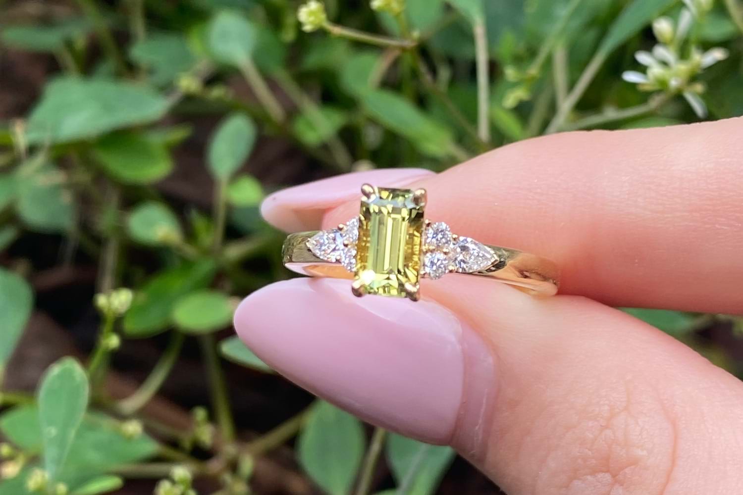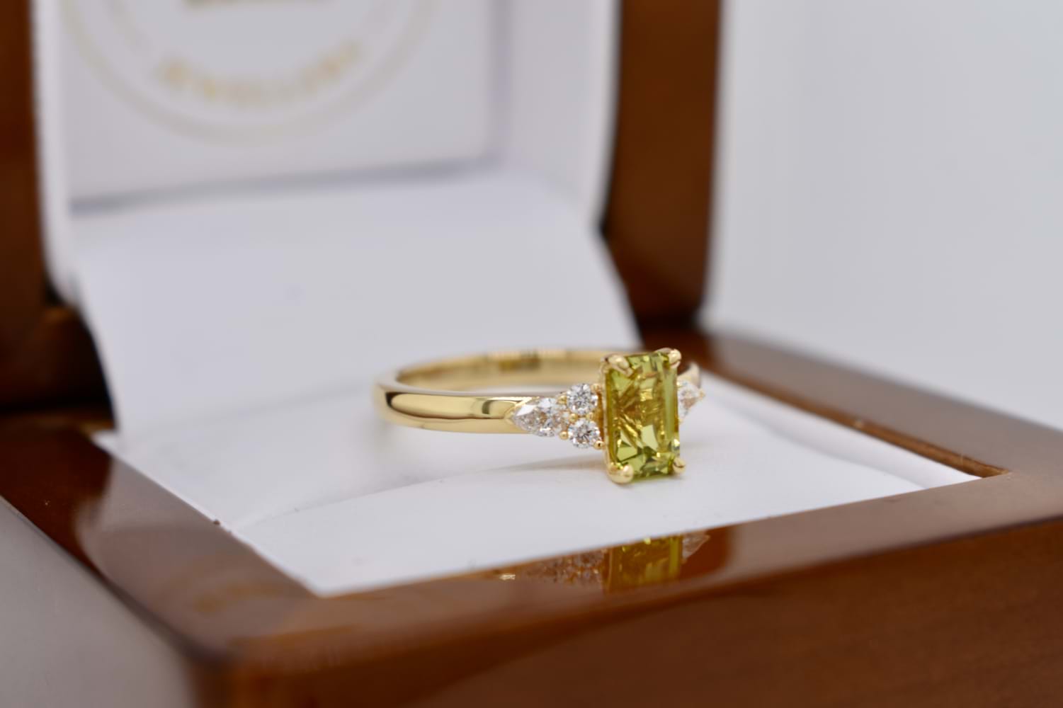 This gorgeous ring is made in 18ct yellow gold and set with a centre 1.10ct emerald cut greenish yellow Australian sapphire in four fine claws, with an elegant complement of pear shape and RBC diamonds to the shoulders with six totalling 0.24ct FG/VS, on a plain band. This ring has been designed to either be worn on its own or sit flush with other bands. Finger size M