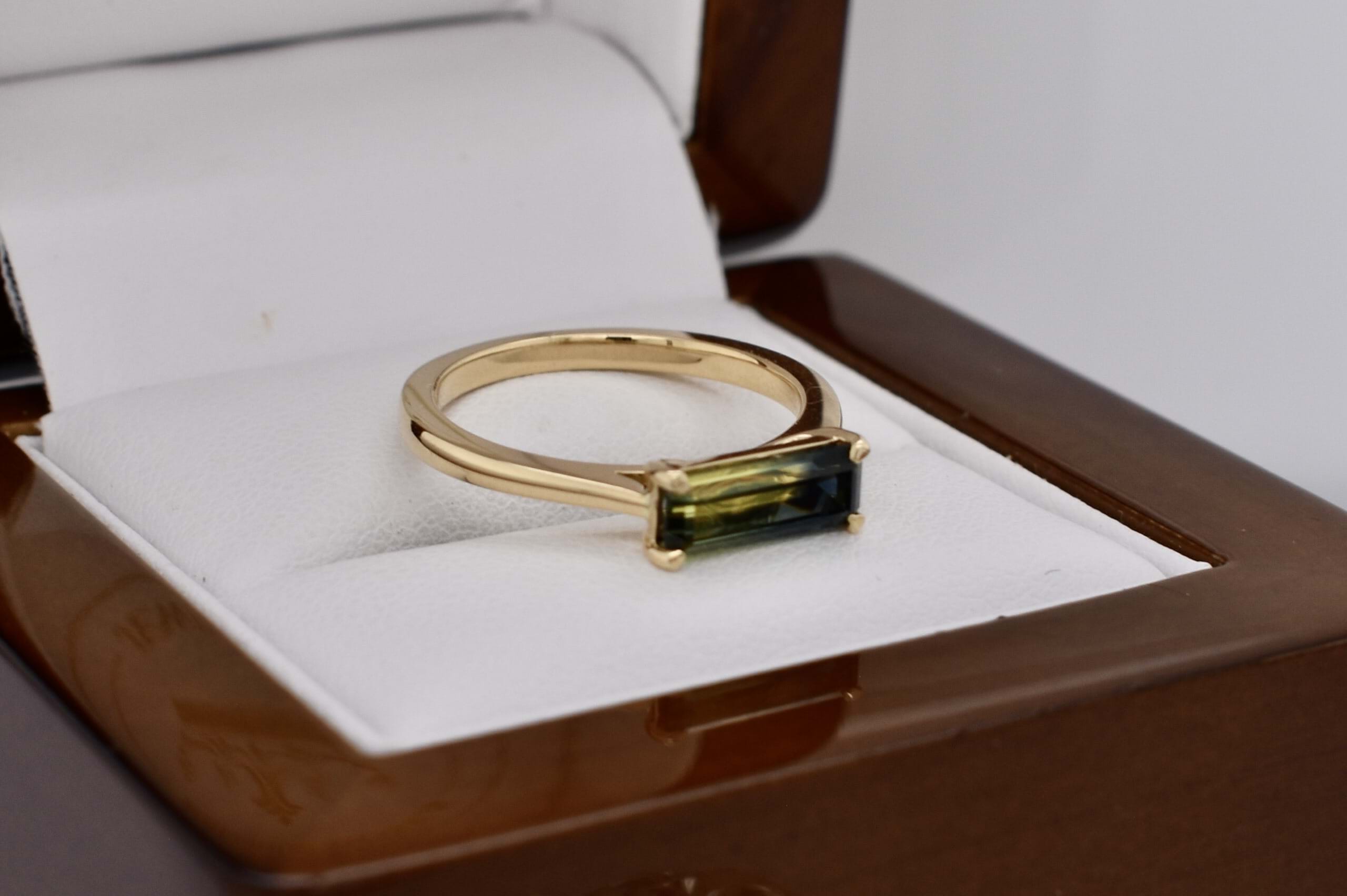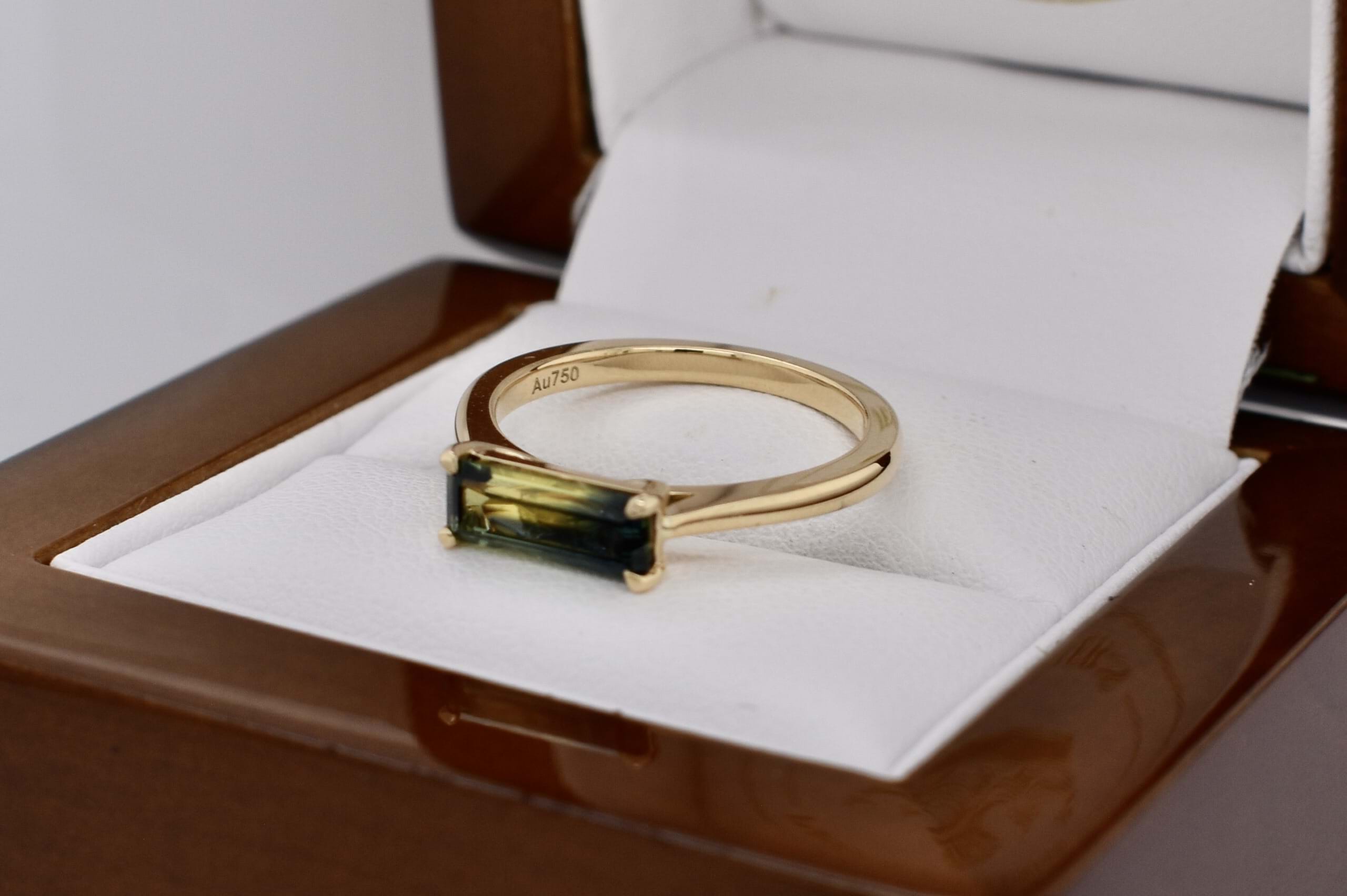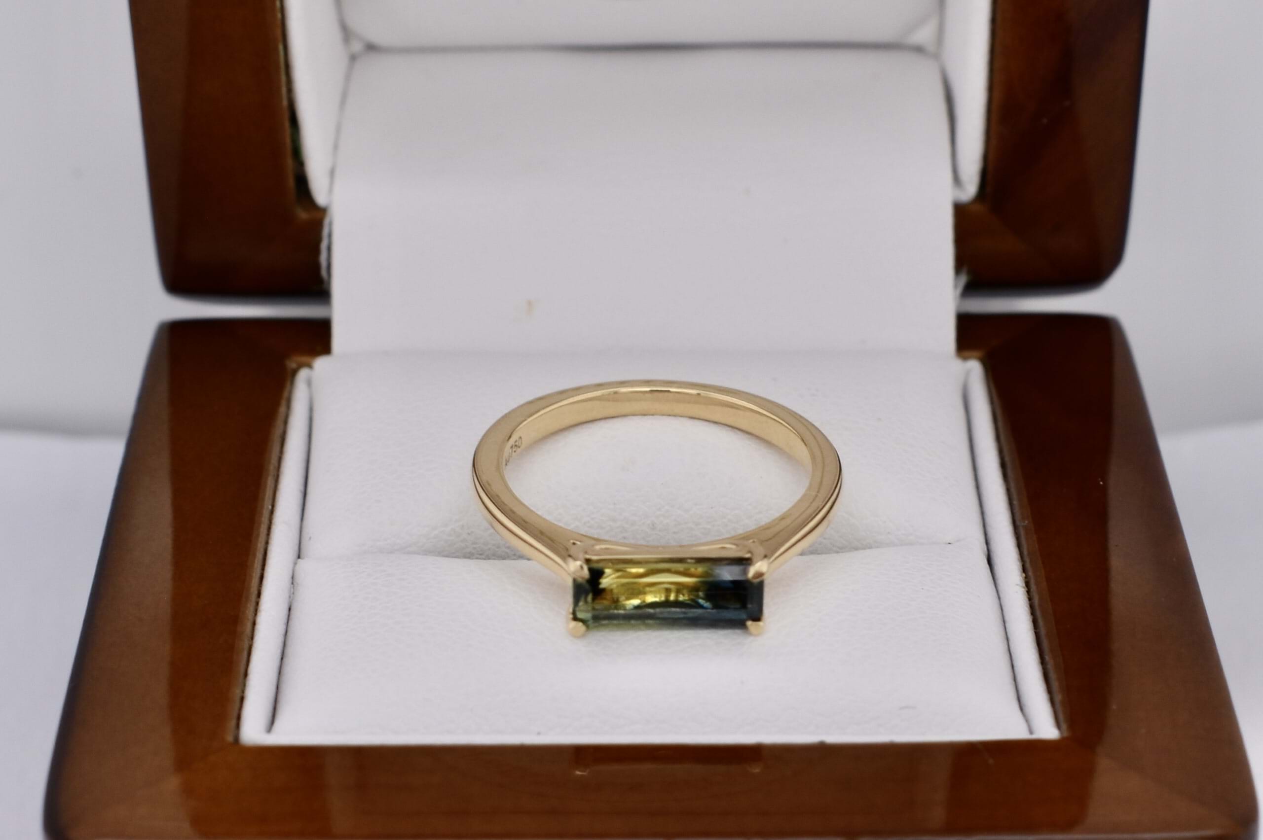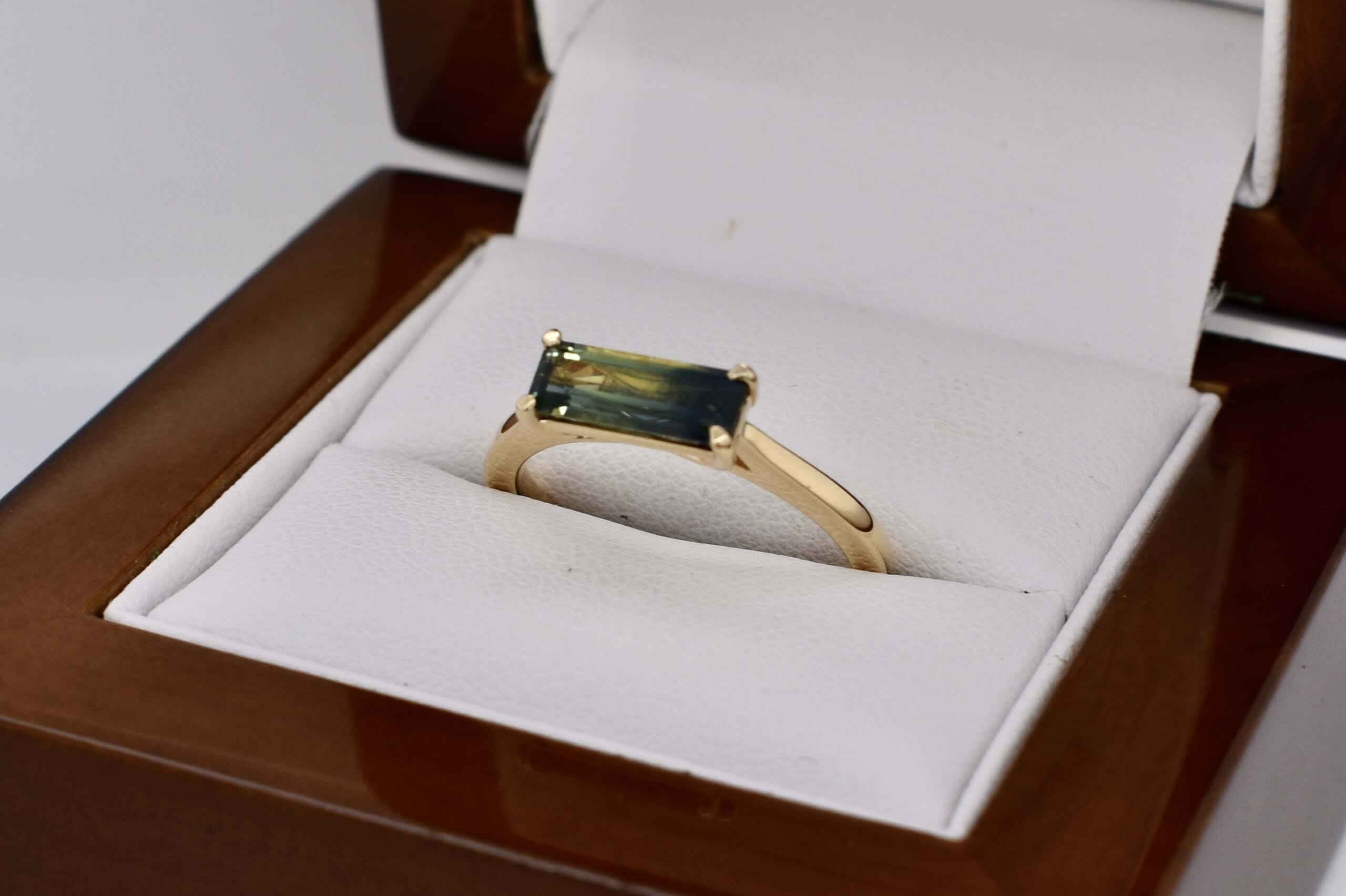 Crafted in 18ct yellow gold, this gorgeous Australian blue, green and yellow parti sapphire of 1.24ct, in an emerald cut four claw set east/west on a tapered half round 1.3-1.8mm band. Sapphire is bi-coloured with a great colour division. Finger size M. Independent Valuation Supplied.