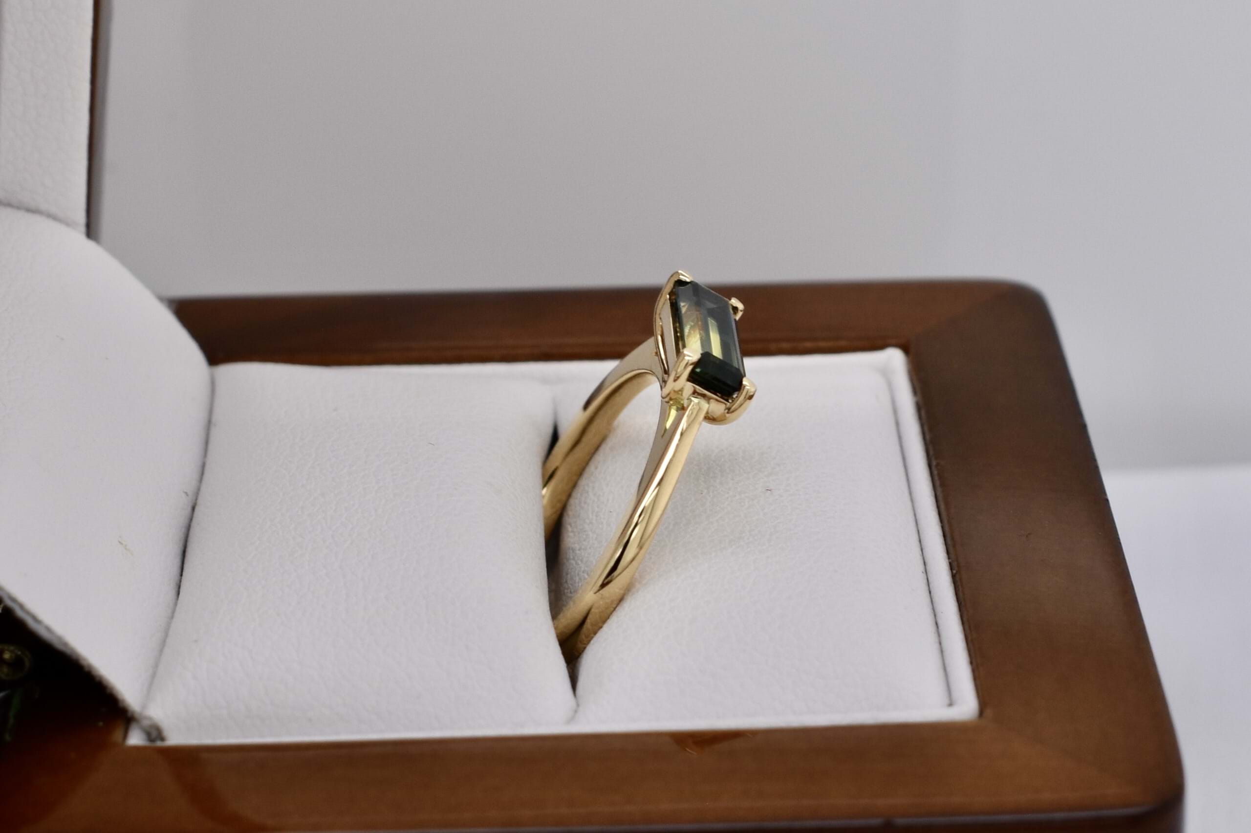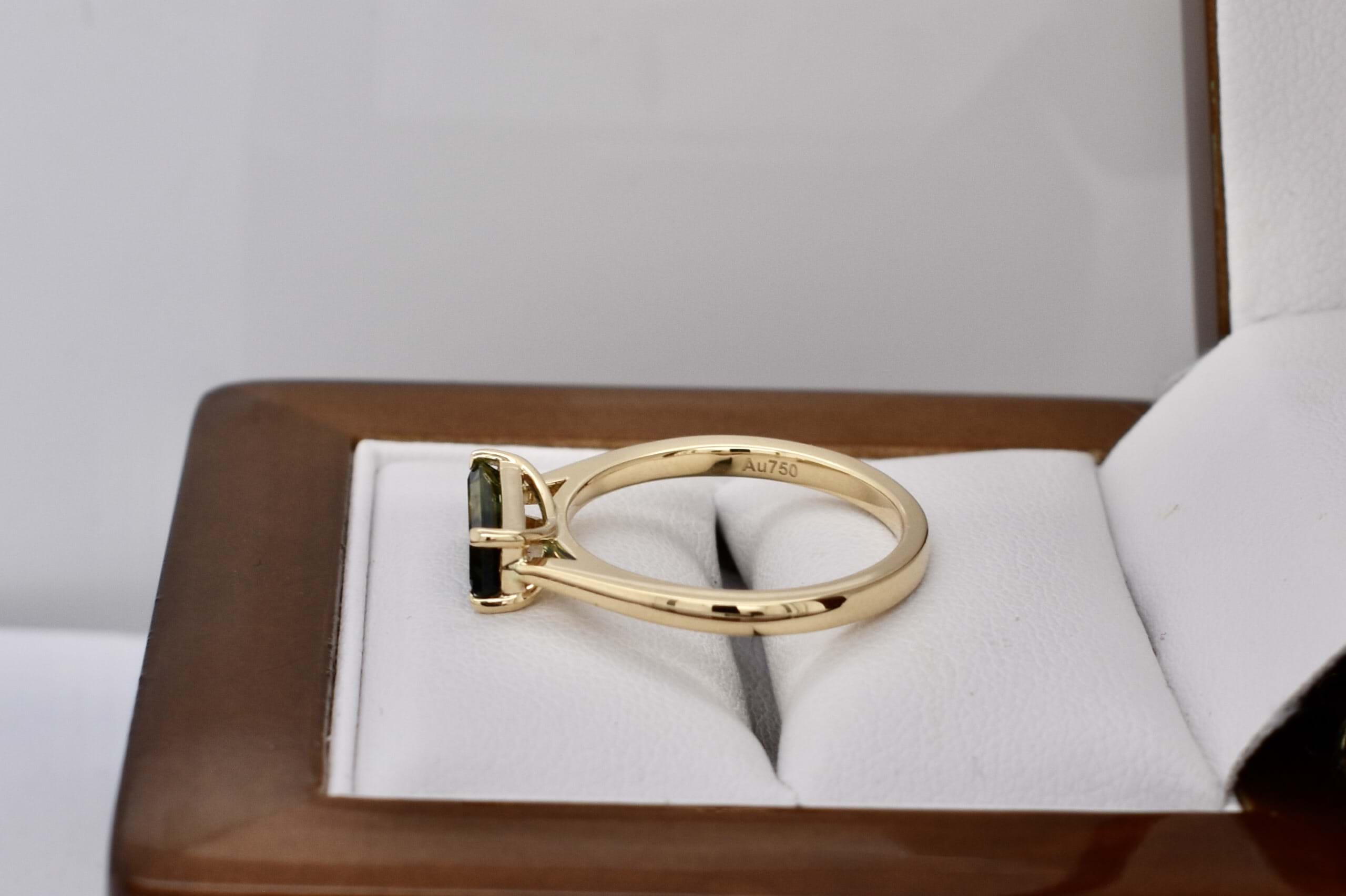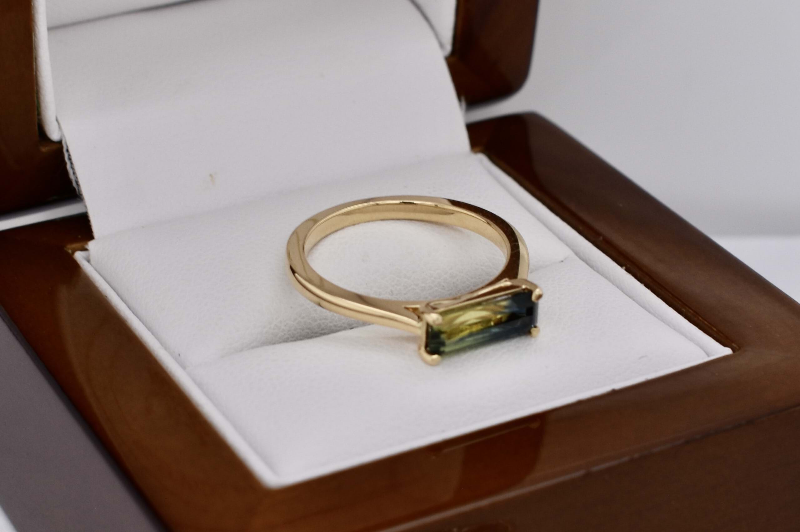 Crafted in 18ct yellow gold, this gorgeous Australian blue, green and yellow parti sapphire of 1.24ct, in an emerald cut four claw set east/west on a tapered half round 1.3-1.8mm band. Sapphire is bi-coloured with a great colour division. Finger size M. Independent Valuation Supplied.
