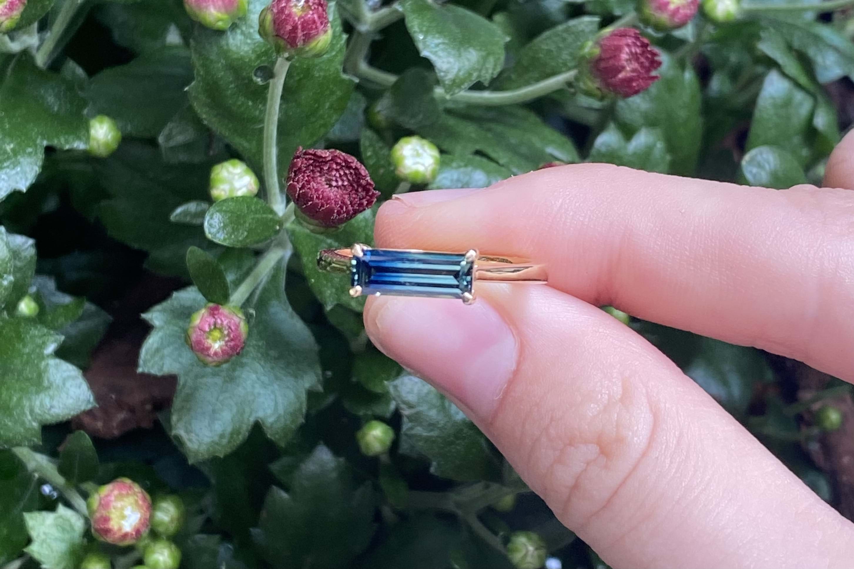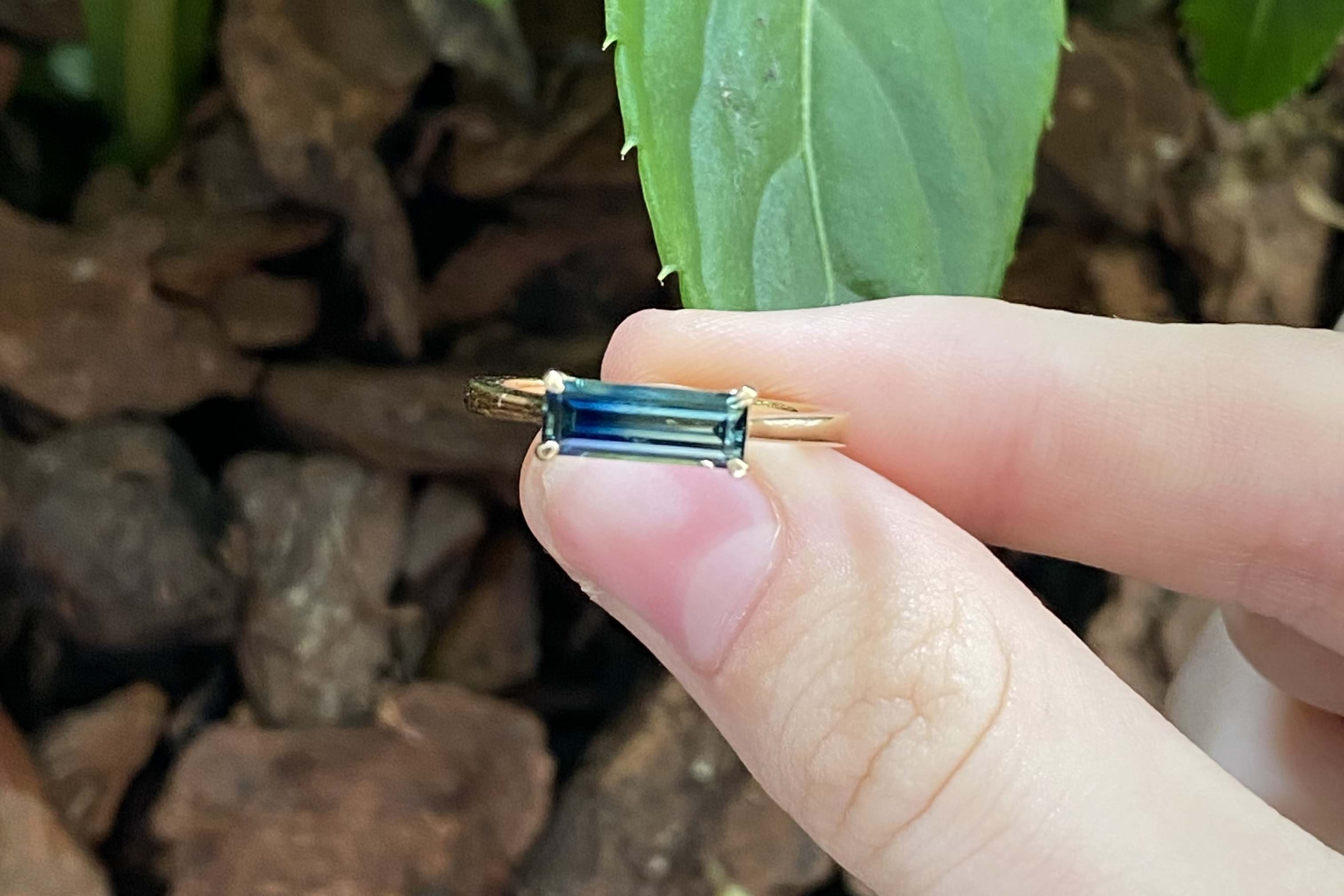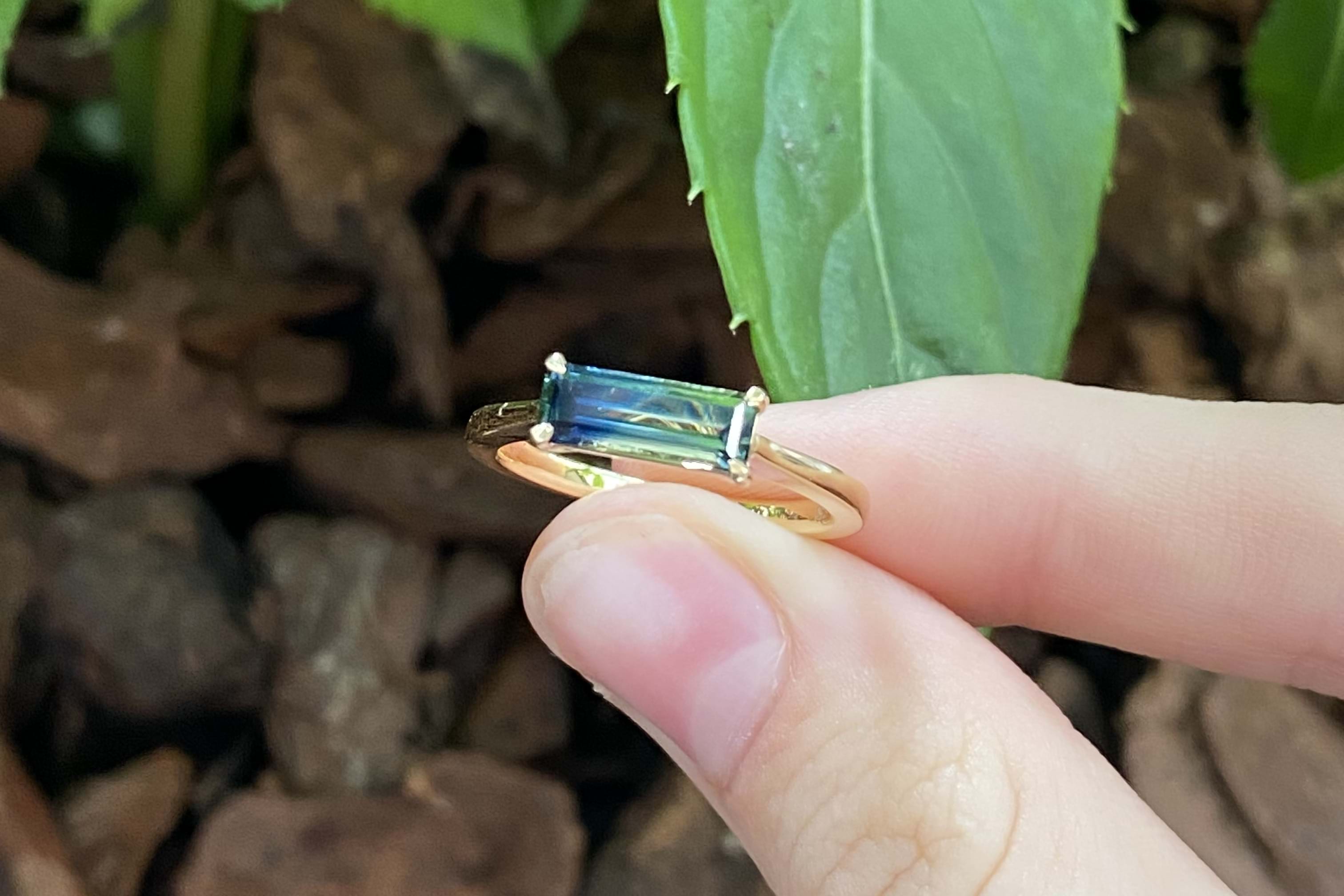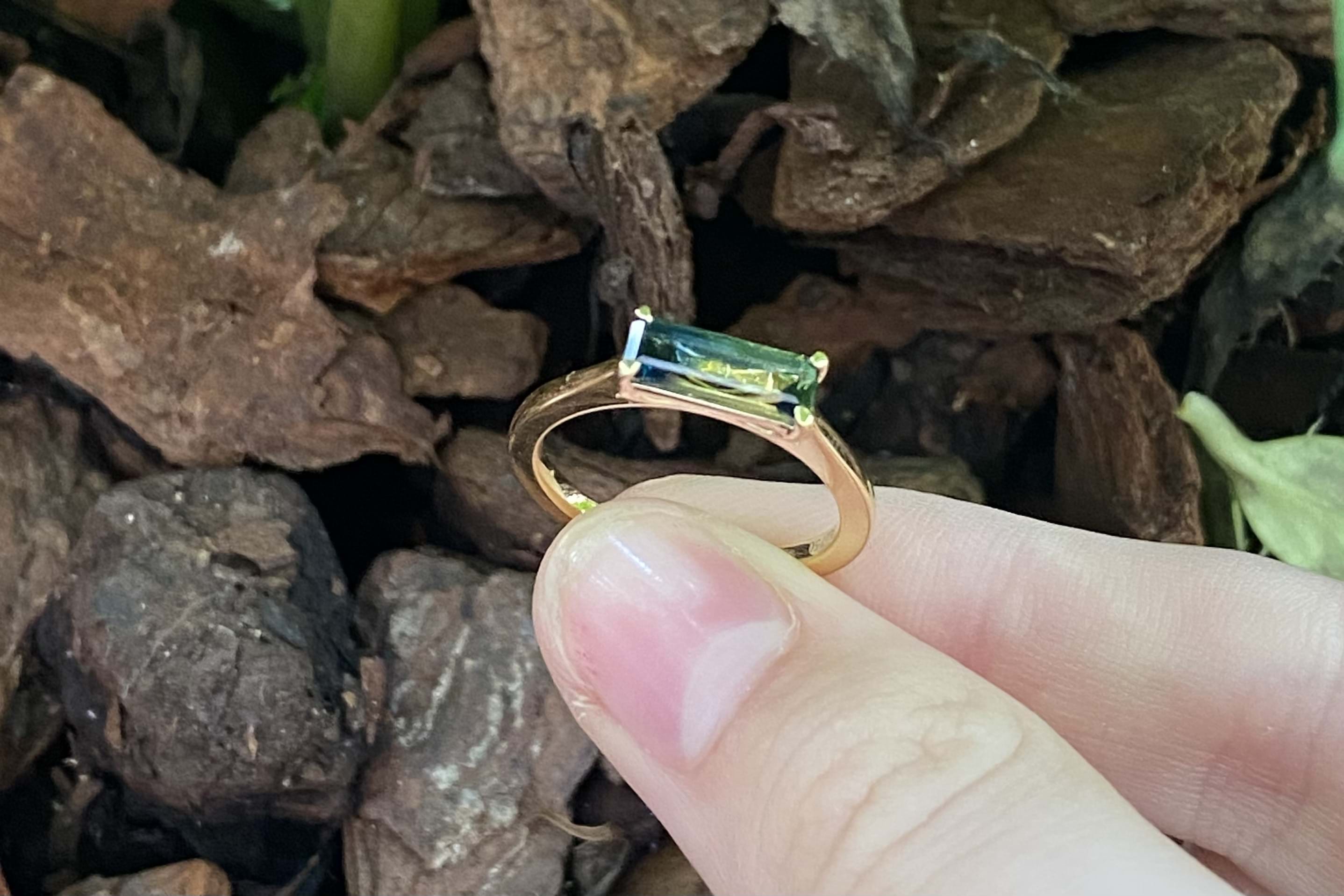 Crafted in 18ct yellow gold, this gorgeous Australian blue, green and yellow parti sapphire of 1.24ct, in an emerald cut four claw set east/west on a tapered half round 1.3-1.8mm band. Sapphire is bi-coloured with a great colour division. Finger size M. Independent Valuation Supplied.