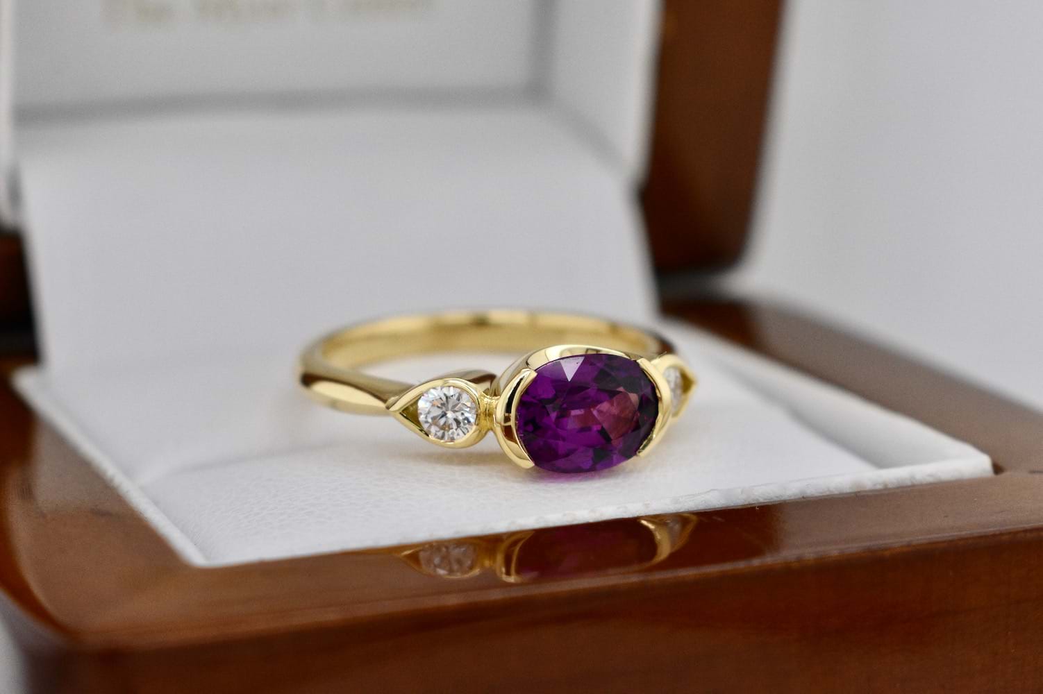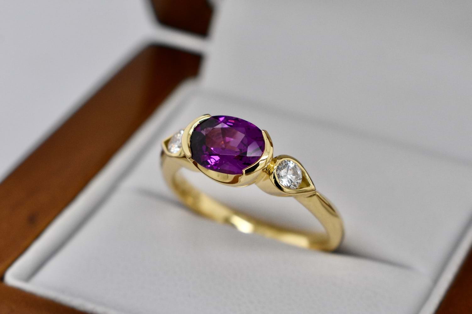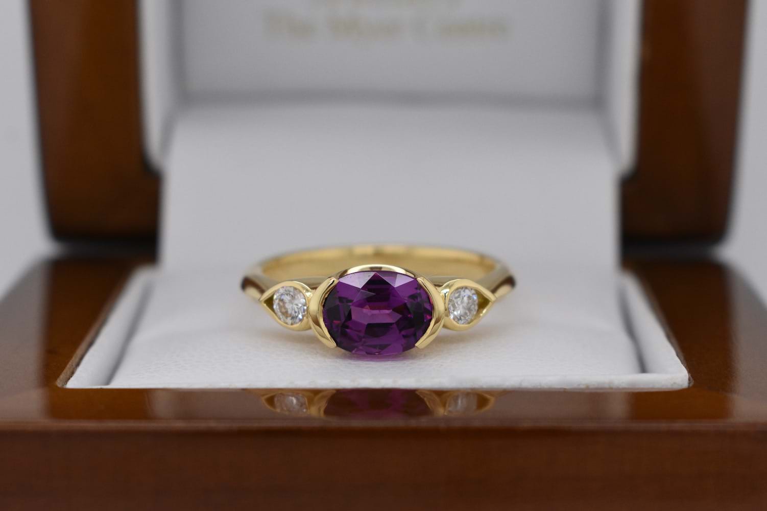 A bright and vivid purple Rhodolite garnet of 1.50cts part rub over set into an 18ct yellow gold East/West design ring. With a round brilliant cut diamond set into a pearshape bezel on each side totalling 0.21cts (D-F VS-SI) this ring looks stunning on its own or paired with diamond bands. Finger size N+. Independent Valuation Supplied
