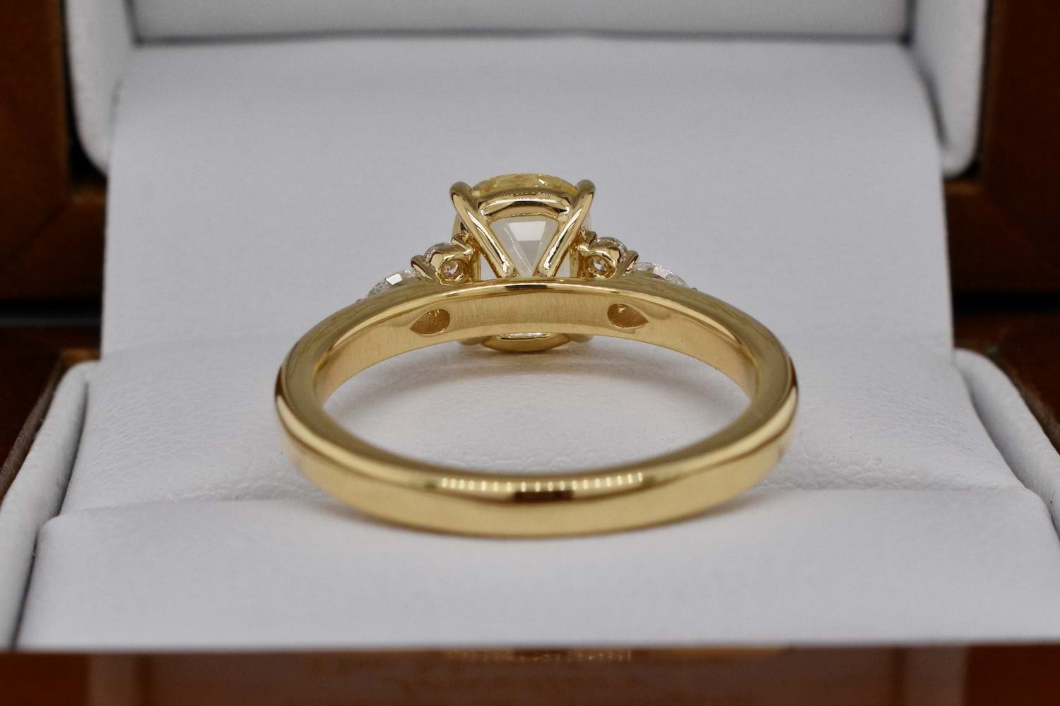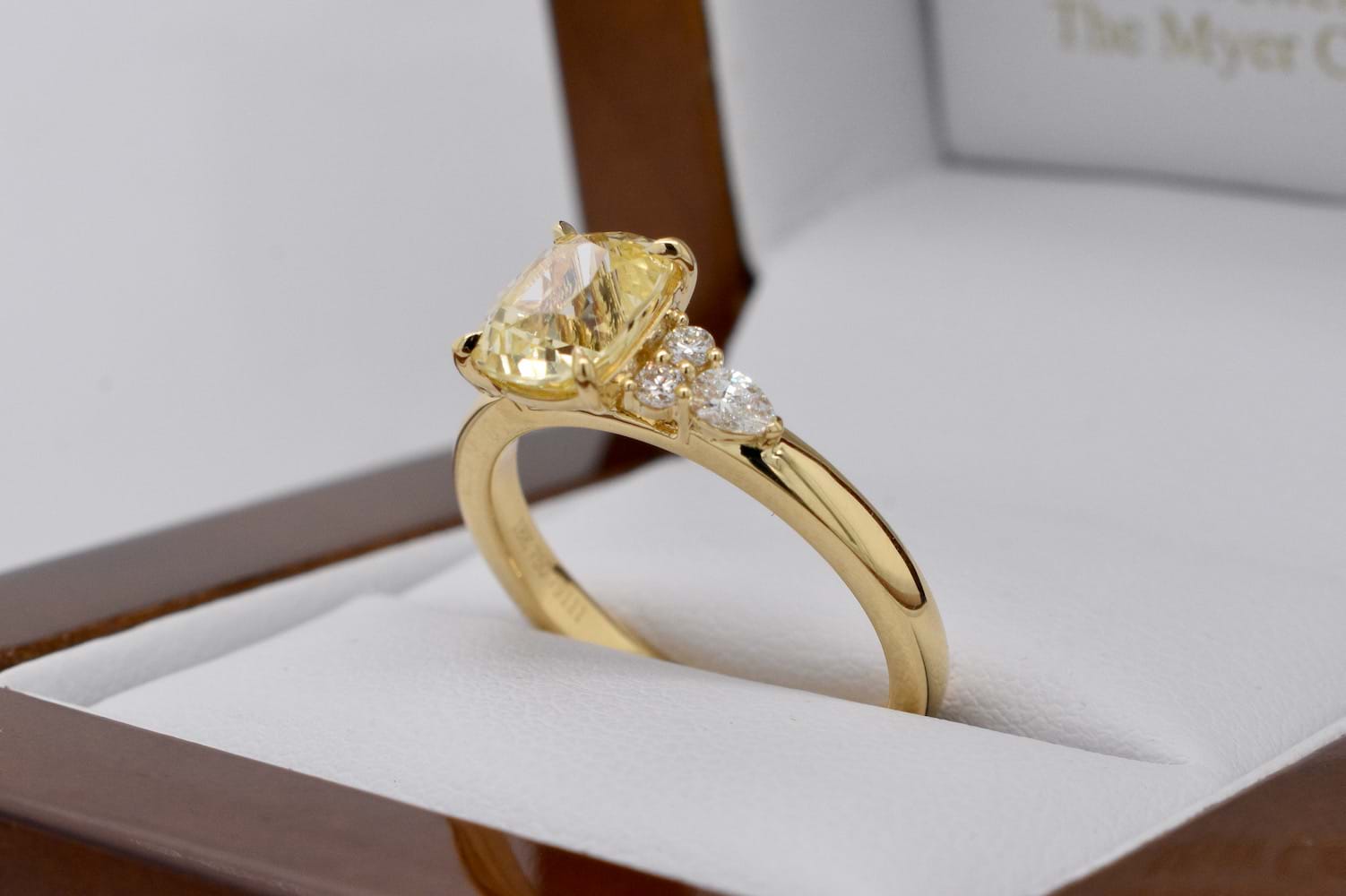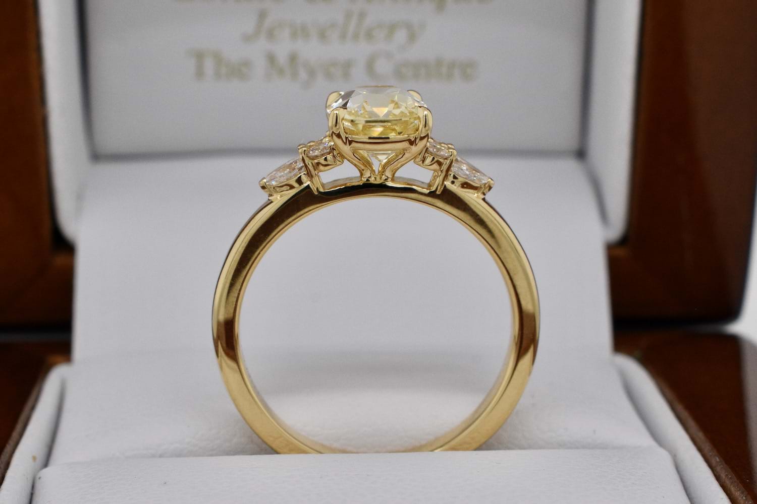 This absolutely stunning 1.76ct bright light yellow sapphire was hand selected in store and has been showcased perfectly in this 18ct yellow gold four claw setting with two round brilliant cut diamonds and a pearshape diamond on each shoulders. The total diamond content equals 0.23cts FG/VS-SI. This ring is beautiful as a dress ring, or will sit perfectly with wedding bands. Finger size M. Independent Valuation Supplied