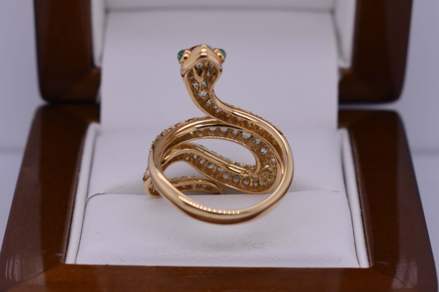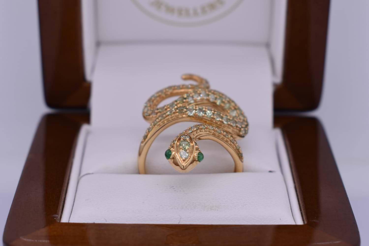 Spectacular snake ring, crafted in 18ct yellow gold and set with 83 bright pale green sapphires, measuring 1.90-1.30mm and totalling 1.98ct. The eyes of the snake are set with two 2.00mm bright mid green cabochon emeralds, set on a half round 2.83mm band. Finger size M+. Independent Valuation Supplied.