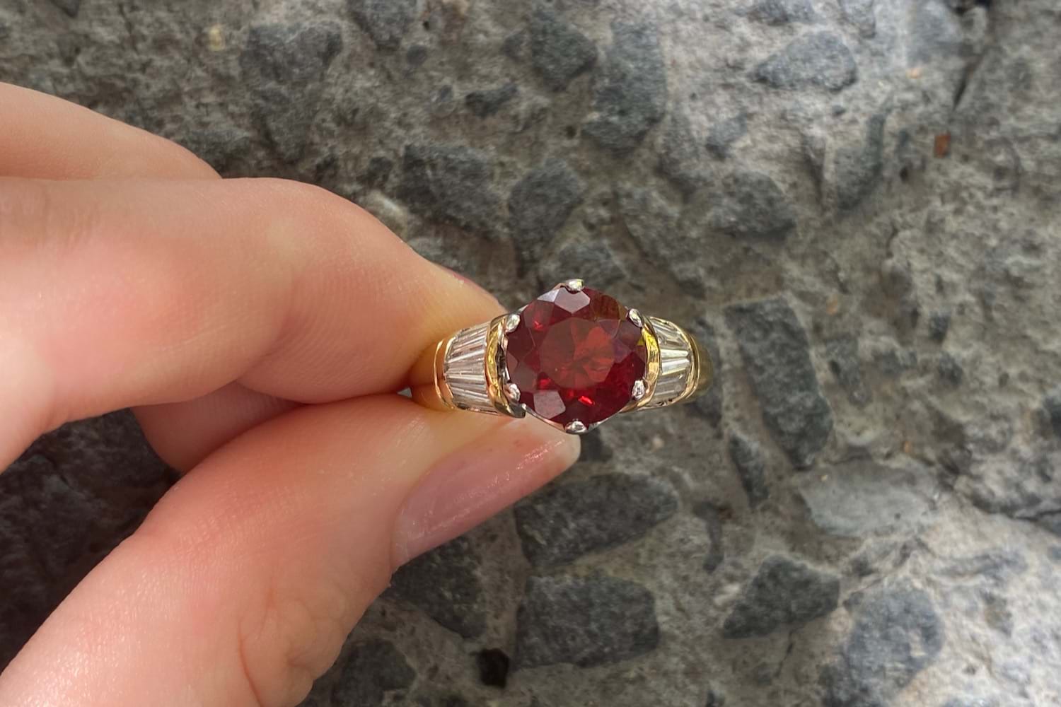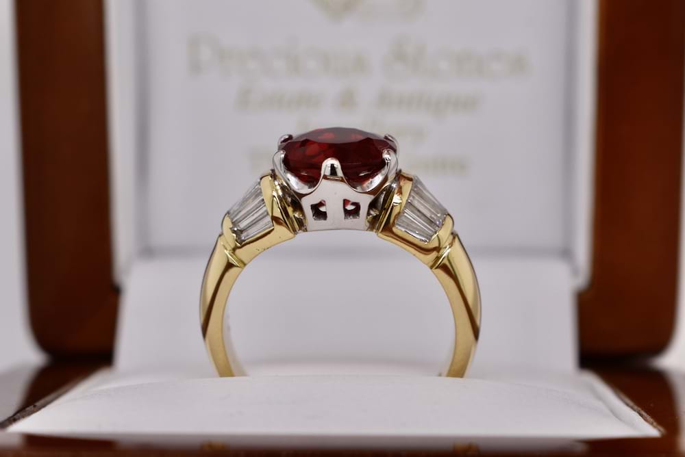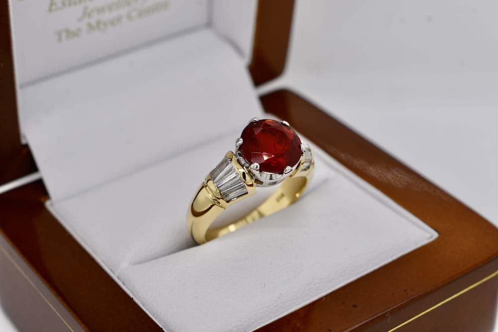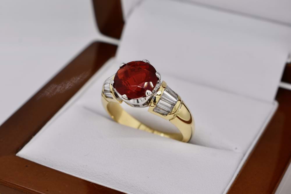 This old school, chunky design, 18ct yellow gold ring features a 2.01ct fire opal (Mexico) six claw set in white gold with shoulders of tapered baguette diamonds totalling 1.00ct (GH/VS). Finger size P+ Independent Valuation Supplied