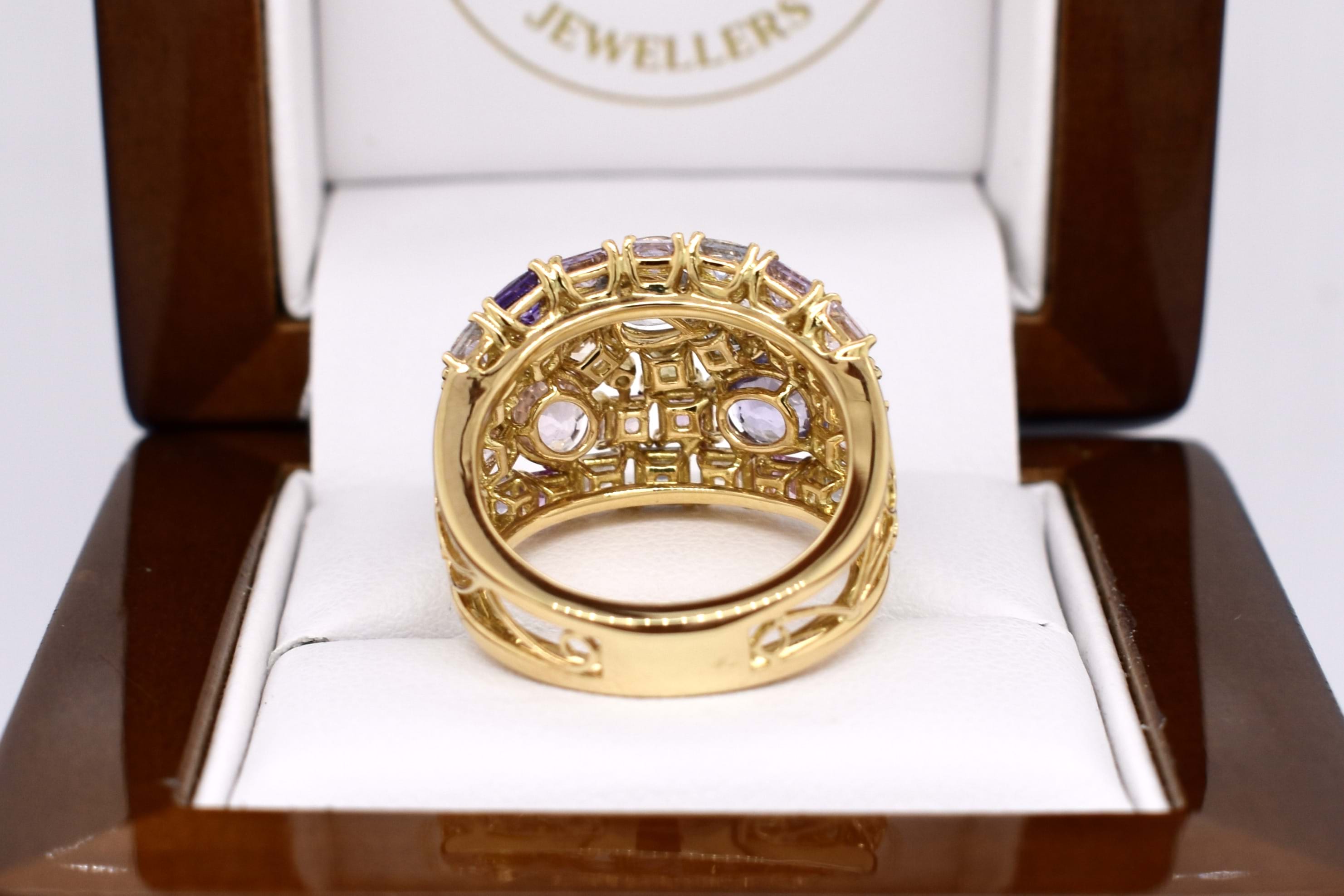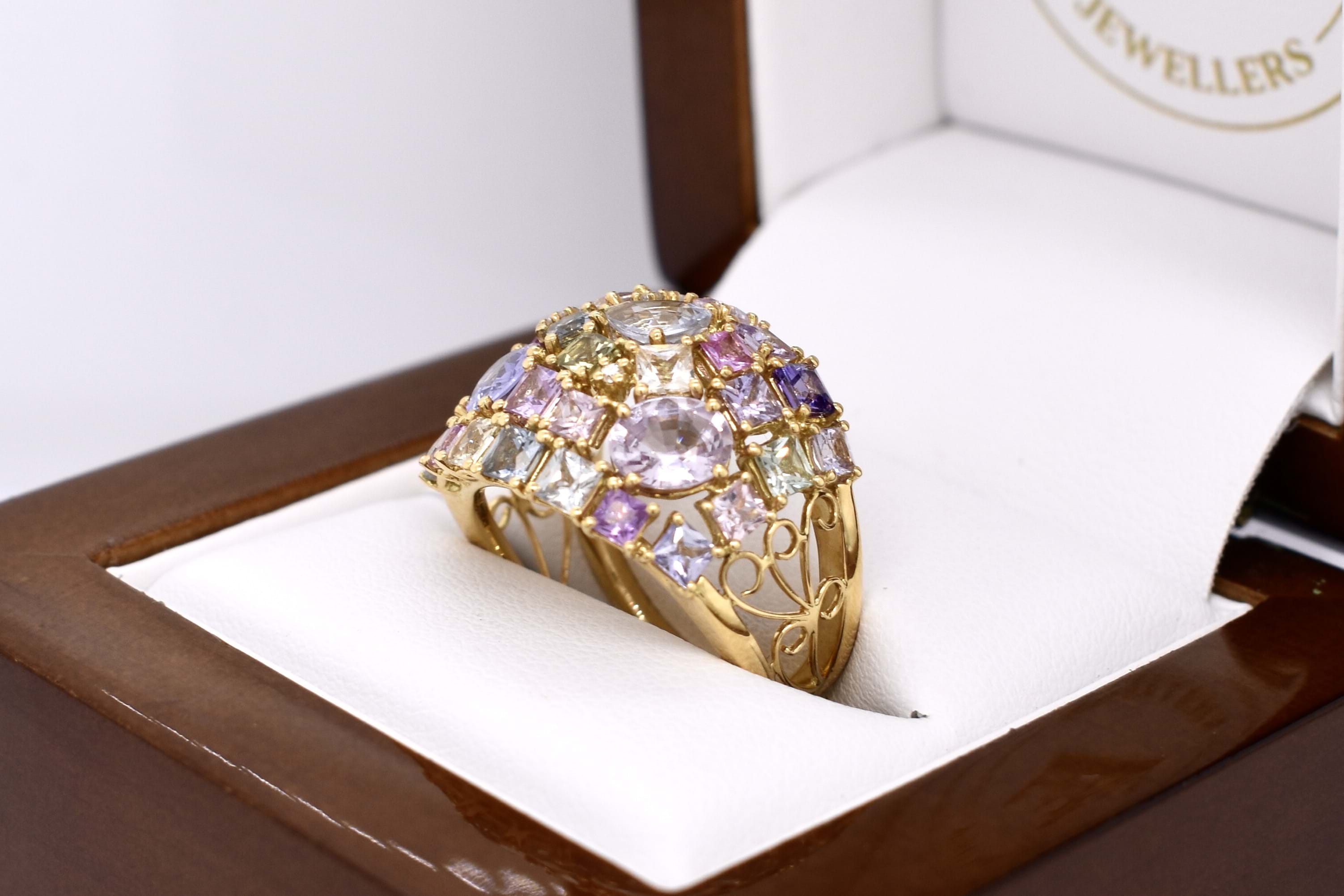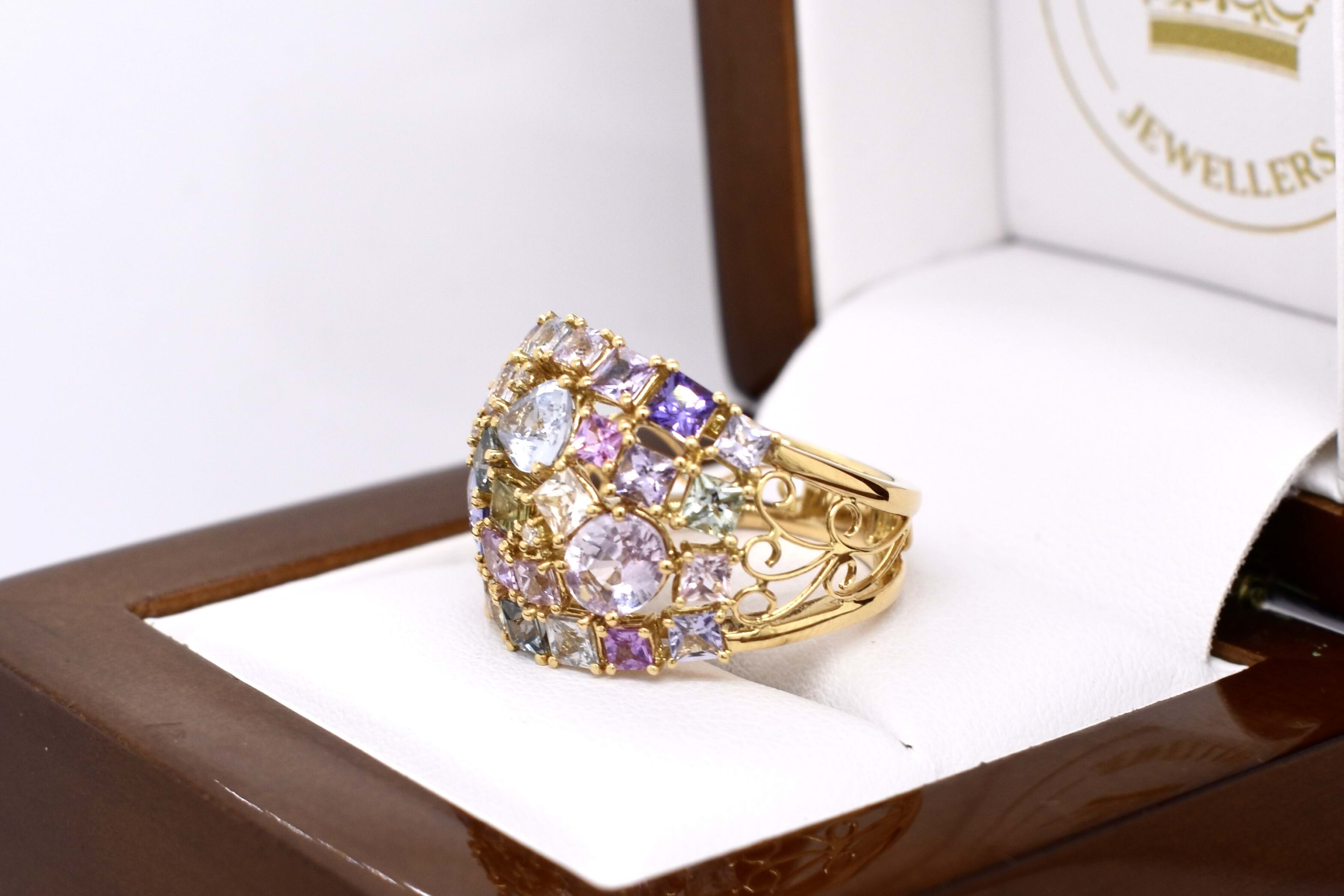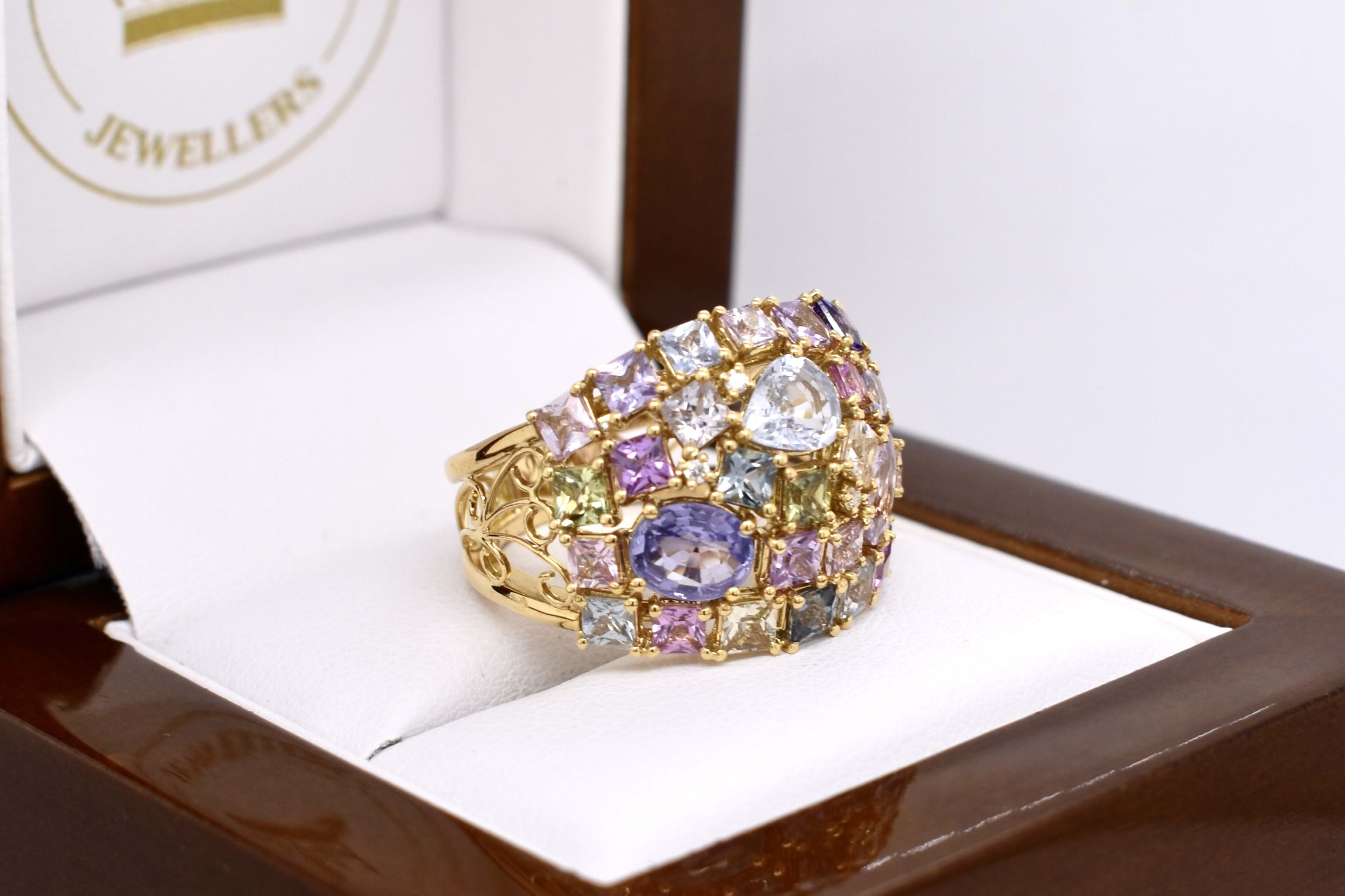 This vibrant and colourful ring features an array of multi-coloured sapphires, in different shaped and sizes claw set in a wide cluster design. Contains a total of 30 sapphires totalling 5.25ct including blue, yellow, pink, green and purple. Also set with 3 round brilliant cut diamonds scattered throughout, 0.02ct FG SI. Completed on a wide 18ct yellow gold band. Finger size M. Independent Valuation available upon purchase.