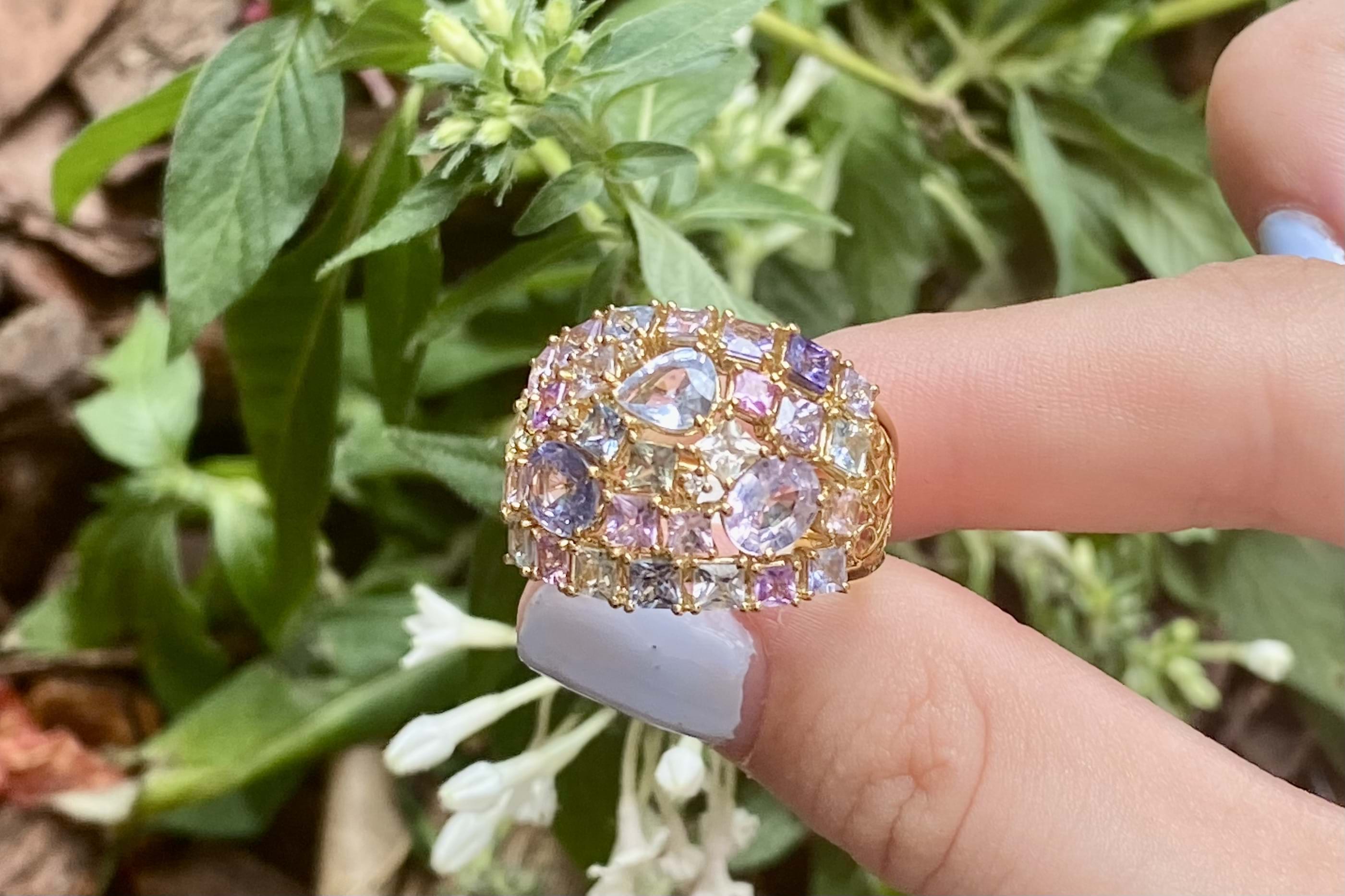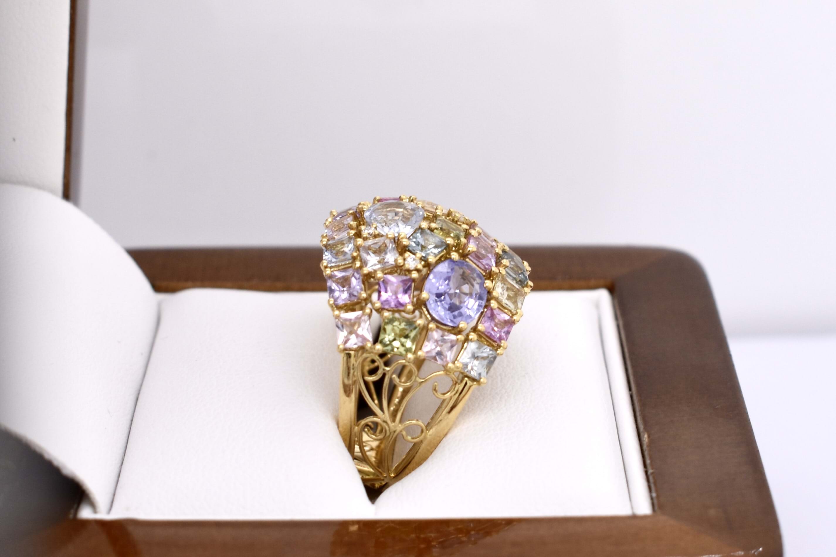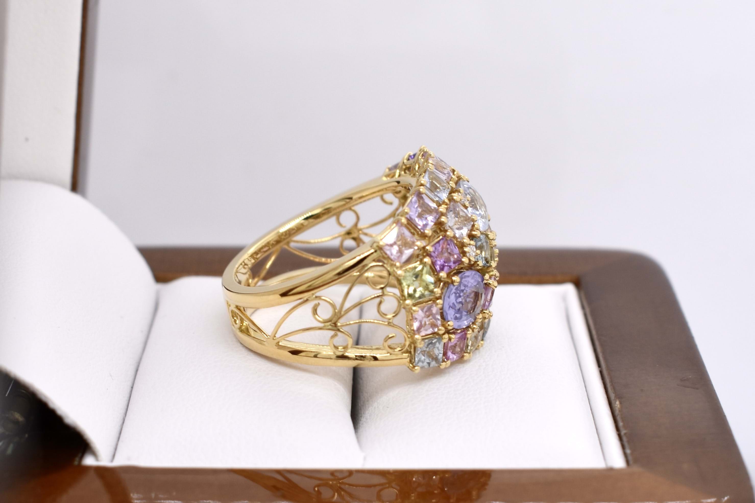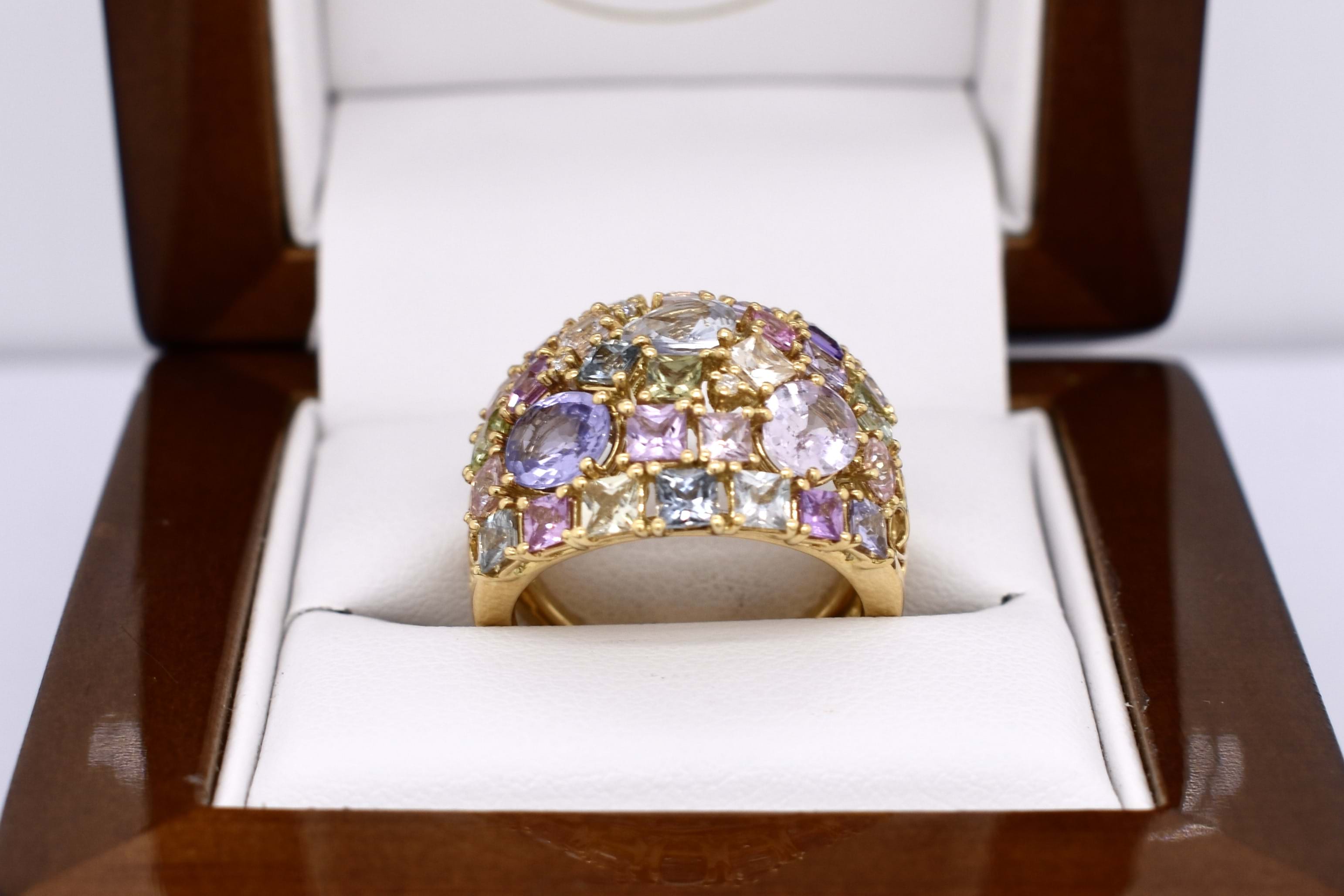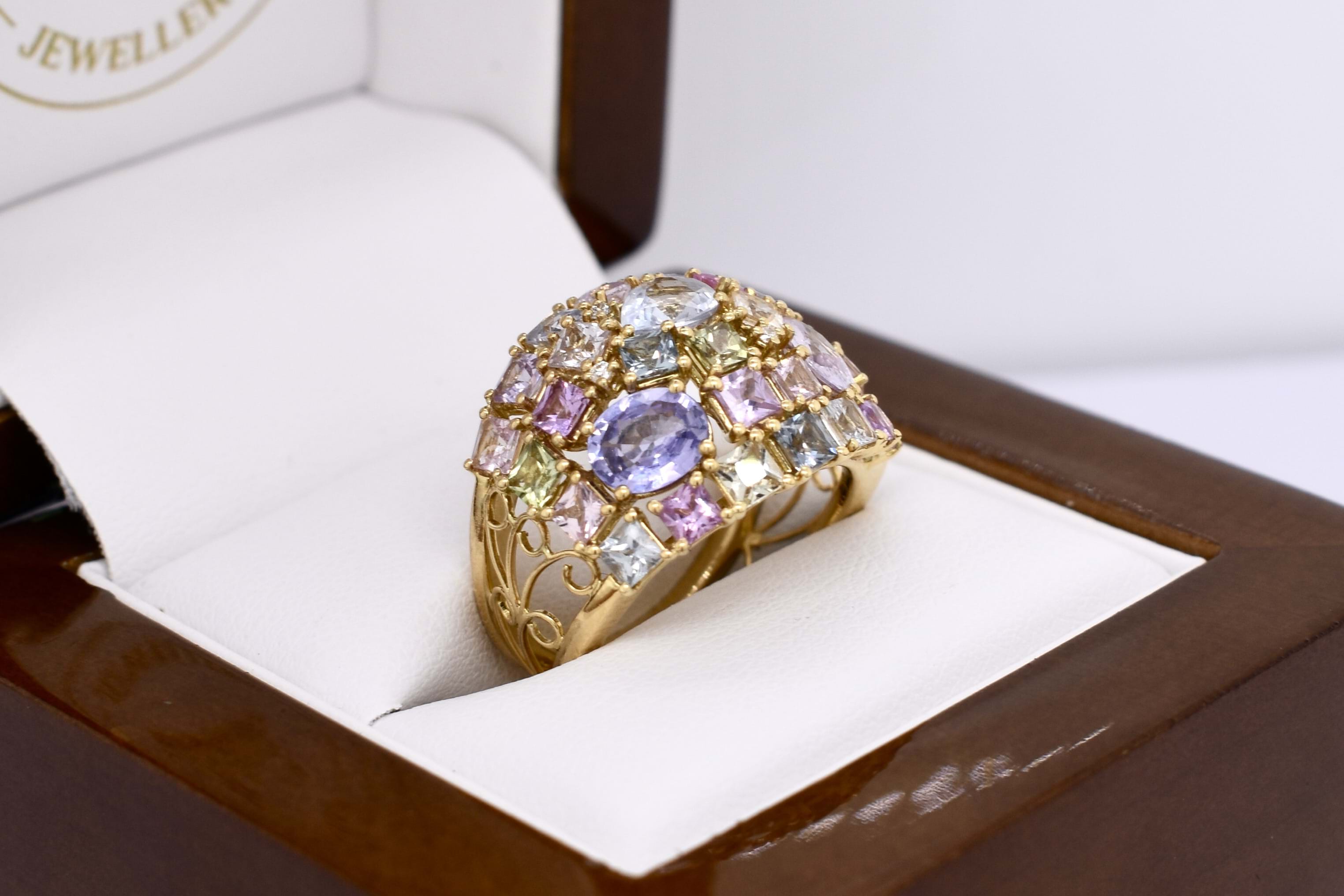 This vibrant and colourful ring features an array of multi-coloured sapphires, in different shaped and sizes claw set in a wide cluster design. Contains a total of 30 sapphires totalling 5.25ct including blue, yellow, pink, green and purple. Also set with 3 round brilliant cut diamonds scattered throughout, 0.02ct FG SI. Completed on a wide 18ct yellow gold band. Finger size M. Independent Valuation available upon purchase.