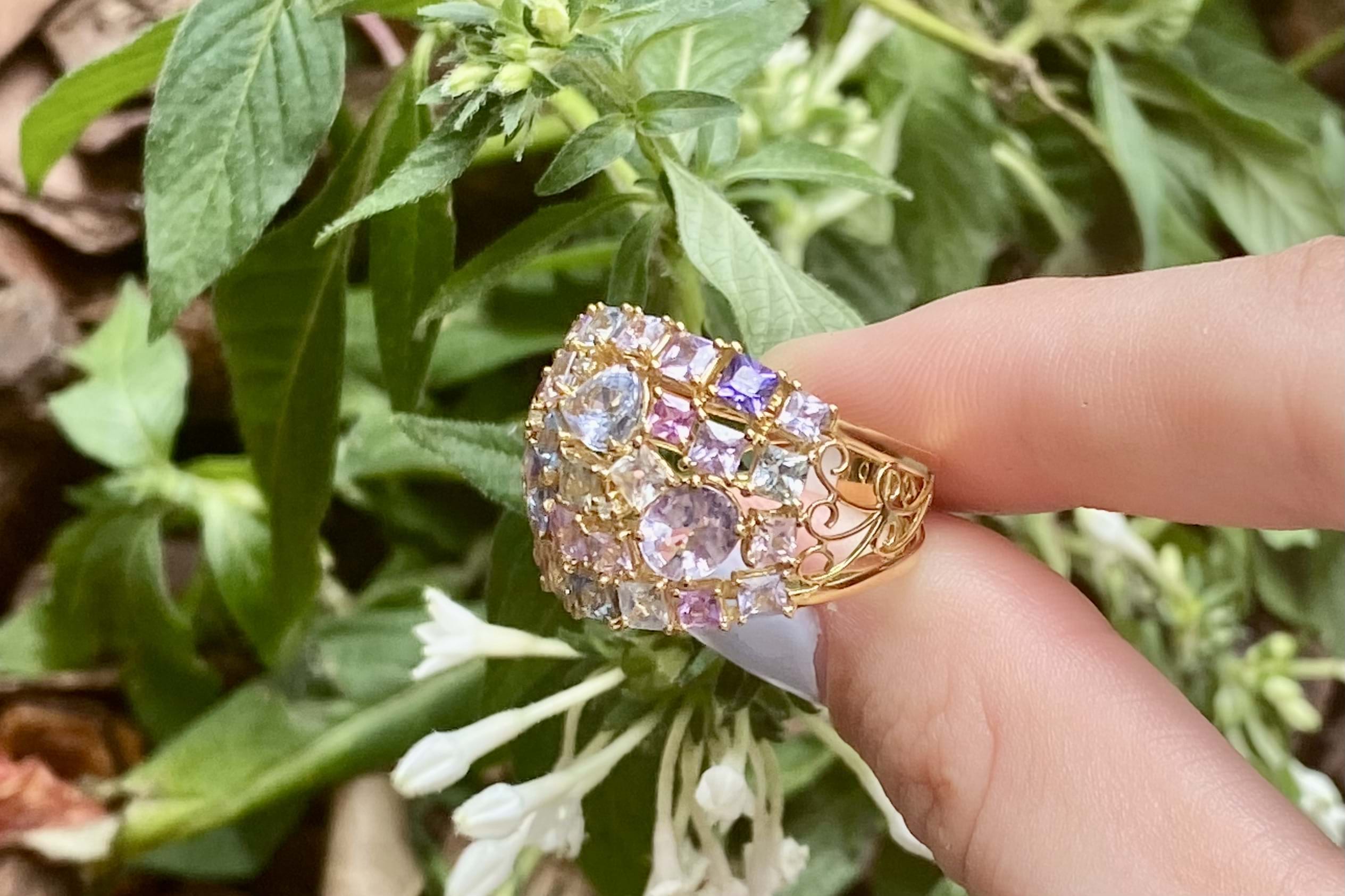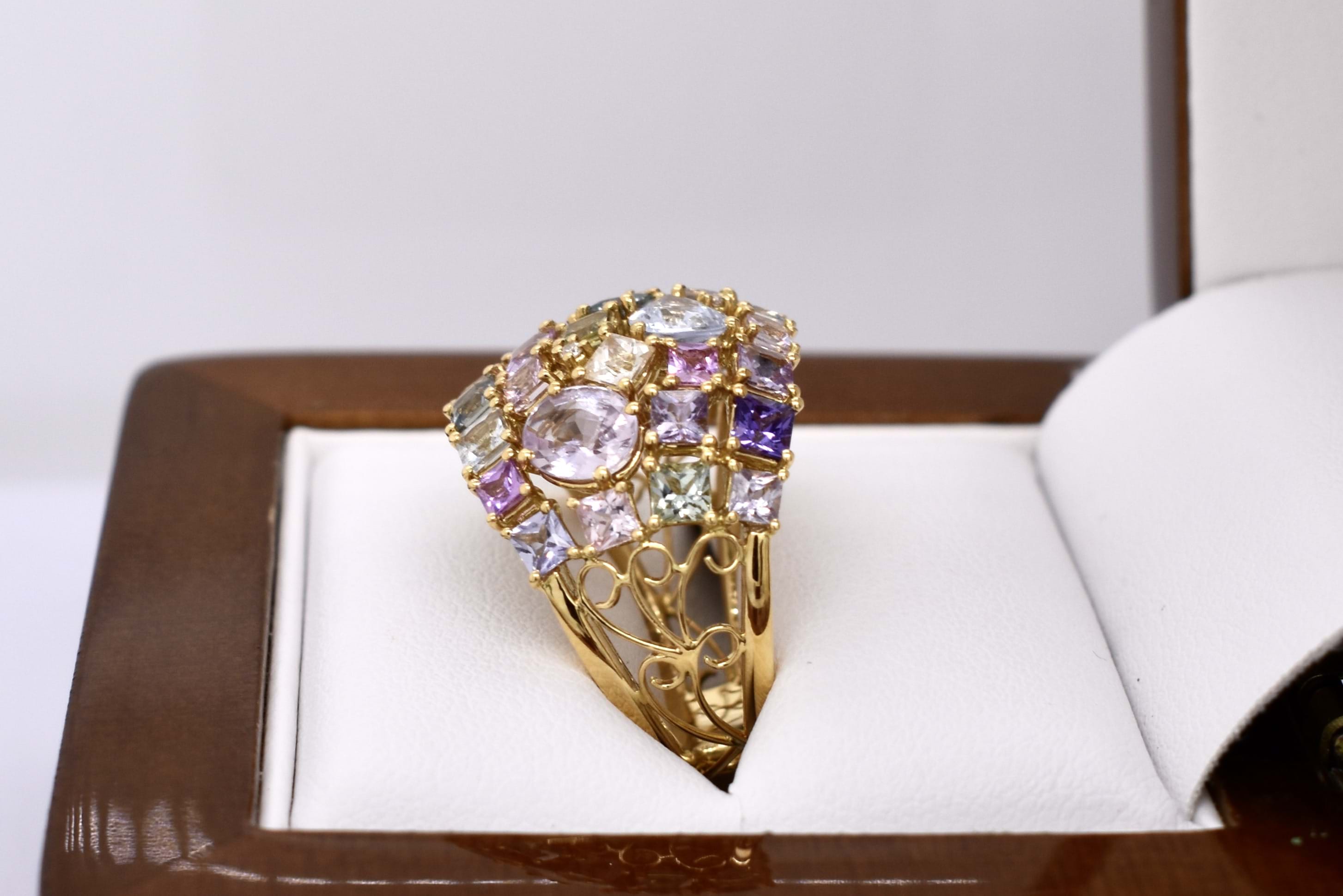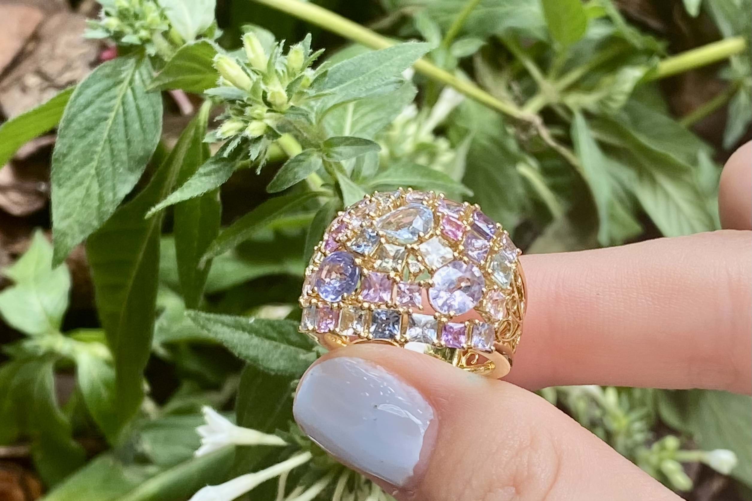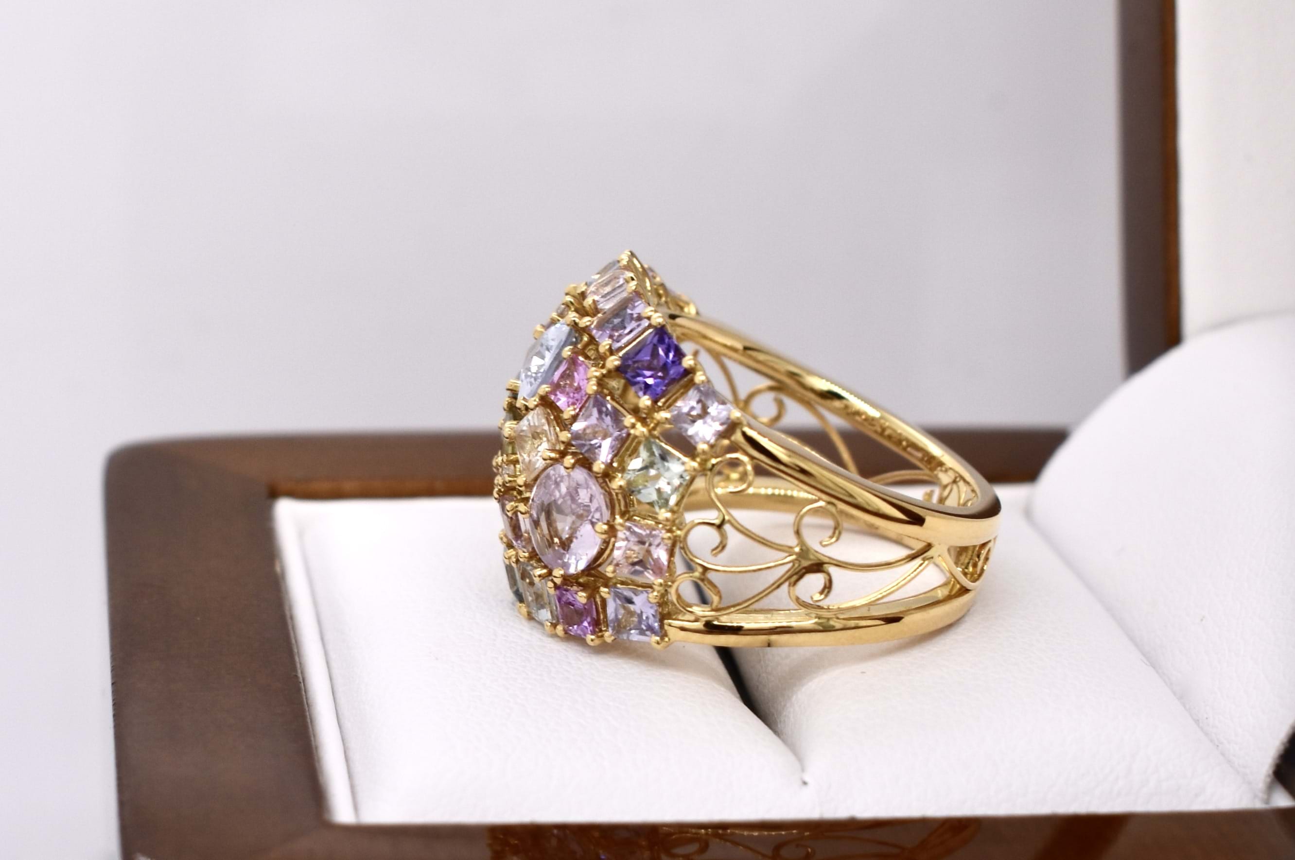 This vibrant and colourful ring features an array of multi-coloured sapphires, in different shaped and sizes claw set in a wide cluster design. Contains a total of 30 sapphires totalling 5.25ct including blue, yellow, pink, green and purple. Also set with 3 round brilliant cut diamonds scattered throughout, 0.02ct FG SI. Completed on a wide 18ct yellow gold band. Finger size M. Independent Valuation available upon purchase.