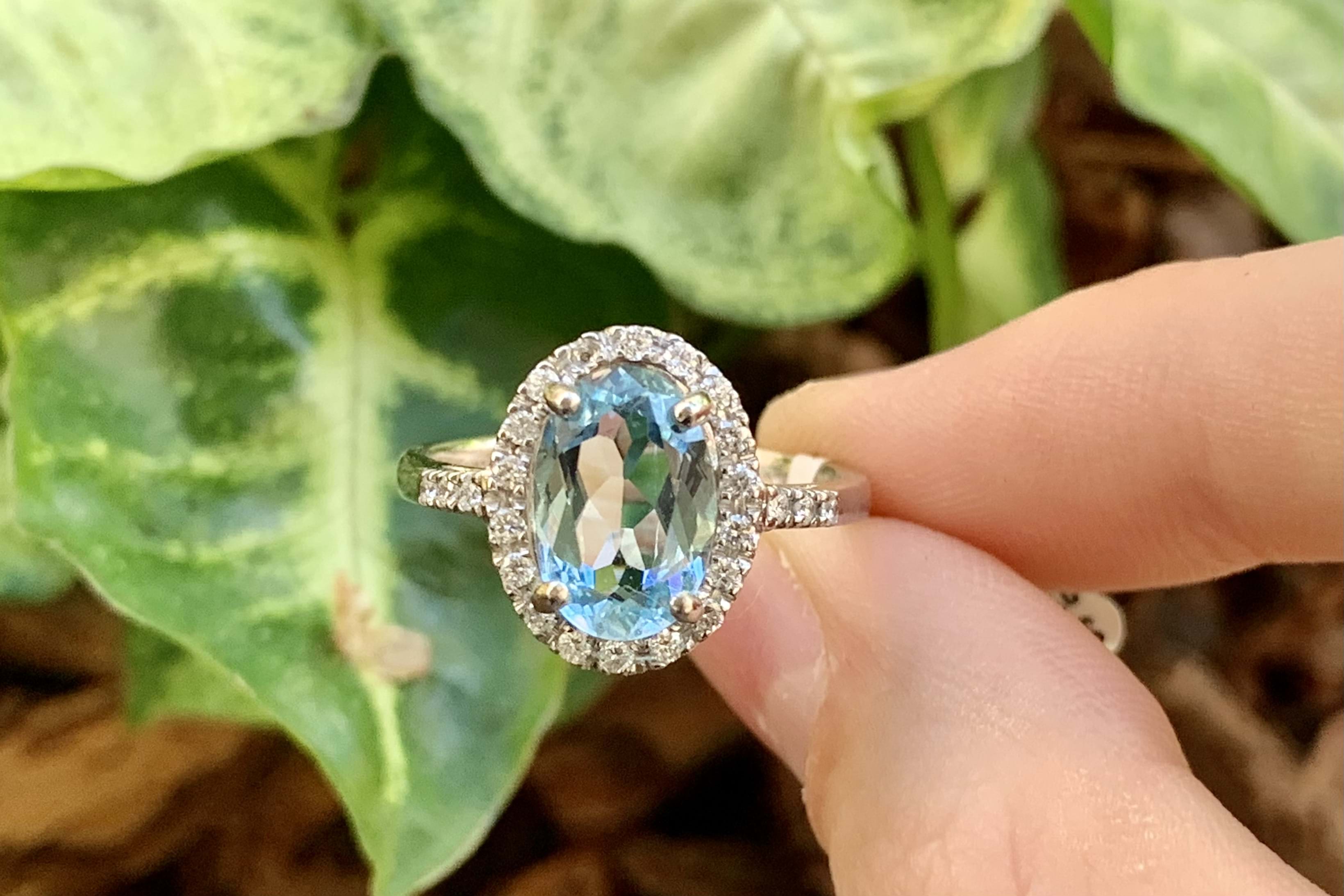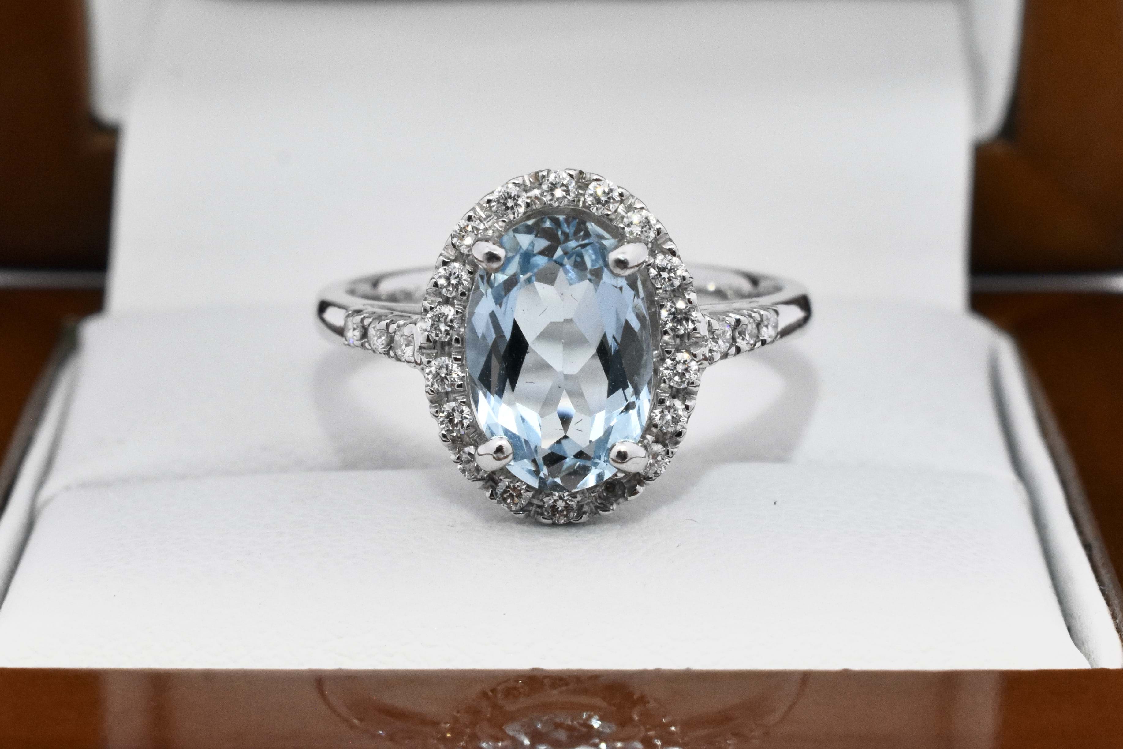 This pretty and feminine 9ct white gold dress ring features a beautiful 1.92ct oval aquamarine four claw set in the centre of a shimmering diamond halo with diamonds continuing down the shoulders. Total diamond content equals 0.22cts G/VS-SI. Finger size N+