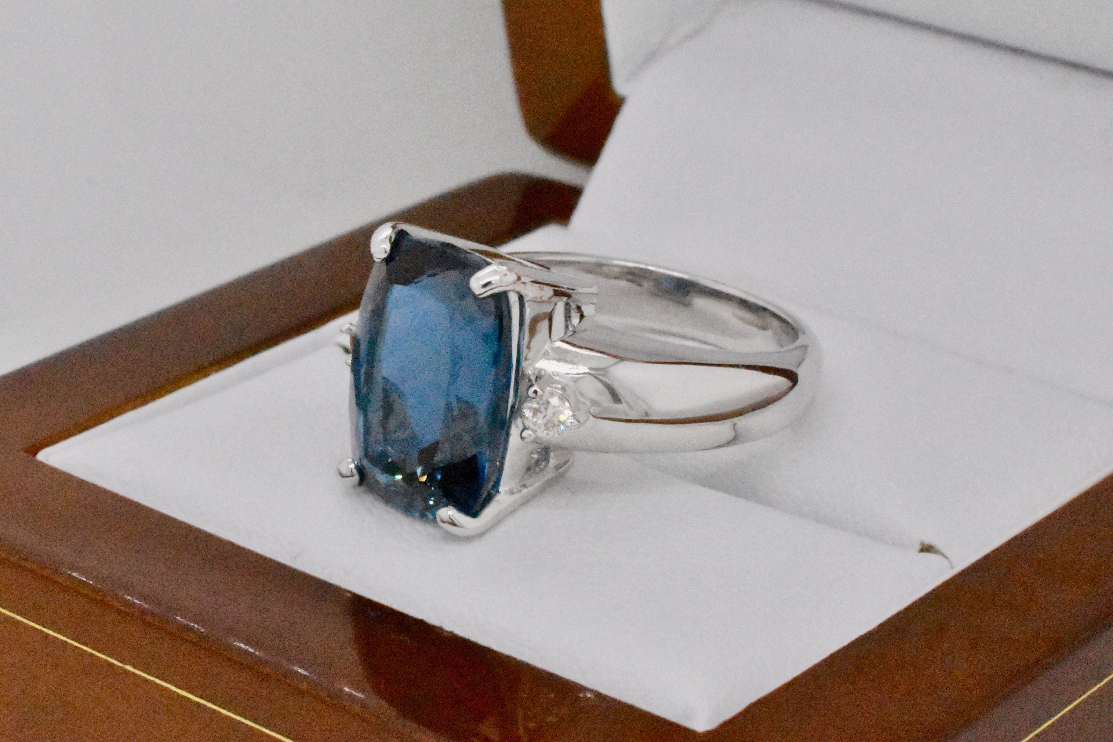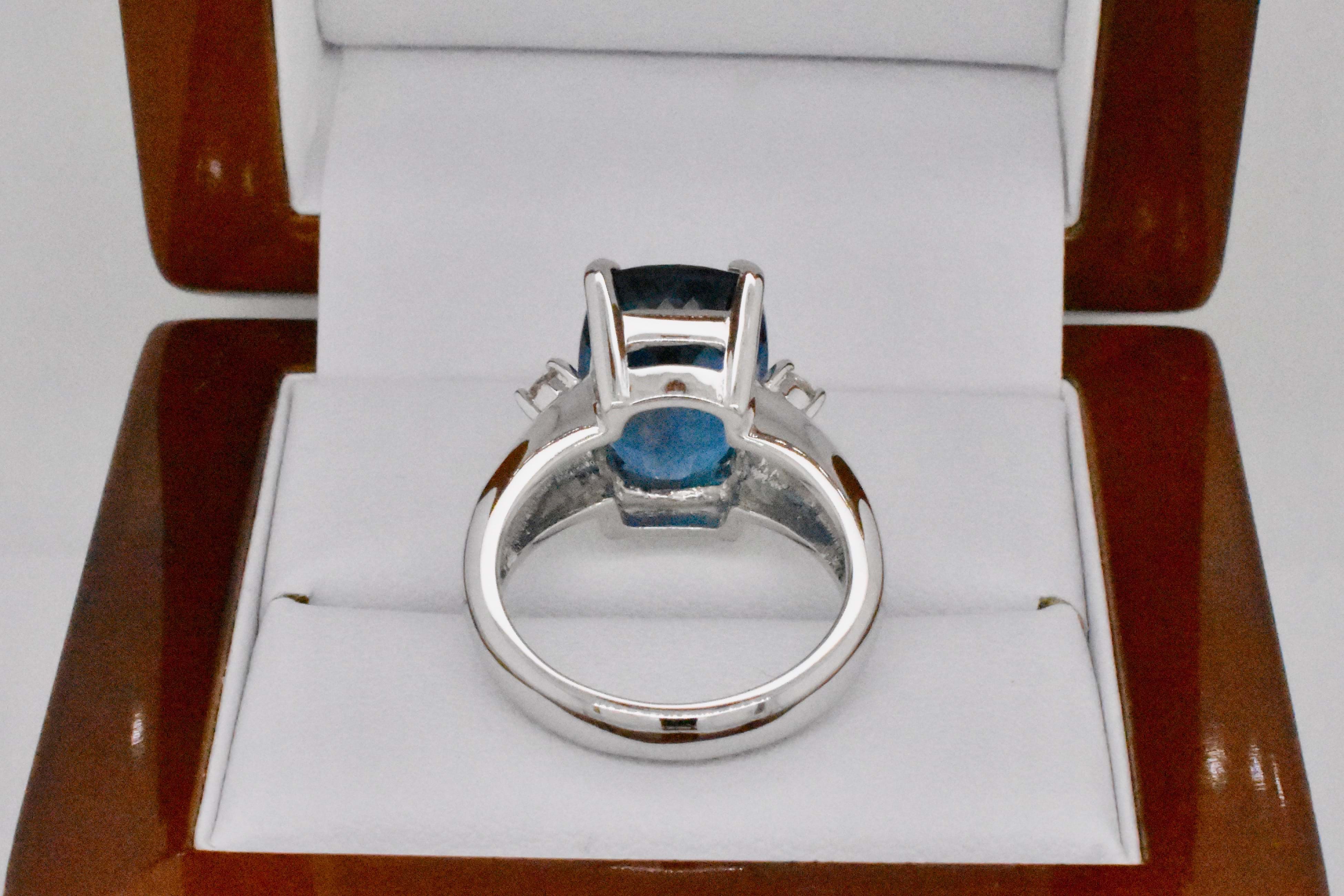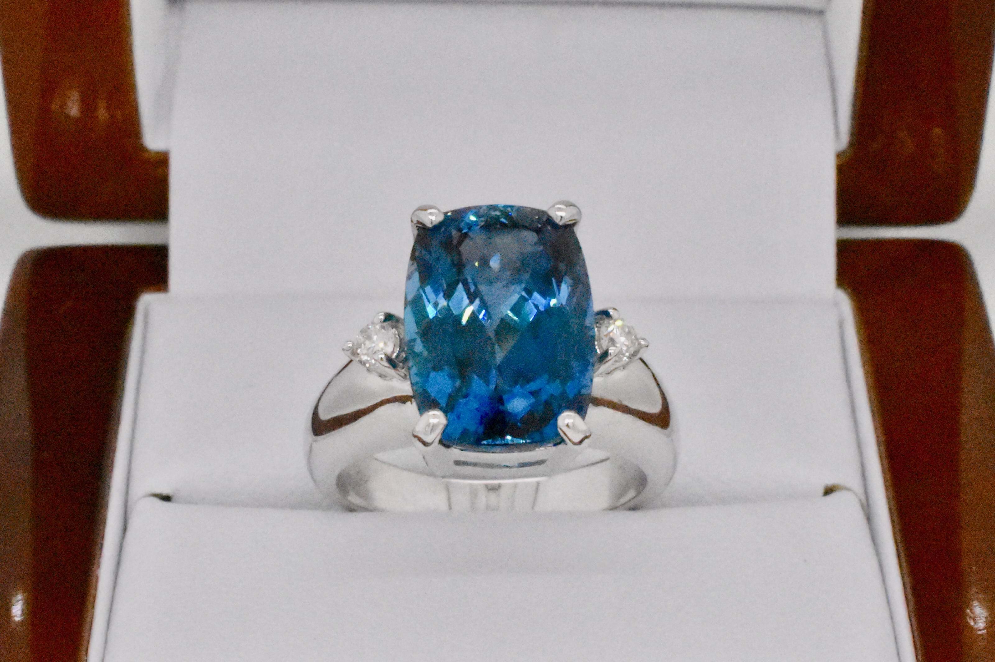 This beautifully faceted long cushion shape London blue topaz is an impressive 9.16cts and has been four claw set in 9ct white gold with a complimenting 0.05ct (H/SI) round brilliant cut diamond on each side and a wide dome band. Independent Valuation Supplied