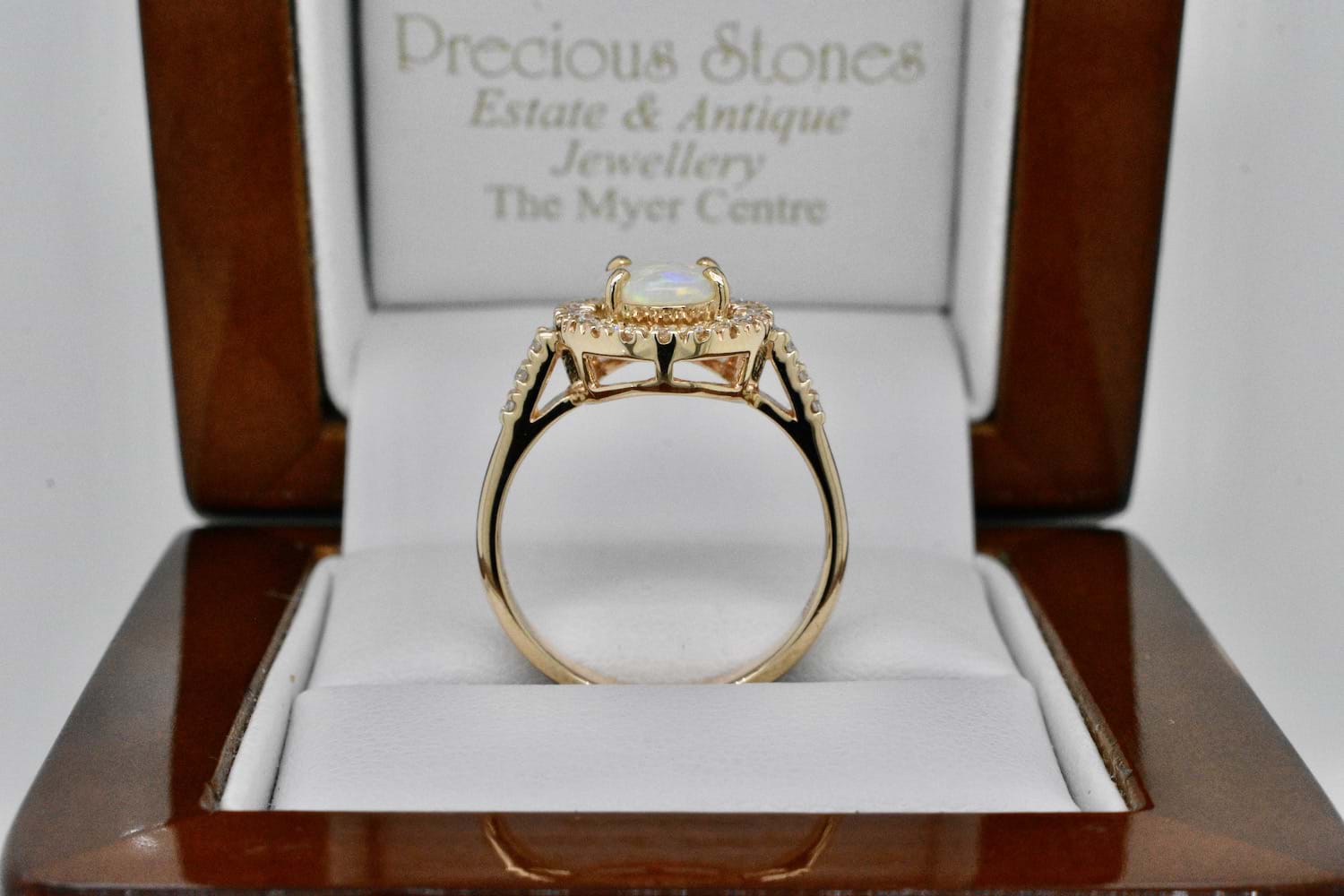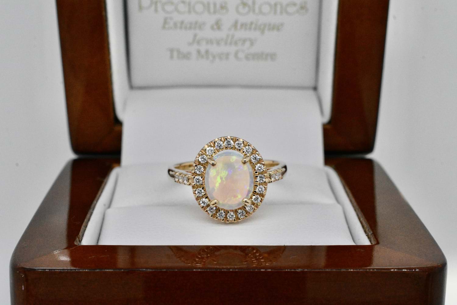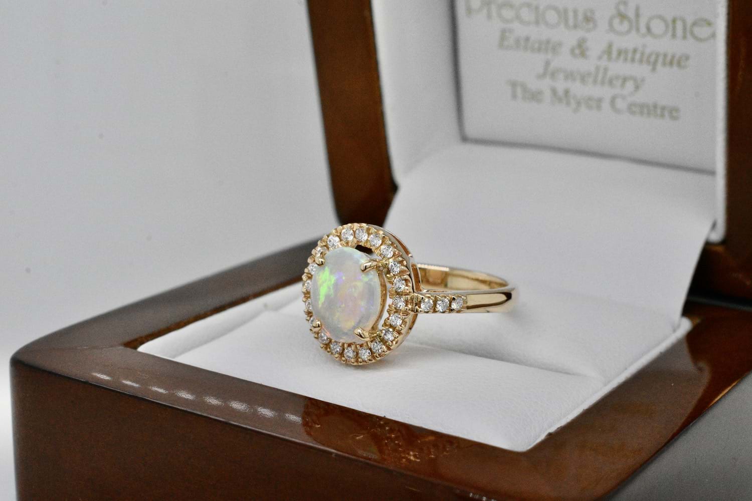 A gorgeous, solid white crystal opal from Coober Pedy of 0.72cts displaying brilliant blue and green flashes set into a 9ct yellow gold diamond halo ring with a small complement of diamonds down the shoulders. Total diamond content is 26 white, sparkly round brilliant cuts totalling 0.23cts G/SI. Finger size M+. Independent Valuation Supplied